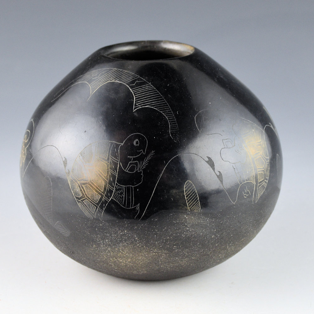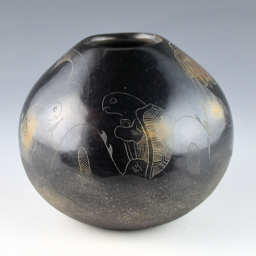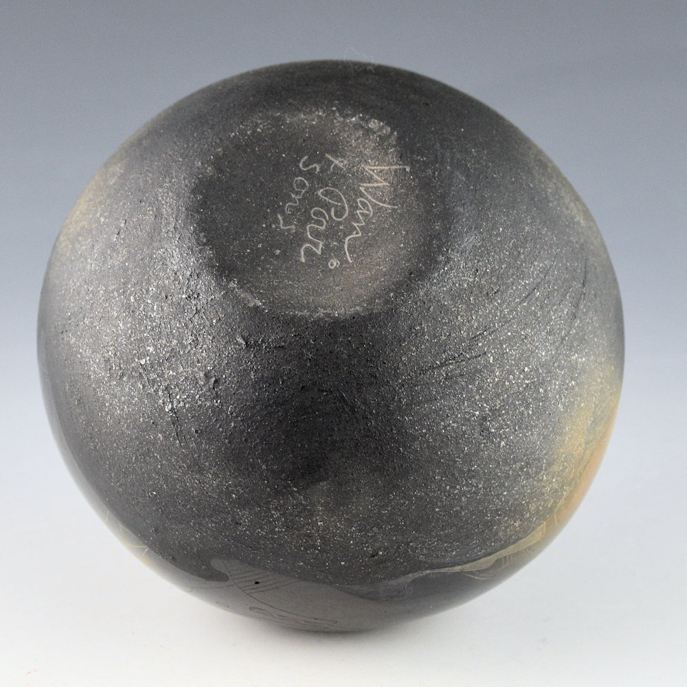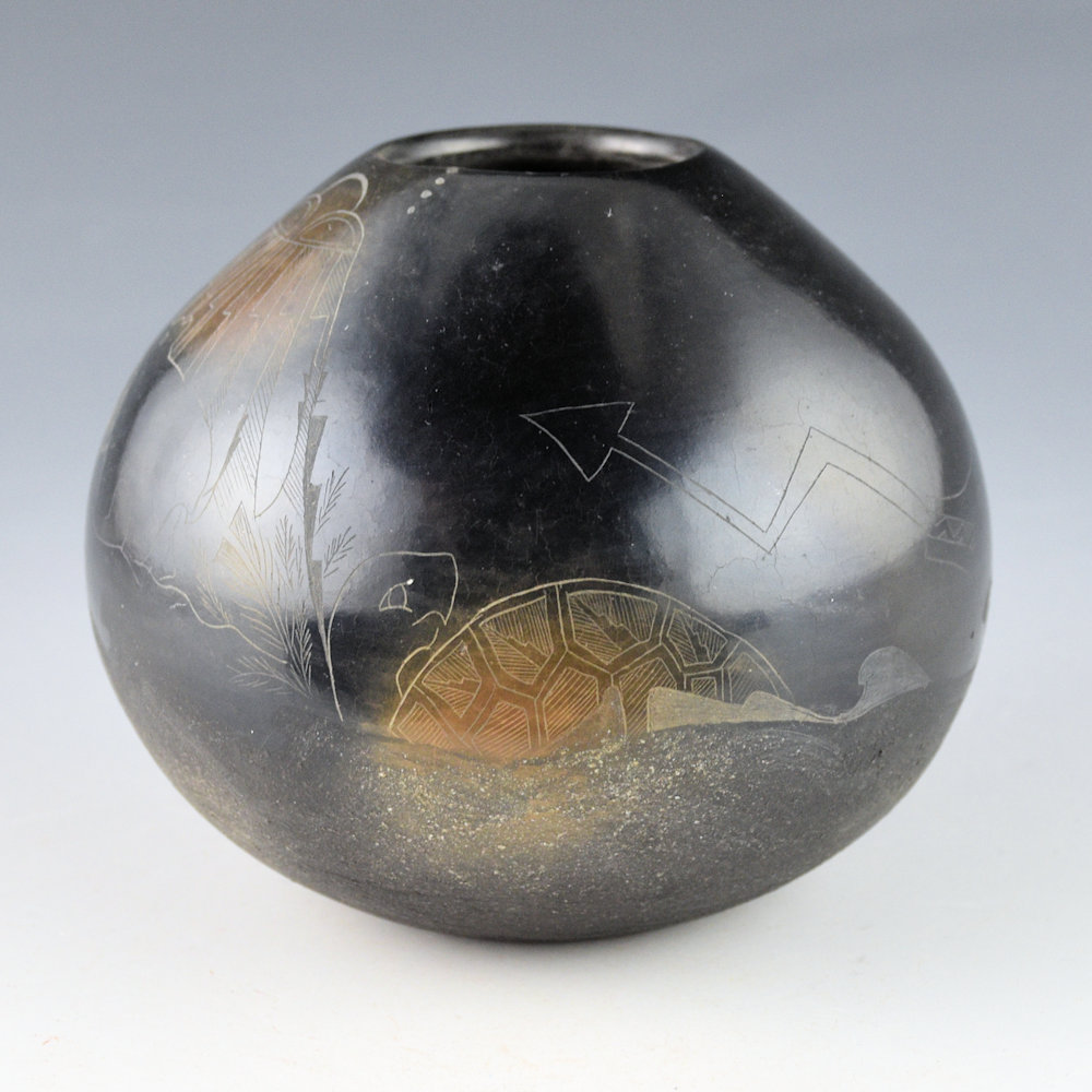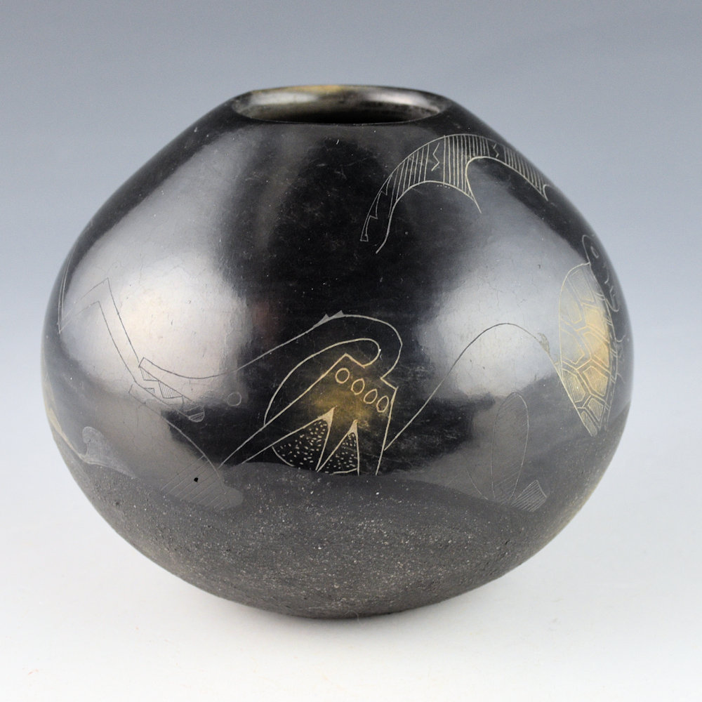 This is a complex jar by Kathy “Wan Povi” Sanchez (b. 1950).  Kathy is a great-great-granddaughter of Maria Martinez and a sister of Barbara Gonzales.  This jar is round in shape and the top is fully polished and the bottom is slipped with mica.  The jar was fired to a glassy black.  The designs are lightly etched into the clay. There is a bear under a rain cloud.  The remainder of the jar has a water serpent with turtles playing along its back.  There is a lot of detail in the rain cloud and turtle shells.  After the jar was fired, it was two-toned sienna in areas to accentuate the design.   All the etching was done after the firing.  The jar is signed, “Wan Povi” on the bottom.  While Kathy makes little pottery today, the technical expertise of her shape, polish, and design is certainly evident.  The jar is in excellent condition with no chips, cracks, restoration or repair.