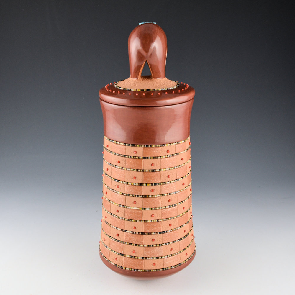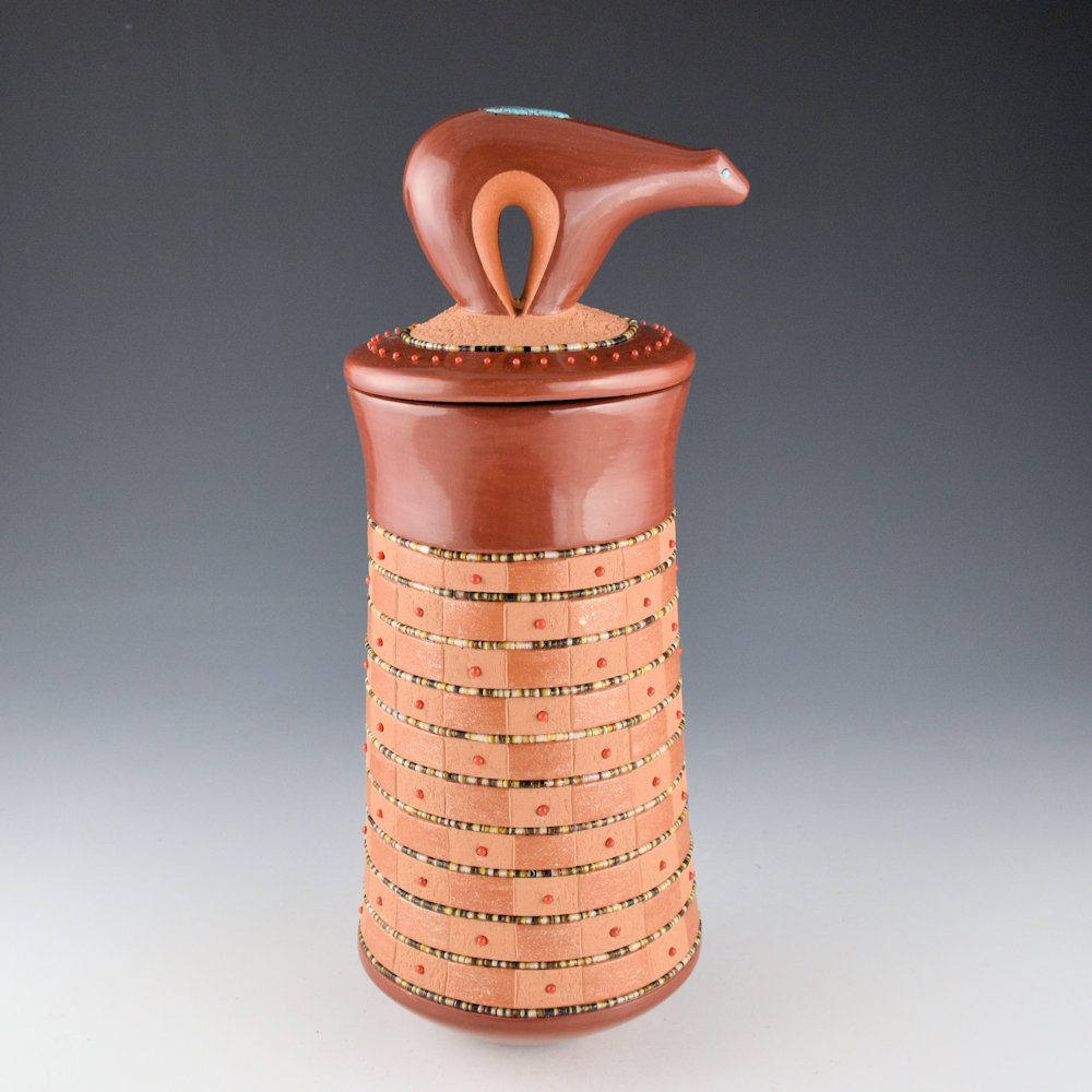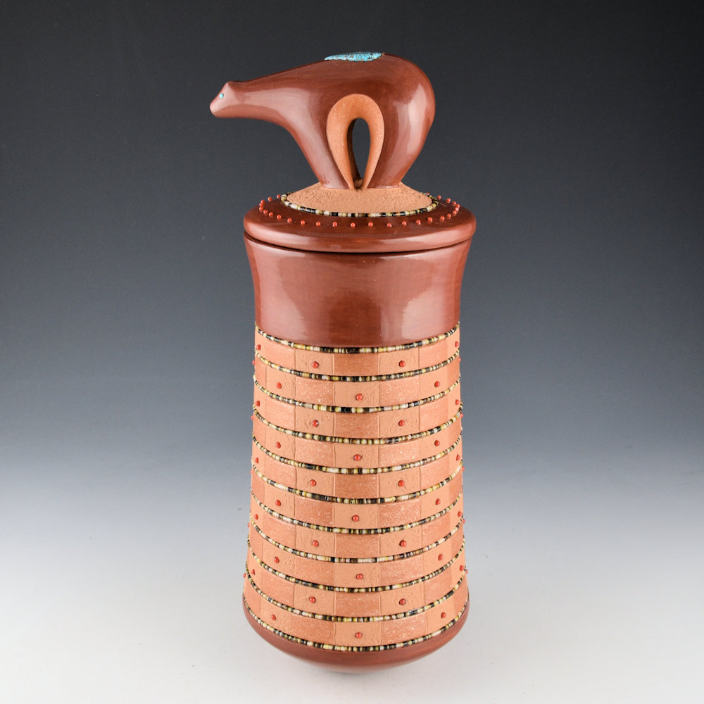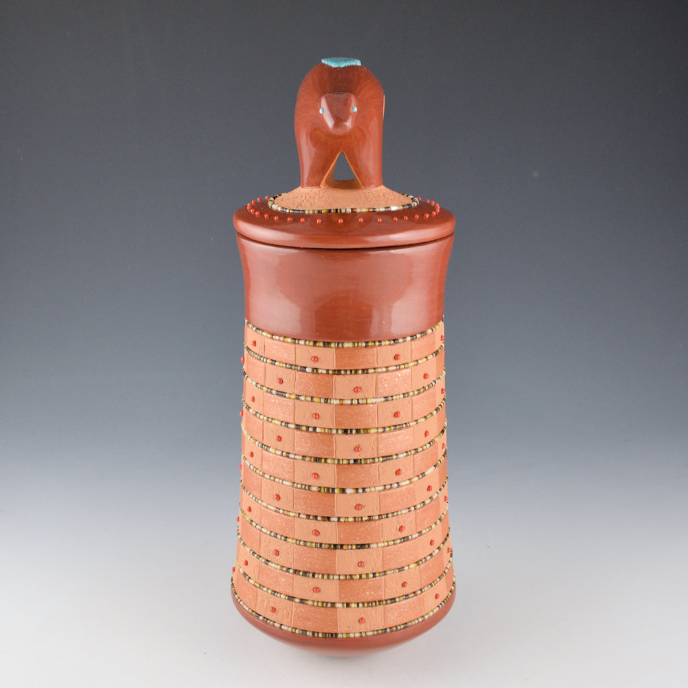 This is a stunning cylindrical jar by Russell Sanchez.  He continues to be one of the true innovators in Pueblo pottery.  Each piece is perfectly coil-built, stone-polished, and etched. The shape has a flaring base and flaring rim.  The rim and base are polished red. The body of the jar has ten rows of etched checkerboard designs.  Each is either micaceous or matte.  In each row, there are eight inset pieces of coral and each row is separated by a row of shell hei-shi beads.  The jar has a red polished lid with a bear on a base with a red polished rim. There are 42 inset coral on the edge of the lid.  There are turquioise for the eyes of the bear and on the back of the bear.  The stones are all inset after the firing.   It is signed on the bottom, “Russell”.