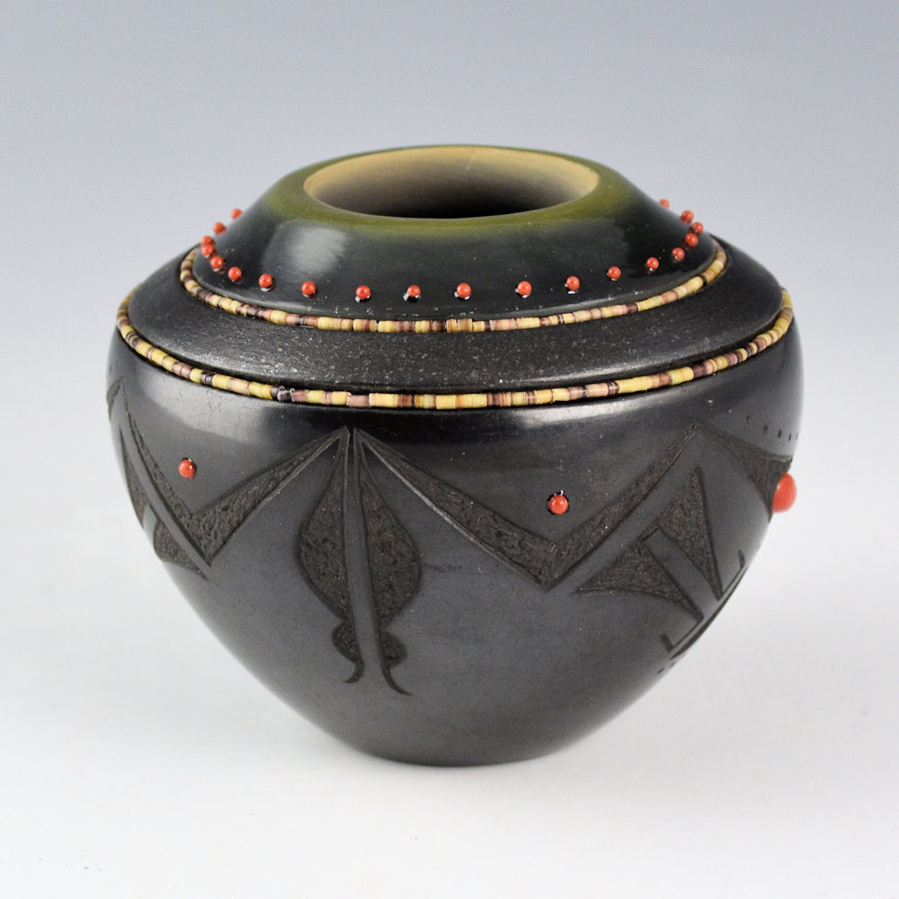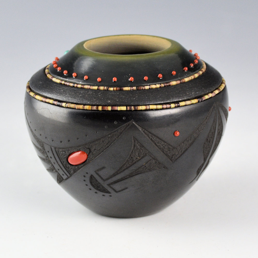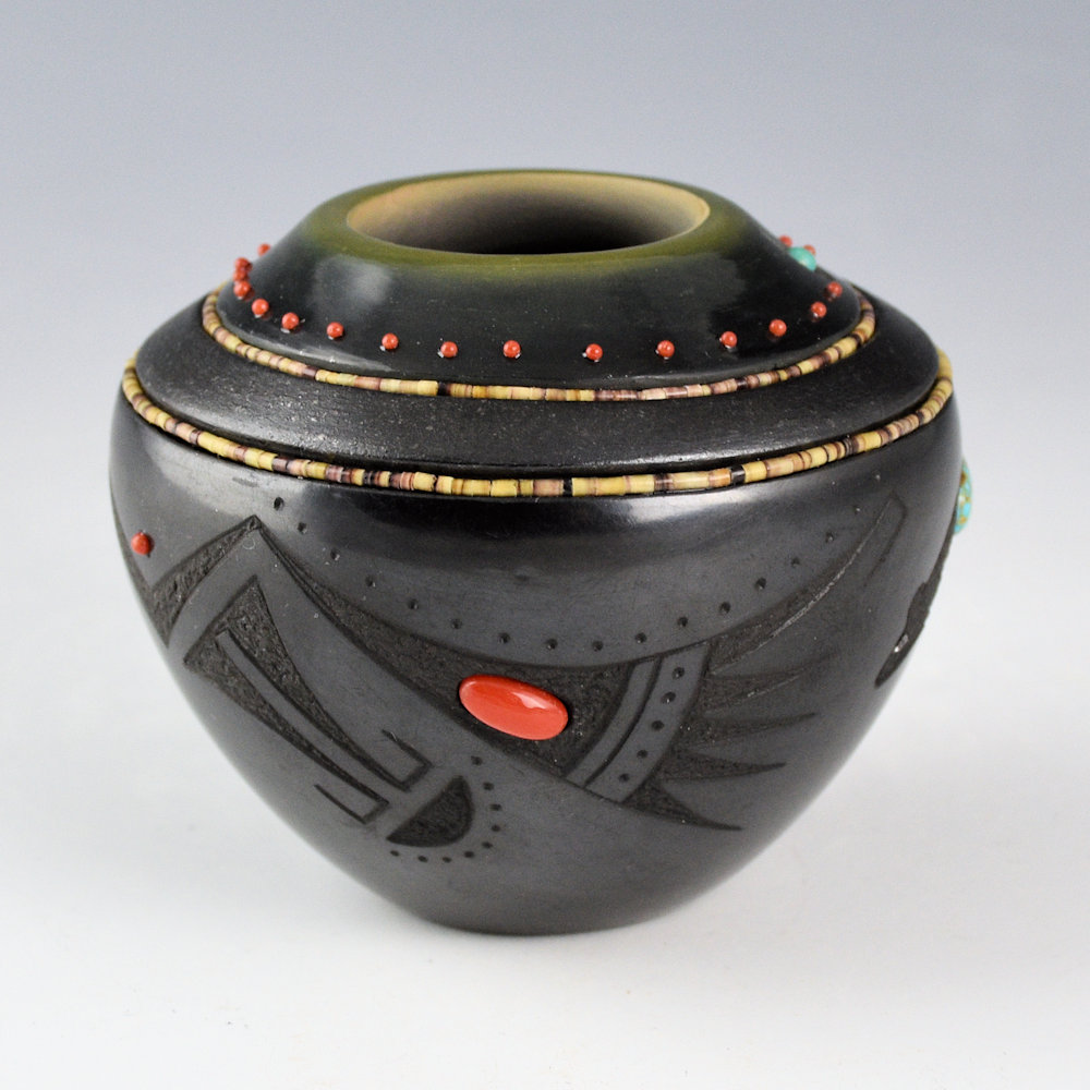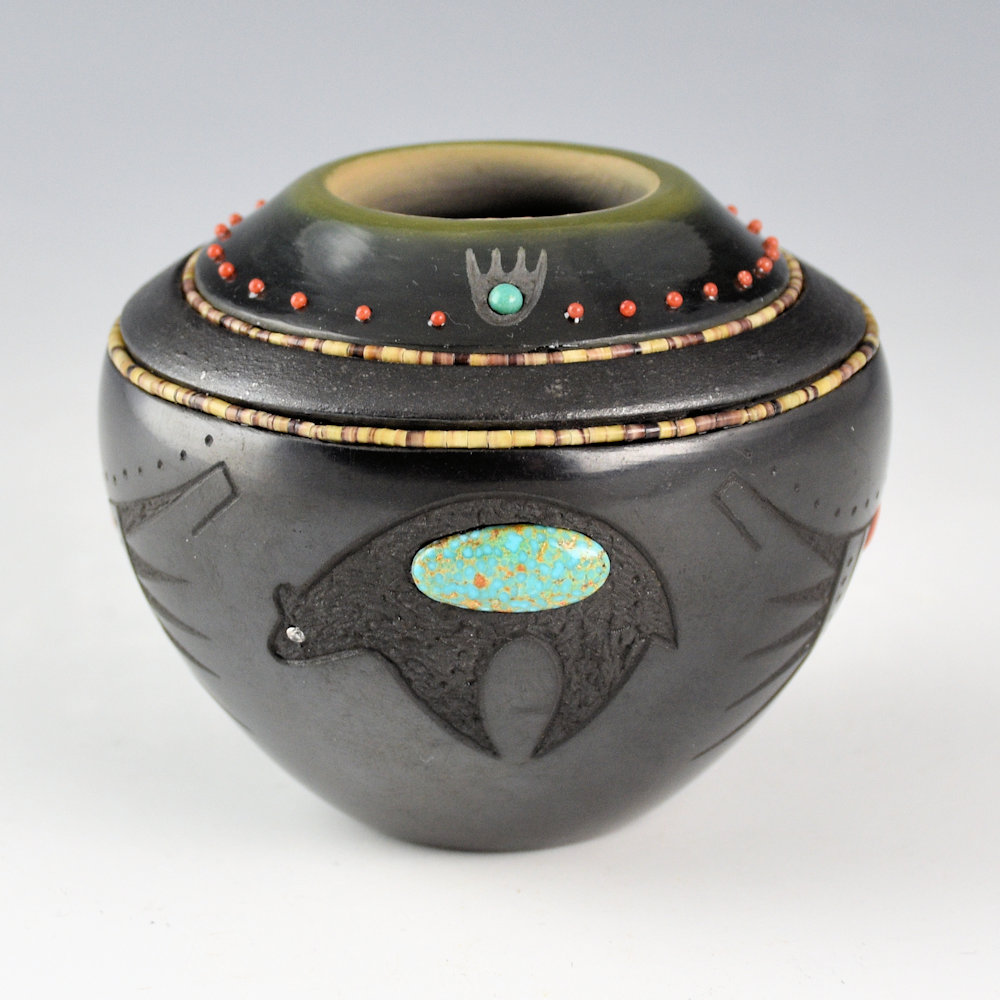 Russell Sanchez continues to be one of the true innovators in Pueblo pottery. Each piece is coil-built, stone-polished, and traditionally fired. This jar has a sharp shoulder and sloping neck. The jar was fired a glassy black and then the rim was two-toned green. The neck has an etched bear paw and there are two bands of hei-shi beads. The body of the jar has an etched bear and then etched clouds and birds on the opposite. There are inset coral stones on the neck and a single inset piece of turquoise in the bear paw. The birds and clouds have coral and the bear has a large inset piece of turquoise and a tiny diamond for the eye. The jar is a striking combination of colors, designs and detail. There are a total of 39 inset stones on this piece. All the stones are inset after firing. The jar is elegant in shape and design with a modern strength. It is signed, “Russell ’25”.