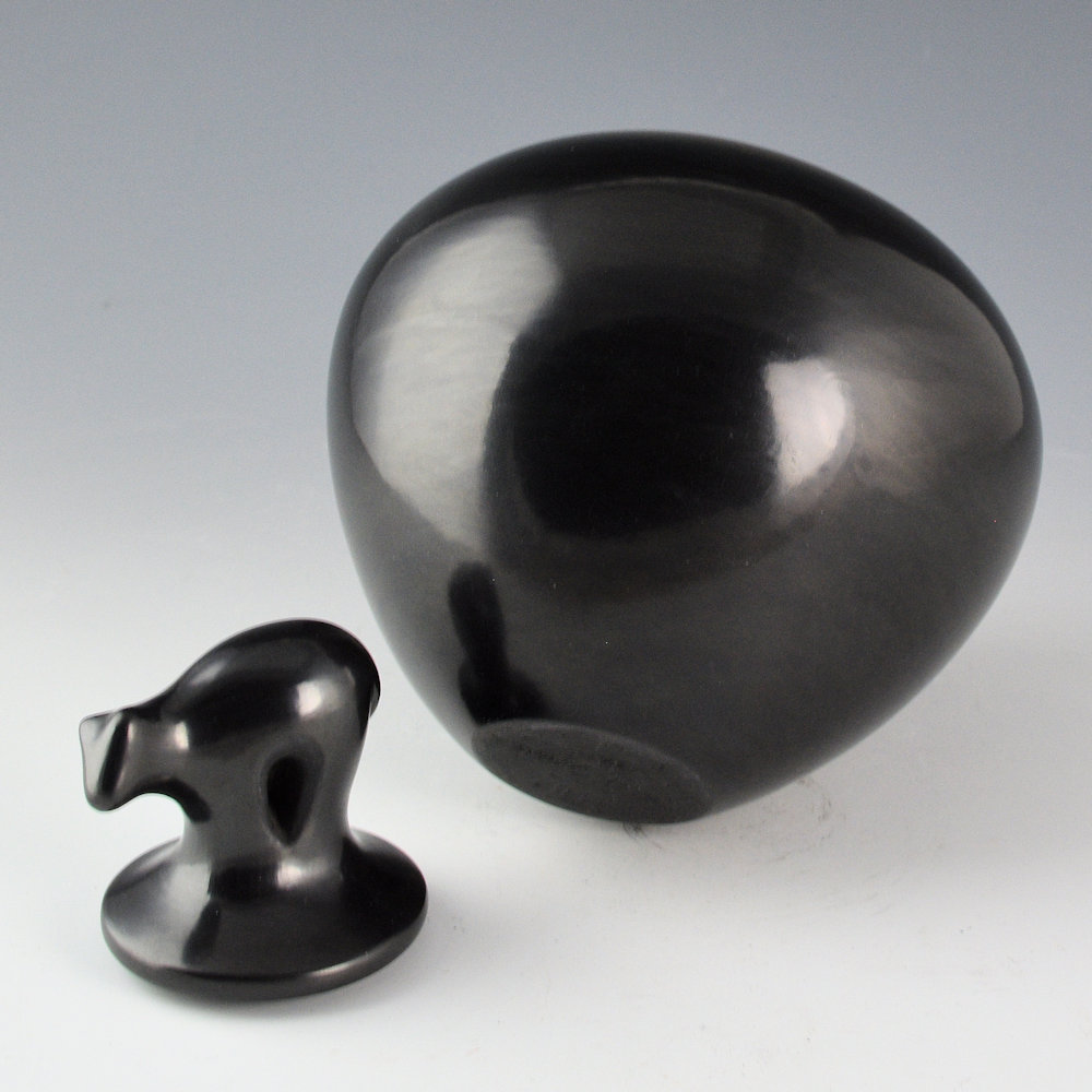 This is a classic bear lidded bowl by Russell Sanchez. He continues to be one of the true innovators in Pueblo pottery. Each piece is coil-built, stone-polished, and traditionally fired. The bowl is carved with a series of round circles that increase in size. Russell said when he saw this piece that is was a variation from the ones that he carved with lightning bolts. Russell continues to evolve his pottery and experiment, making even earlier pieces a reflection of his creativity. The piece was fired a glassy black and the rim was two-toned sienna. The bowl has a bear lid that is also fully polished. Note how the bear has his head turned! It is in excellent condition with no chips, cracks, restoration, or repair. It is signed, “Russell Sanchez”.
