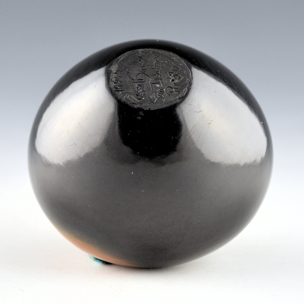 This is a classic jar by Russell Sanchez. He continues to be one of the true innovators in Pueblo pottery. Each piece is coil-built, stone-polished, and traditionally fired. The piece has a high shoulder and short neck. It was fired a glassy black and two-toned sienna round the rim and down the front. There is a single inset piece of turquoise. The jar is from 1984. It is in excellent condition with no chips, cracks, restoration, or repair. It is signed, “Russell Sanchez”.
