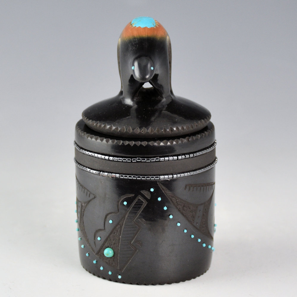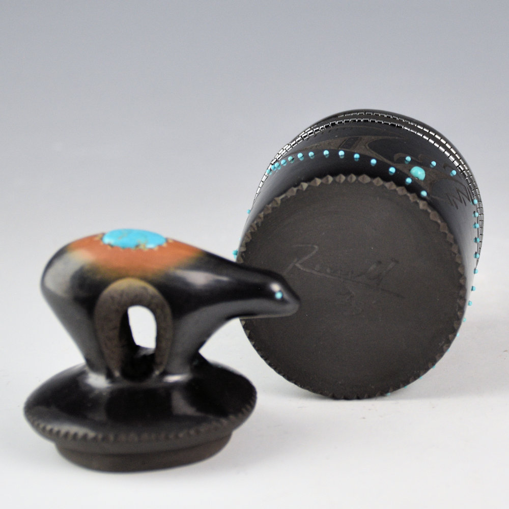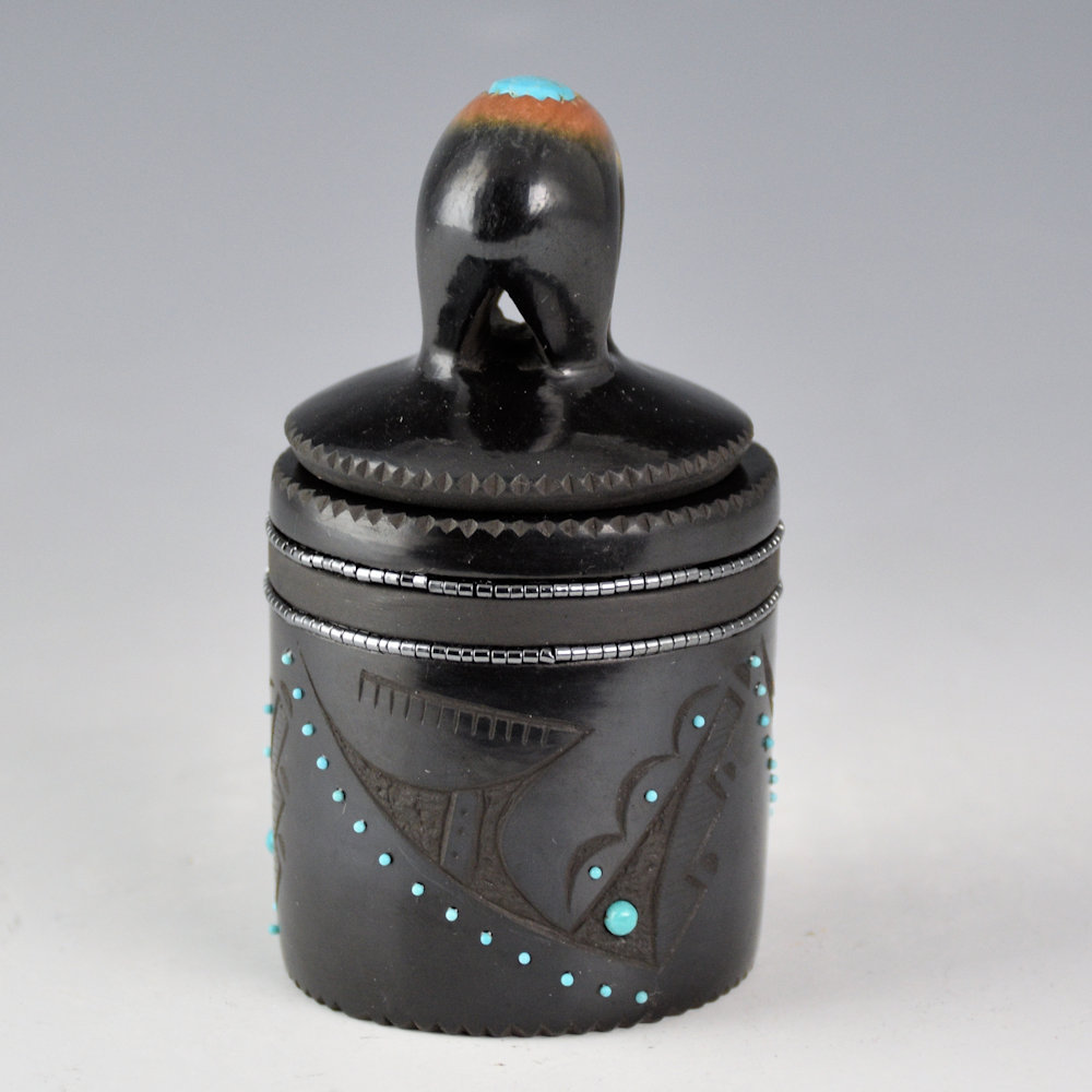 Russell Sanchez continues to be one of the true innovators in Pueblo pottery. Each piece is coil-built, stone-polished, and traditionally fired. It is a round cylinder that is fully polished. It is etched with rain clouds, swirling around the piece. There are 60 inset pieces of turquoise on the jar. There are two inset rows of hematite hei-shi beads. The bear lid it two-toned sienna. There is a turquoise stone on the back and two for the eyes. It is exciting to see one of his smaller round boxes with a bear lid! All the stones are inset after firing. The jar is elegant in shape and design with a modern strength. It is signed, “Russell ’25”.