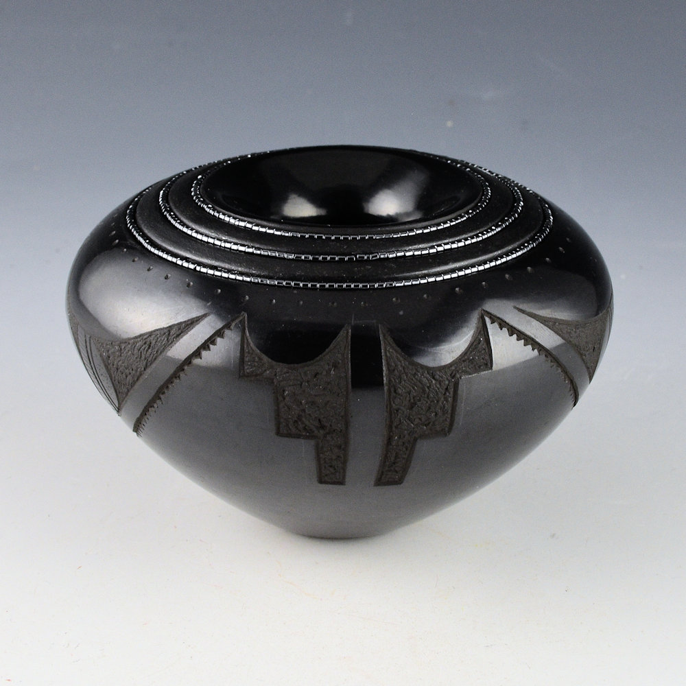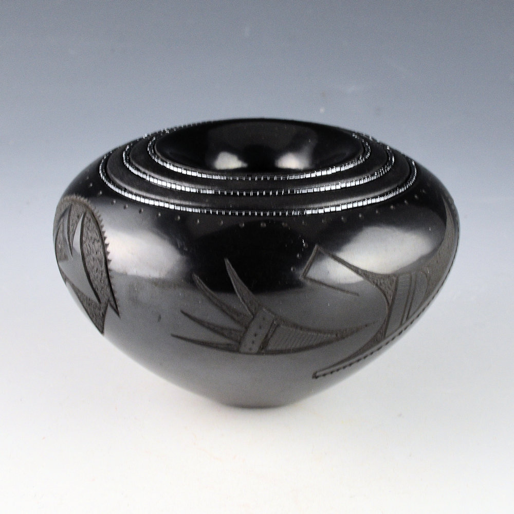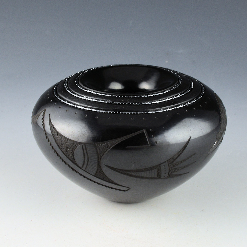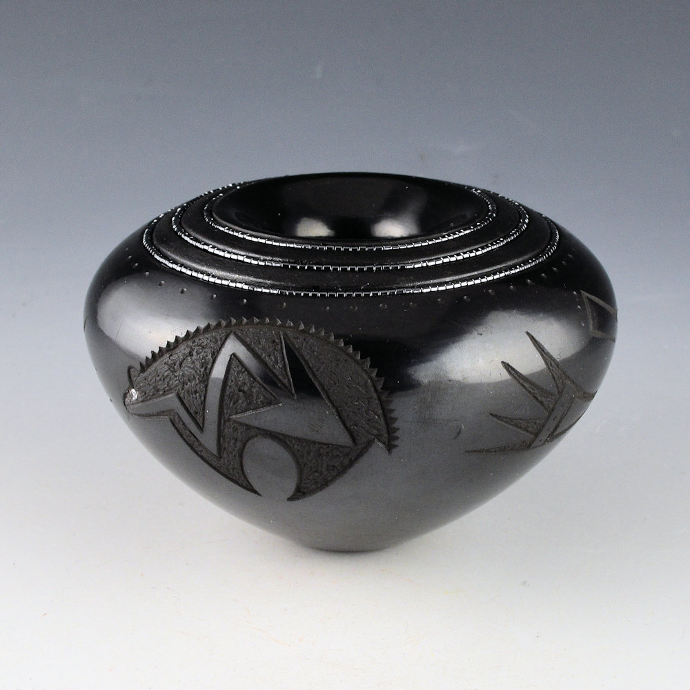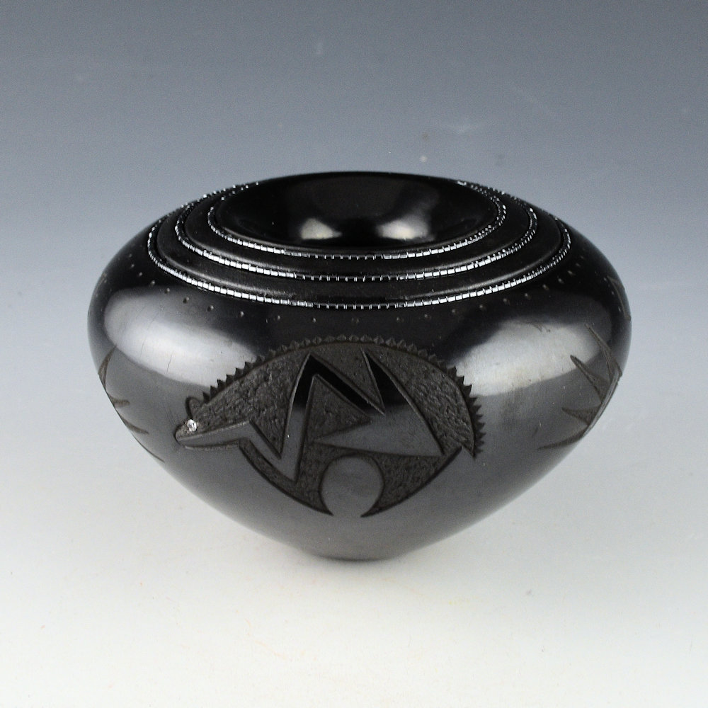 This is a creative bowl by Russell Sanchez with a turn-down, or “infinity” rim. The bowl is coil-built, and the rim is turned downward instead of upward. This adds to the difficulty of making the piece, having it survive drying, carving, polishing, and firing! The rim is fully polished. Along the rim are three rows of hematite hei-shi beads. On the sides, there is an etched heartline bear with a single inset eye. As the bowl is turned, there are cloud and rain designs. All the designs are etched into the clay before it is fired.