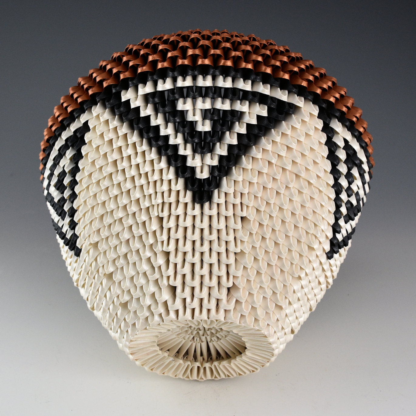 Rain Scott is the son of jeweler Raynard Scott (Navajo) and a descendant of Marie Z. Chino of Acoma. He says that growing up in Arizona, he wanted to learn to make pottery but didn’t have anyone to teach him. In 2011 he began working with origami, the art of creating objects with folded paper. From 2013 to 2018 he experimented with the art form and in 2018 made his first vessel, an Acoma jar. He calls his style, “contemporary indigenous origami”. This piece is entitled, “Blending Traditions”. Rain says that he used black, white, and copper 8 1/2 x 11 sheets of paper to make the design. Each full sheet is folded to make each section! This bowl has a high shoulder and uses three different colors of paper. Raid said of this piece