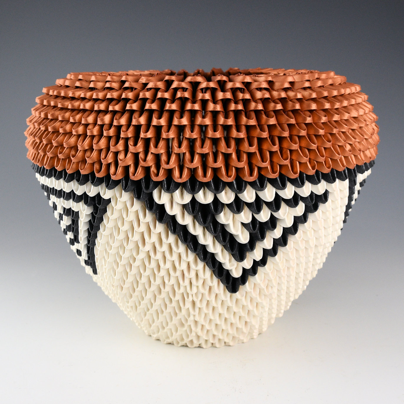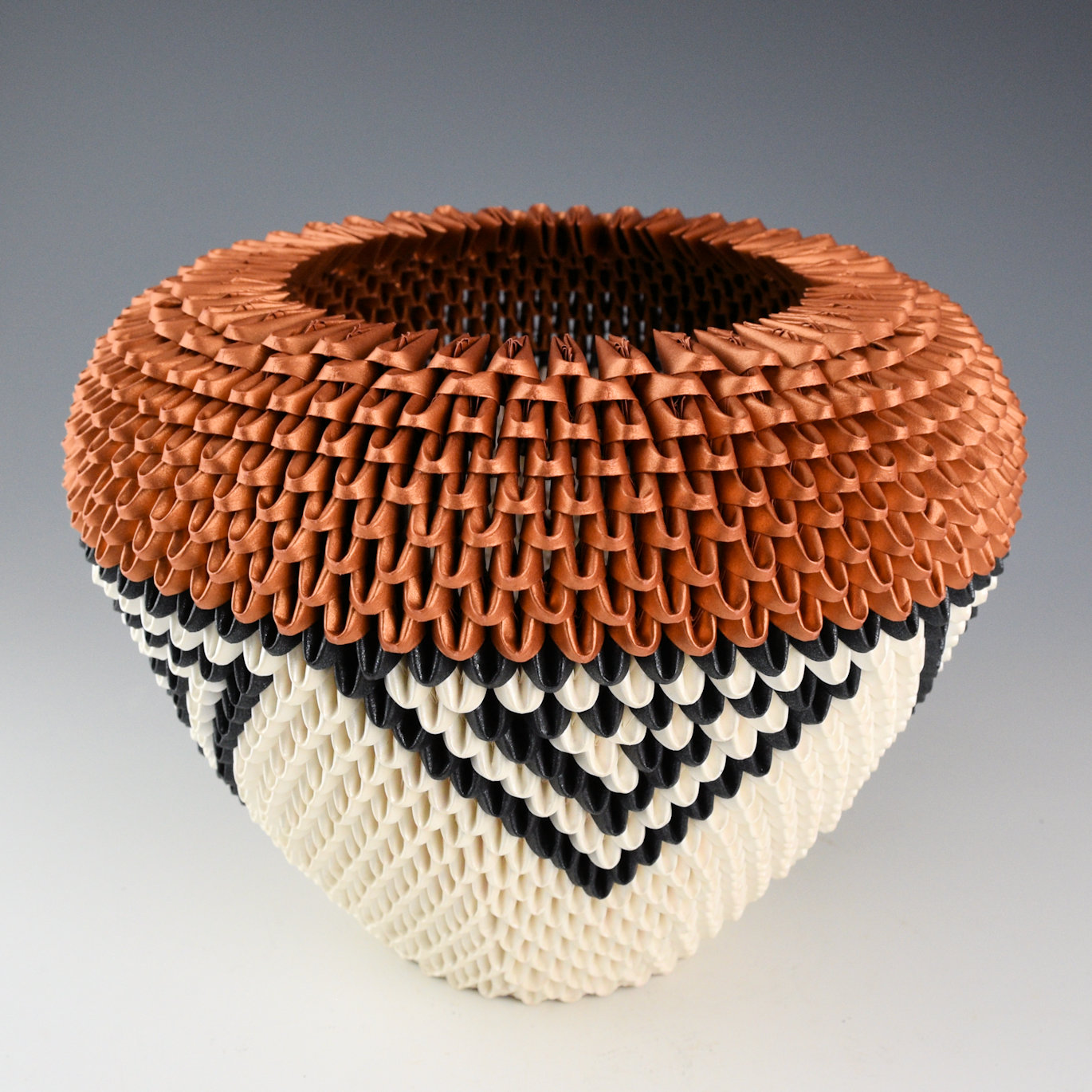Since 2018, Rain Scott has combined the traditional Acoma Pueblo pottery designs with individually cut and folded origami modules into an art form that he calls “contemporary Indigenous origami.” The thick, sturdy walls and corrugated texture of his origami pottery make every piece pleasing to the eye and gratifying to touch. He pushes the boundaries further with every art piece he creates, incorporating new designs, shapes, colors, and components, including parrot feathers, turquoise, and natural sinew. Rain Scott’s creations have been awarded many awards at juried art shows in the Southwest, including the 2020 Alan Houser Innovation Award at the Heard Museum Guild Indian Fair and Market.