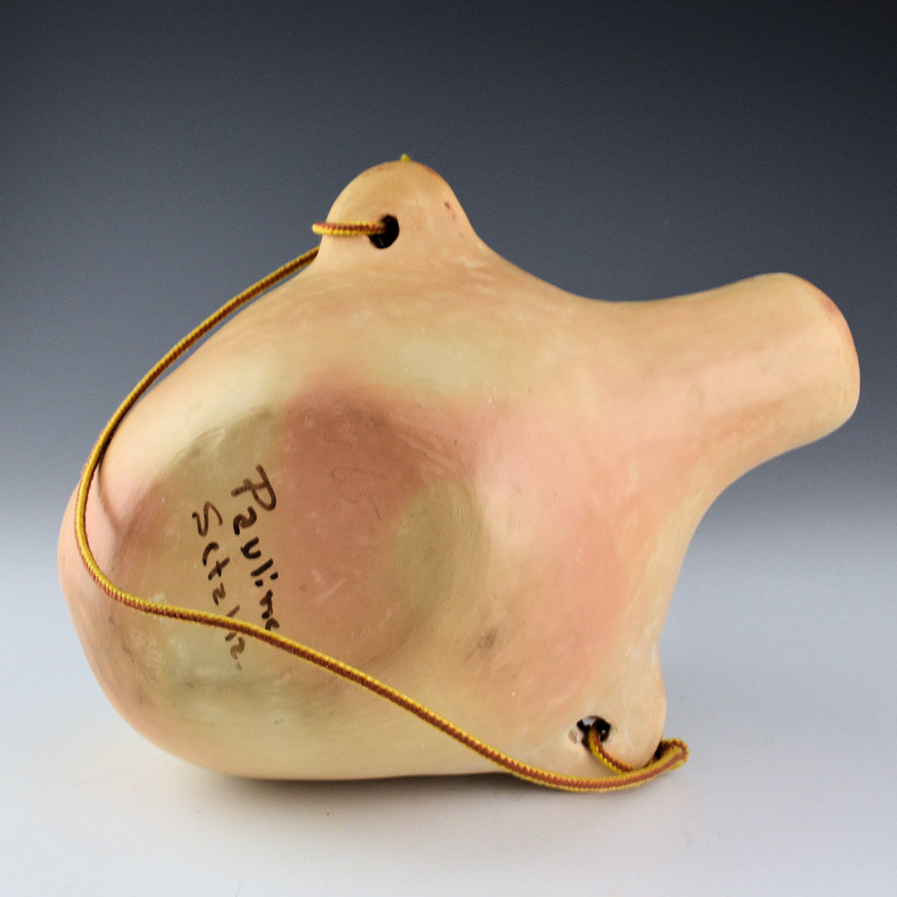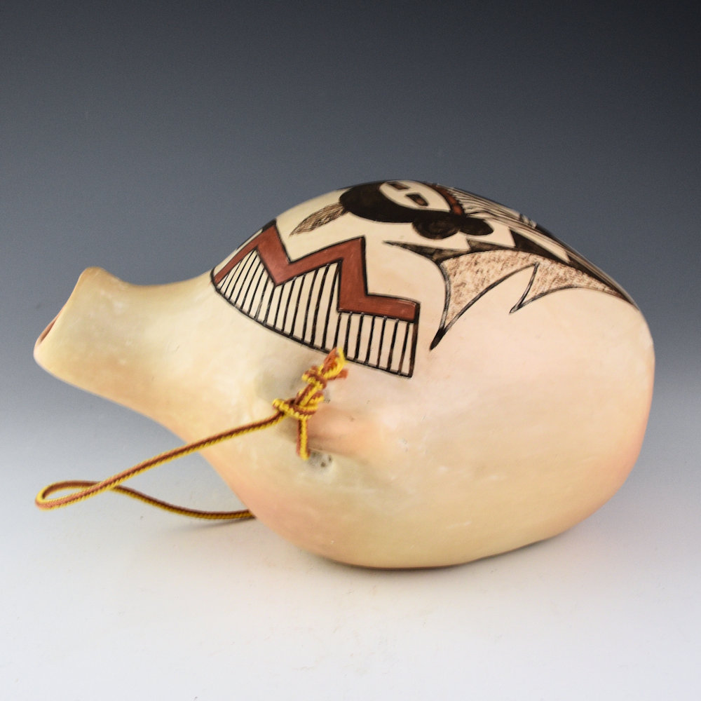 Pauline Talasyousia (Setalla) (b. 1930) married Justin Navasie Setalla. She was raised in the village of Mishongovi and learned to make pottery from her mother-in-law, Agnes Navasie, and her sister-in-law, Eunice “Fawn” Navasie. She had ten children, including Dee Setalla, Agnes Nasonhoya, Gwen Setalla, and Stetson Setalla, who are all potters. This is one of her creative canteens from the 1970s. The piece sits at an angle and has an upturned spout. The entire piece is polished white. The front is painted with a Longhair Mana Katsina along with clouds, and a bear paw. The black is bee-weed, and the white and red are clay slips. It was traditionally fired, creating striking colorations that range from pink to tan. The canteen is in very good condition with no chips, cracks, restoration, or repair. It is signed, “Pauline Setalla”.