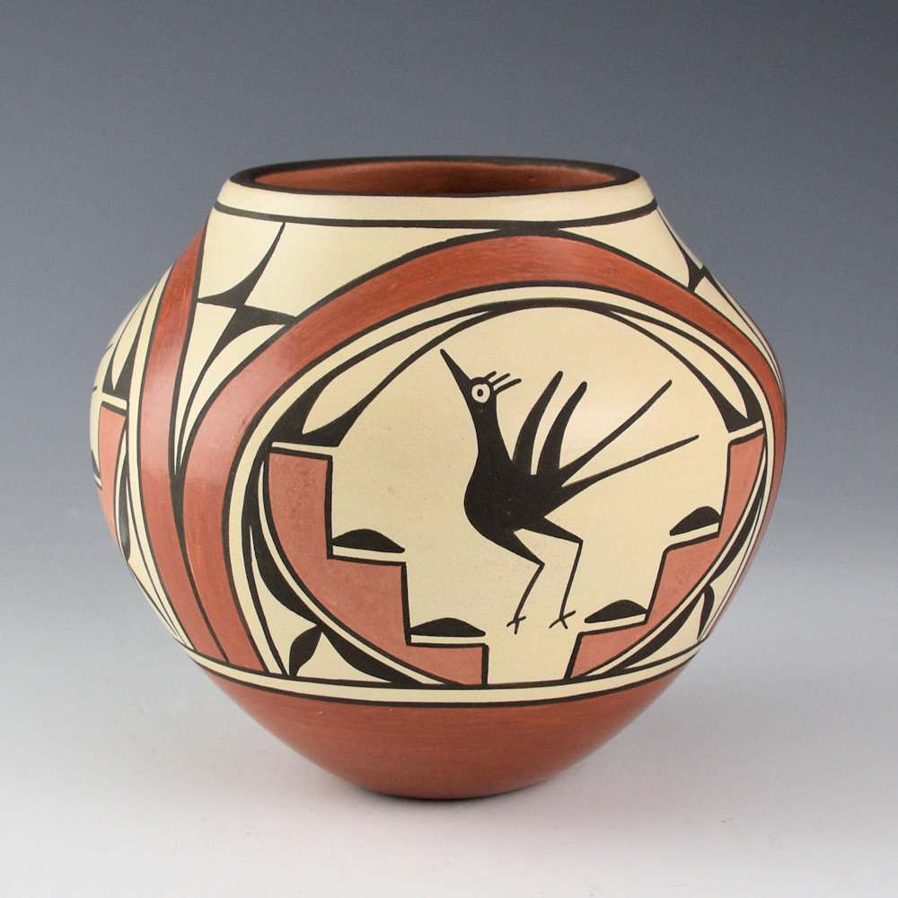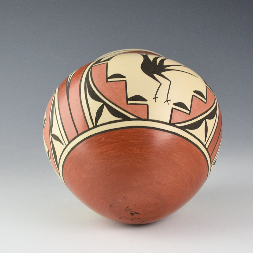 Eusebia Toribio Shije is known for her traditional Zia pottery. This jar is coil-built and painted with native clay slips. It is classic Zia jar with a round shoulder. There are three Zia birds painted on the white clay background. Below the birds are red and tan polished clouds and above them are rainbows. The base is fully polished red. It was traditionally fired. It is in excellent condition with no chips, cracks, restoration, or repair. It is signed on the bottom, “Eusebia Shije”.