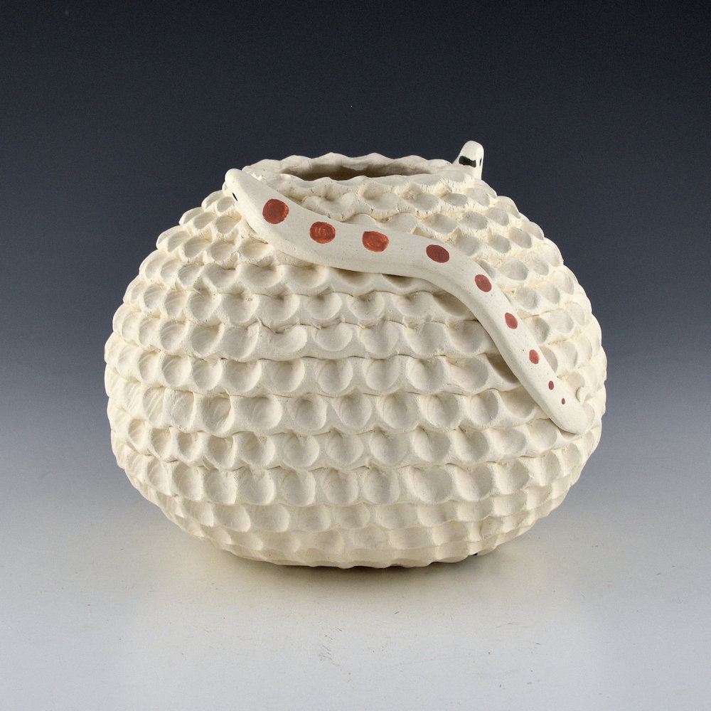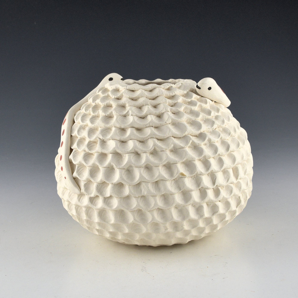 Jackie Shutiva-Hista (b. 1961) is a daughter of noted potter Stella Shutiva. She learned to make pottery from her mother, who was known for her corrugated pottery. This bowl is round and fully corrugated. There are 21 rows of corrugation from the rim to the base. “Corrugated” is a technique that simply means that the coils are left exposed and are pressed down using a tool or the potter’s finger. Jackie typically uses her finger to impress the clay, creating this stylistic appearance. On the sides are snake handles, and the snakes have painted dots on their backs. The bowl is signed on the bottom, “J. H. Shutiva”. It is in excellent condition with no chips, cracks, restoration, or repair.