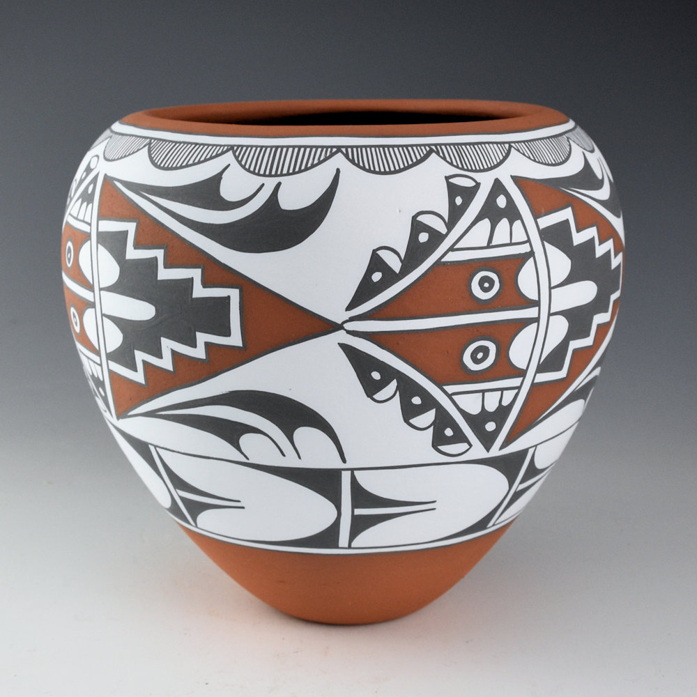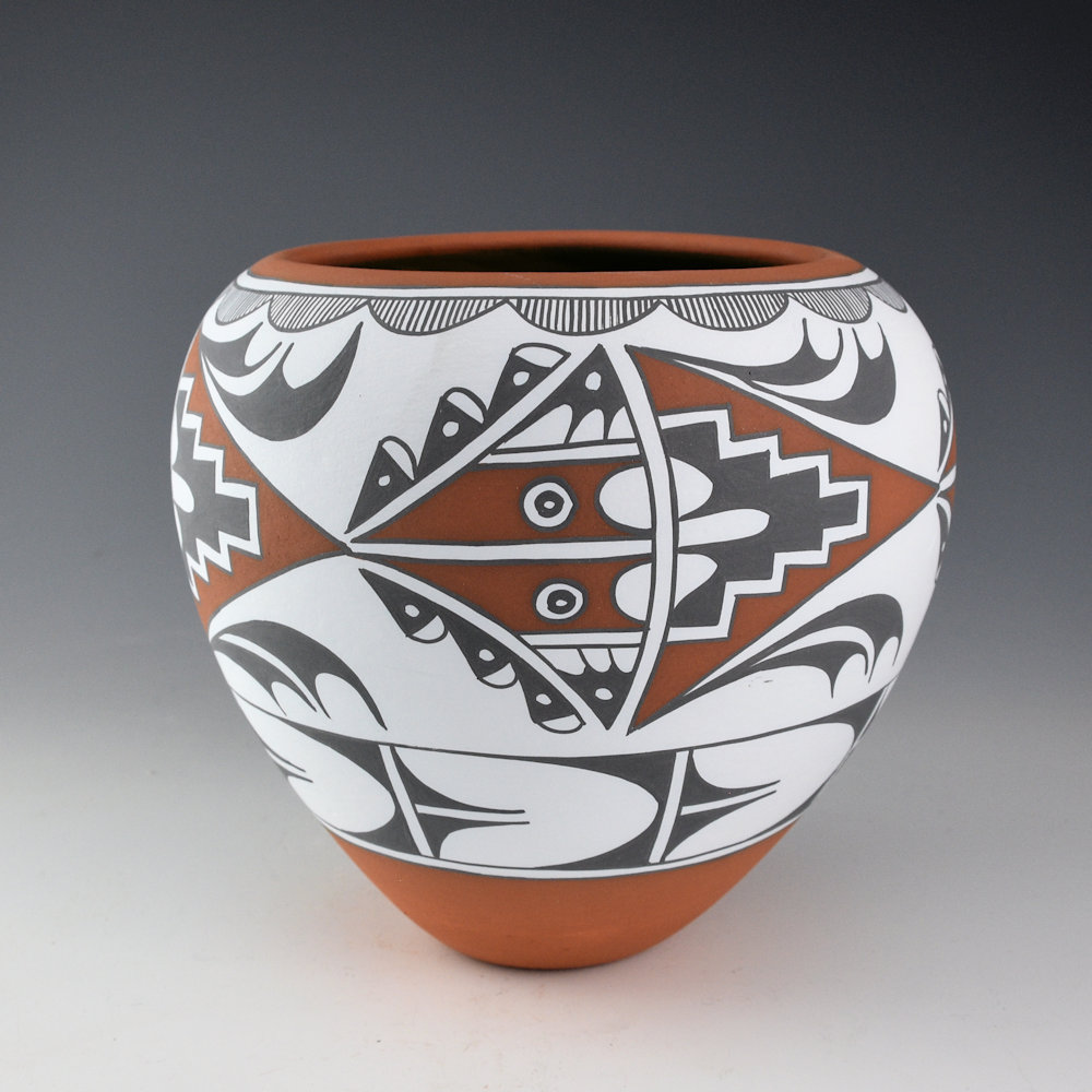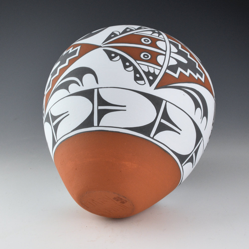 Mary Small (1940-2024) was known for her traditional Jemez pottery. It is not just her painting that was distinctive, but the gray clay she uses is distinctive to her pottery. This bowl has a round shape and it has a rain cloud pattern around the rim. Around the sides is an old-style “cloud beings” pattern, often seen on historic pottery. The piece has a striking coloration from the white, gray, and the firing. It is signed on the bottom, “Mary Small”. It is in excellent condition with no chips, cracks, restoration, or repair.