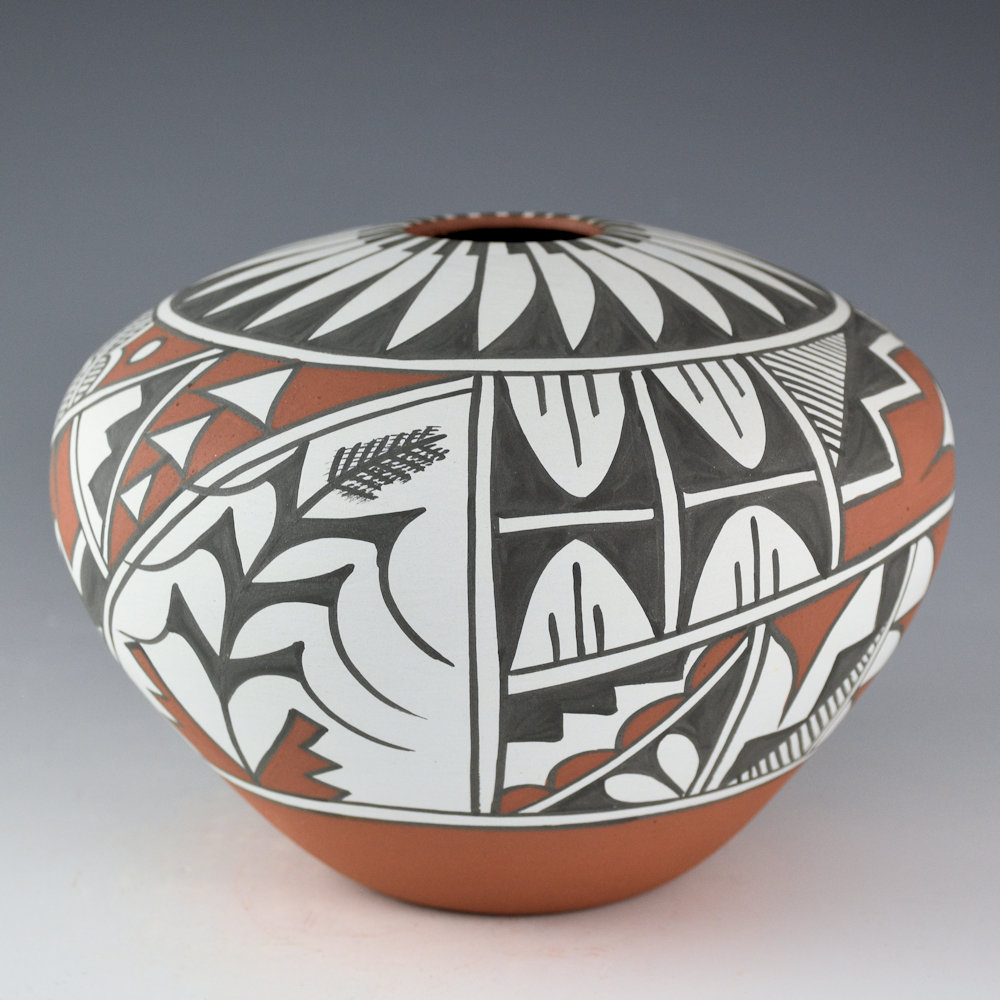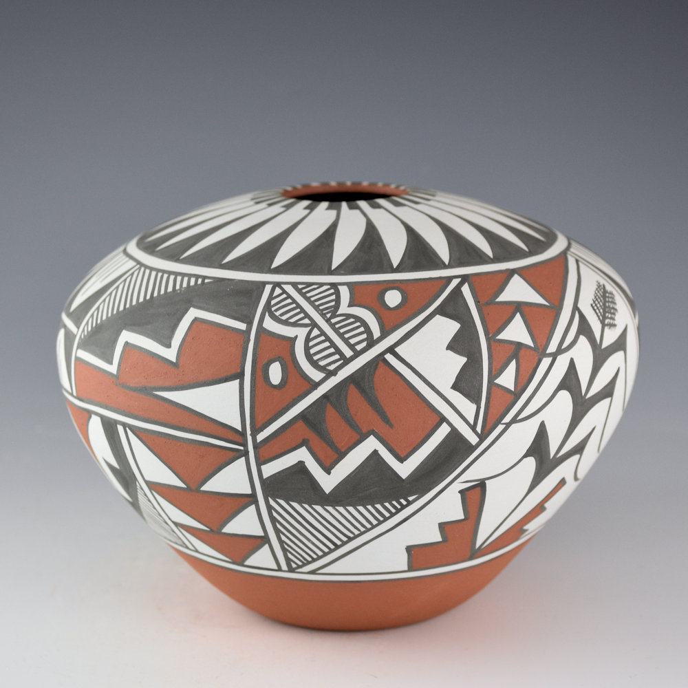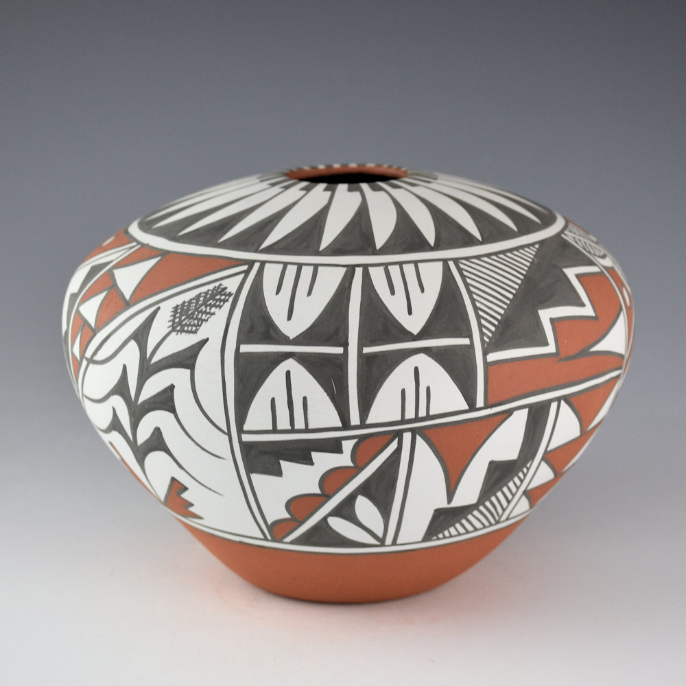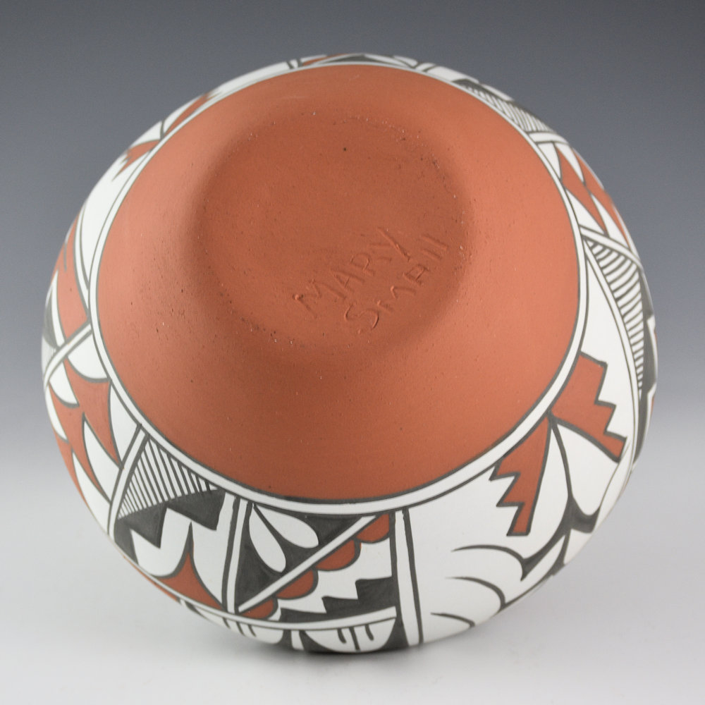 Mary Small (1940-2024) was known for her traditional Jemez pottery. It is not just her painting that was distinctive, but the gray clay she uses is distinctive to her pottery. This seed bowl has a round shape. There is a feather pattern on the top and corn and rain design on the sides. The piece has a striking coloration from the white, gray, and the firing. It is signed on the bottom, “Mary Small”. It is in excellent condition with no chips, cracks, restoration, or repair.