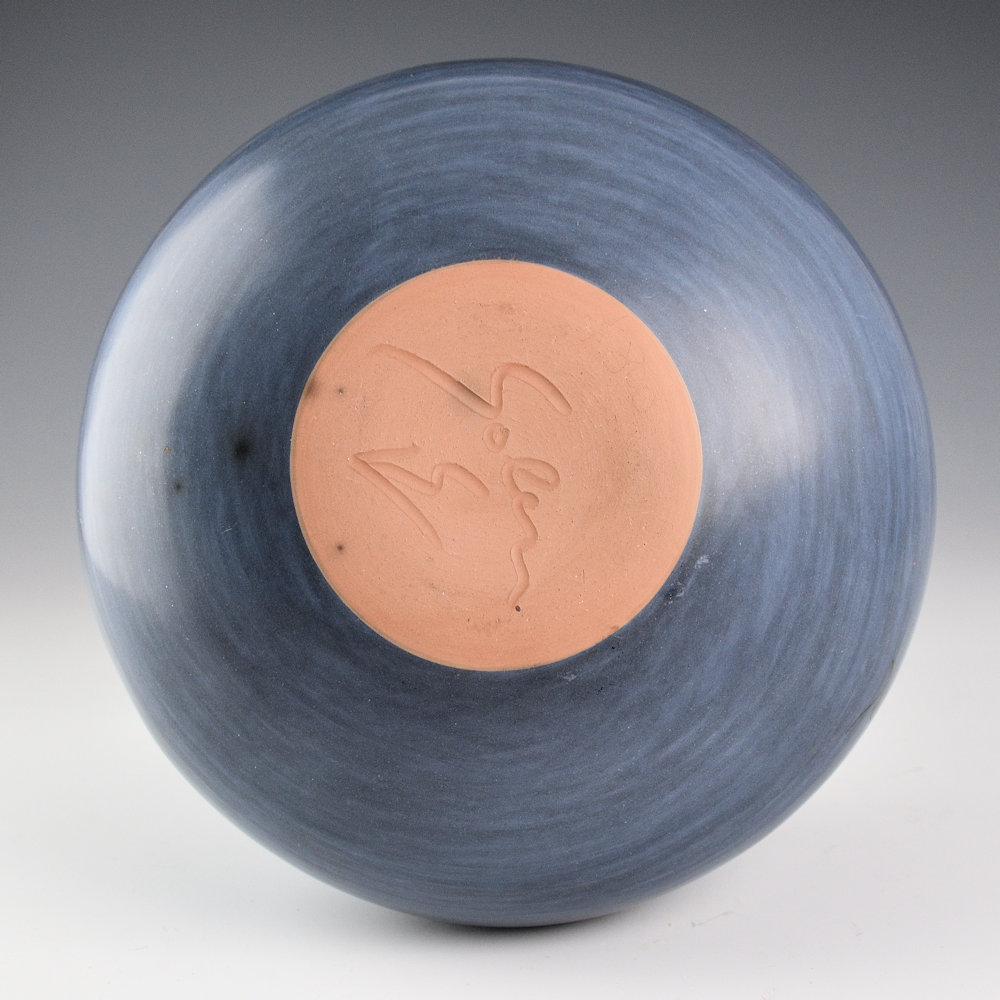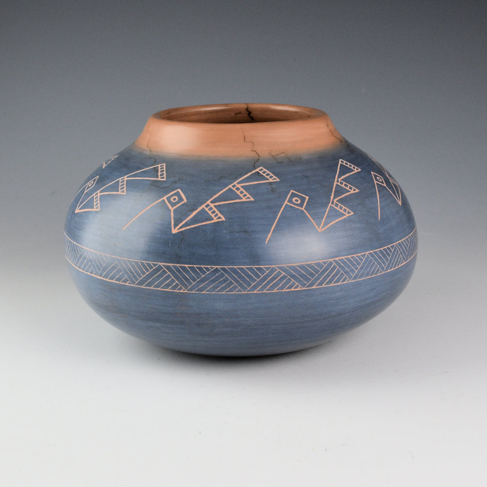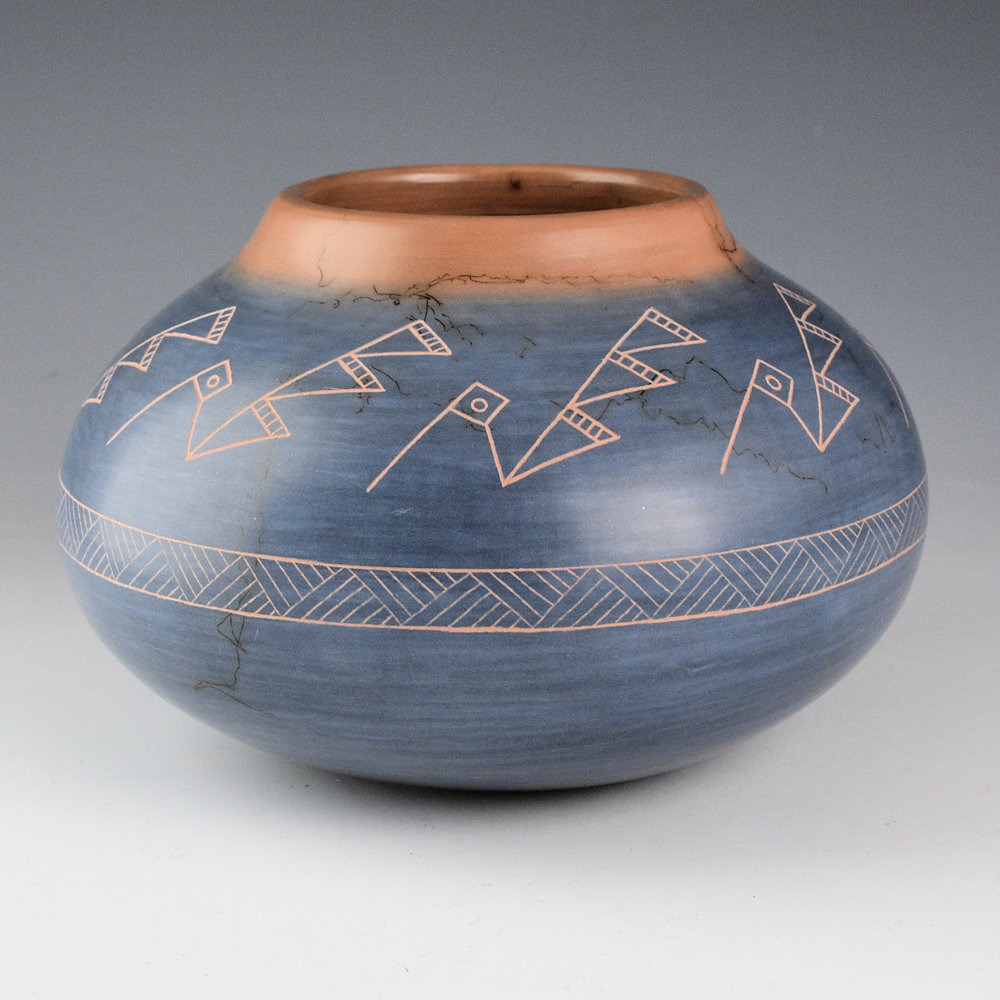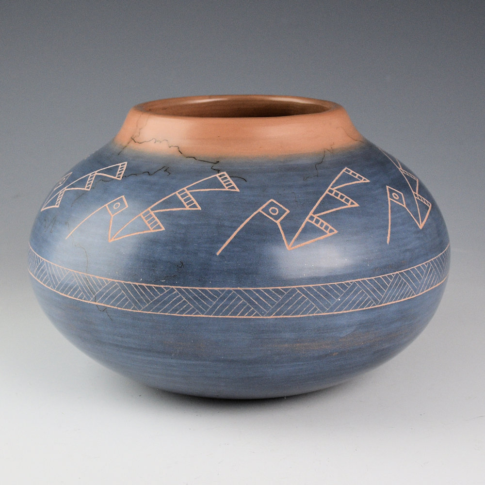 Lucho Soler (Peruvian), has been a professor at the famous Institute of American Indian Art School in Santa Fe, NM. In his native Peru, he has taught countless workshops and given classes to young aspiring artists, helping them learn about their cultural heritage and letting them find expression in creating something beautiful. Each piece is coil-built, stone-polished, and the colors are all from clya and minerals mixed as slips. This jar is coil-built and polished with a blue clay slip around the body of the piece. The neck is the natural color of the clay. The jar was fired, and then the series of pre-Columbian-style birds was etched around the shoulder of the jar. It is signed on the bottom.