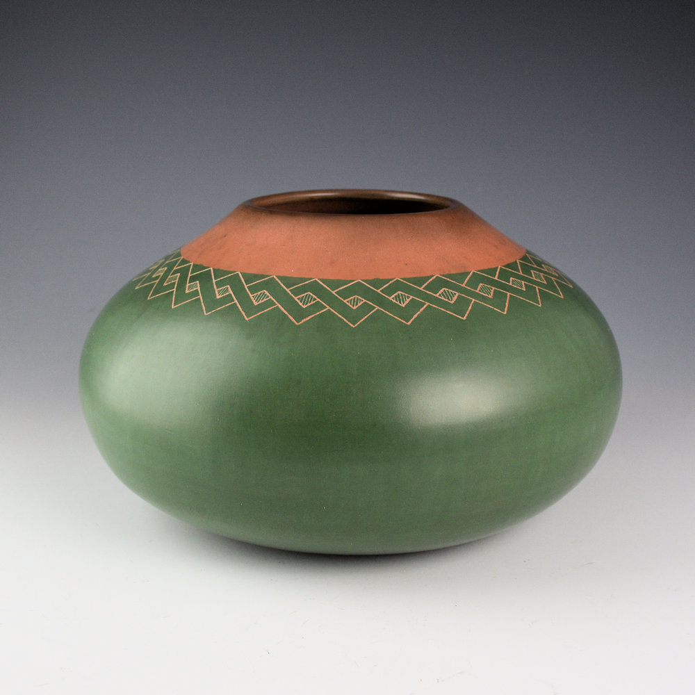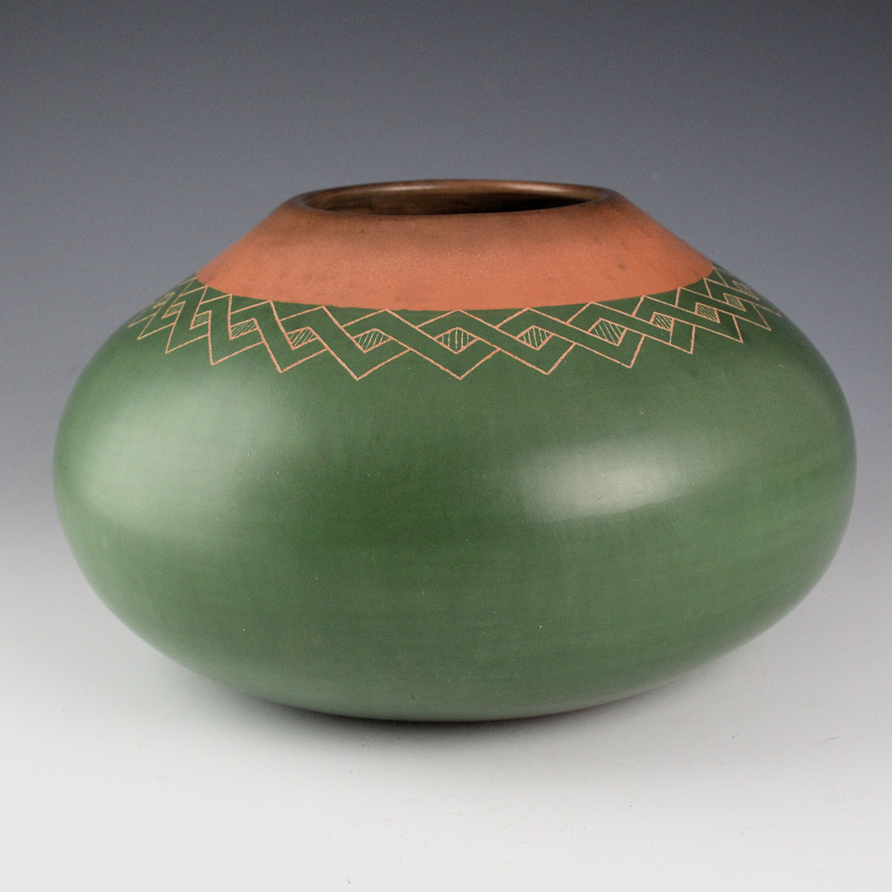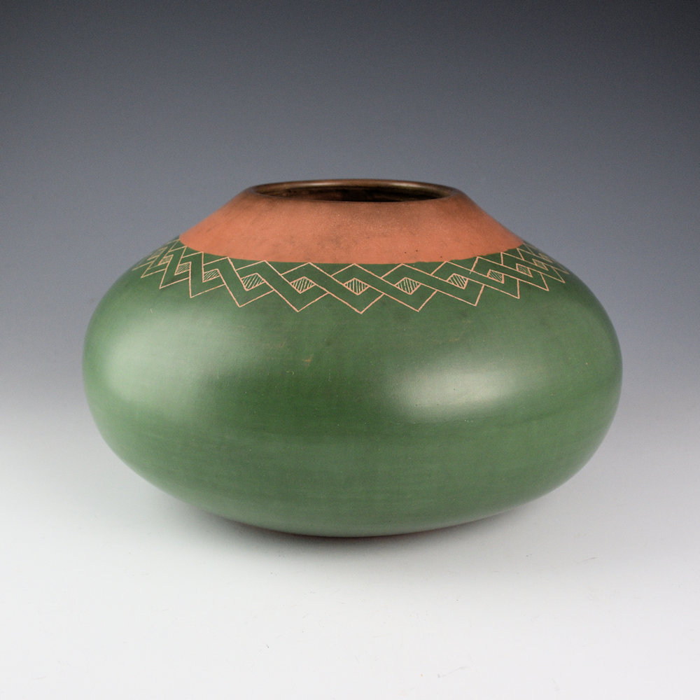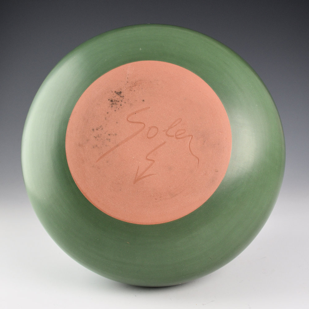 Lucho Soler (Peruvian), has been a professor at the famous Institute of American Indian Art School in Santa Fe, NM. In his native Peru he has taught countless workshops and given classes to young aspiring artists helping them learn about their cultural heritage and letting them find expression in creating something beautiful. Each piece is coil-built, stone polished, and the colors are all from clya and minerals mixed as slips. This jar is coil-built and polished with a green slip around the body of the piece. The neck is the natural color of the clay. The jar was fired and then the designs were etched into the clay. It is signed on the bottom.