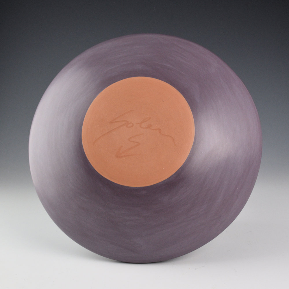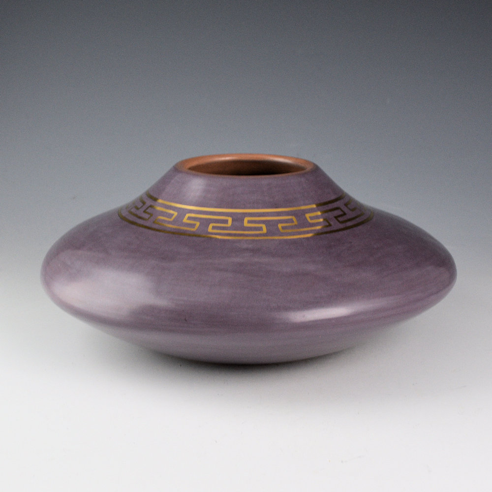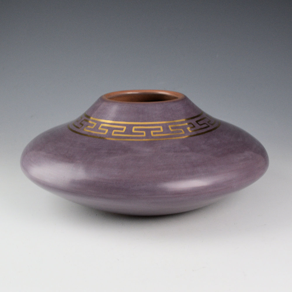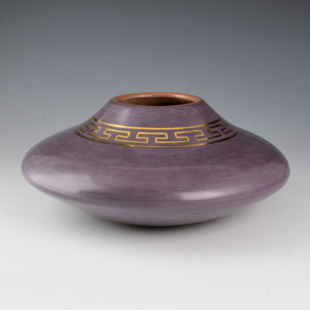 Lucho Soler (Peruvian), has been a professor at the famous Institute of American Indian Art School in Santa Fe, NM. In his native Peru, he has taught countless workshops and given classes to young aspiring artists, helping them learn about their cultural heritage and letting them find expression in creating something beautiful.  Each piece is coil-built, stone-polished, and the colors are all from clya and minerals mixed as slips.  This jar is coil-built and polished a purple coloration.  The neck of the jar has an interlocking design in gold lusture used to paint the design, and it is fired into the clay.  The coloration is striking!   It is signed on the bottom.
