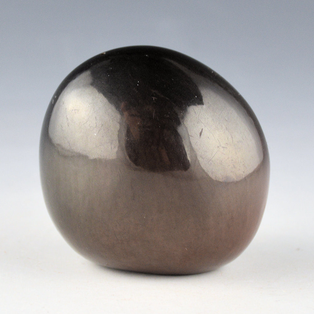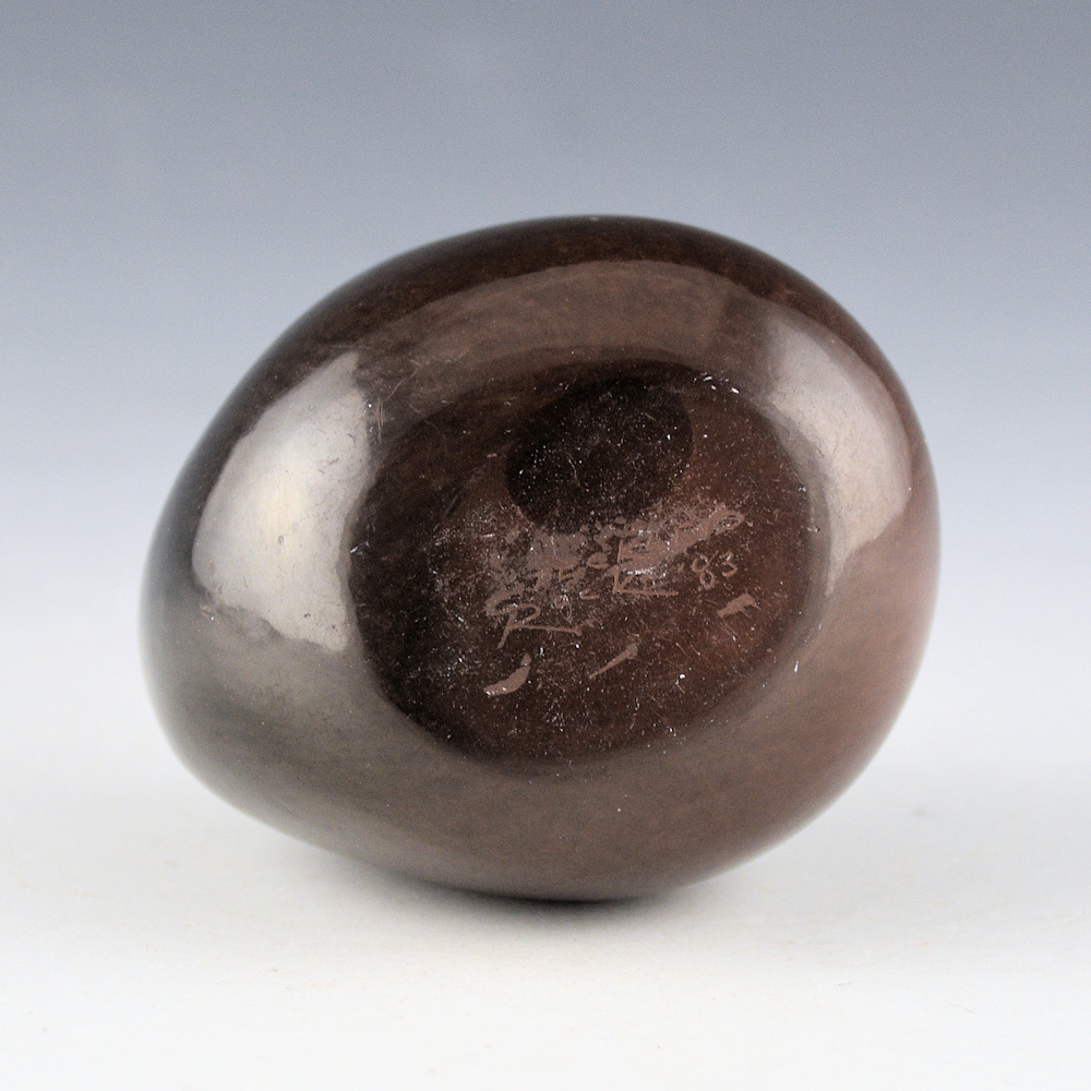 Paul Speckled Rock is a grandson of Severa Tafoya but learned to make pottery from Joseph Lonewolf when he was married to Rosemary Lonewolf. This seedpot is from 1983. It is an early piece of his pottery. When he first started to make pottery, he began making unusual shapes, which were very much like “rocks”. They were immediately distinctive in form and design with a “modernist” form. This piece is highly polished and has various edges and protrusions on the surface creating ridges. It is one of his few pieces that is fired brown. It is signed on the bottom in the clay, “Paul Speckled Rock”. It is in excellent condition with no chips, cracks, restoration, or repair.