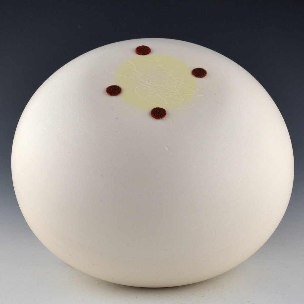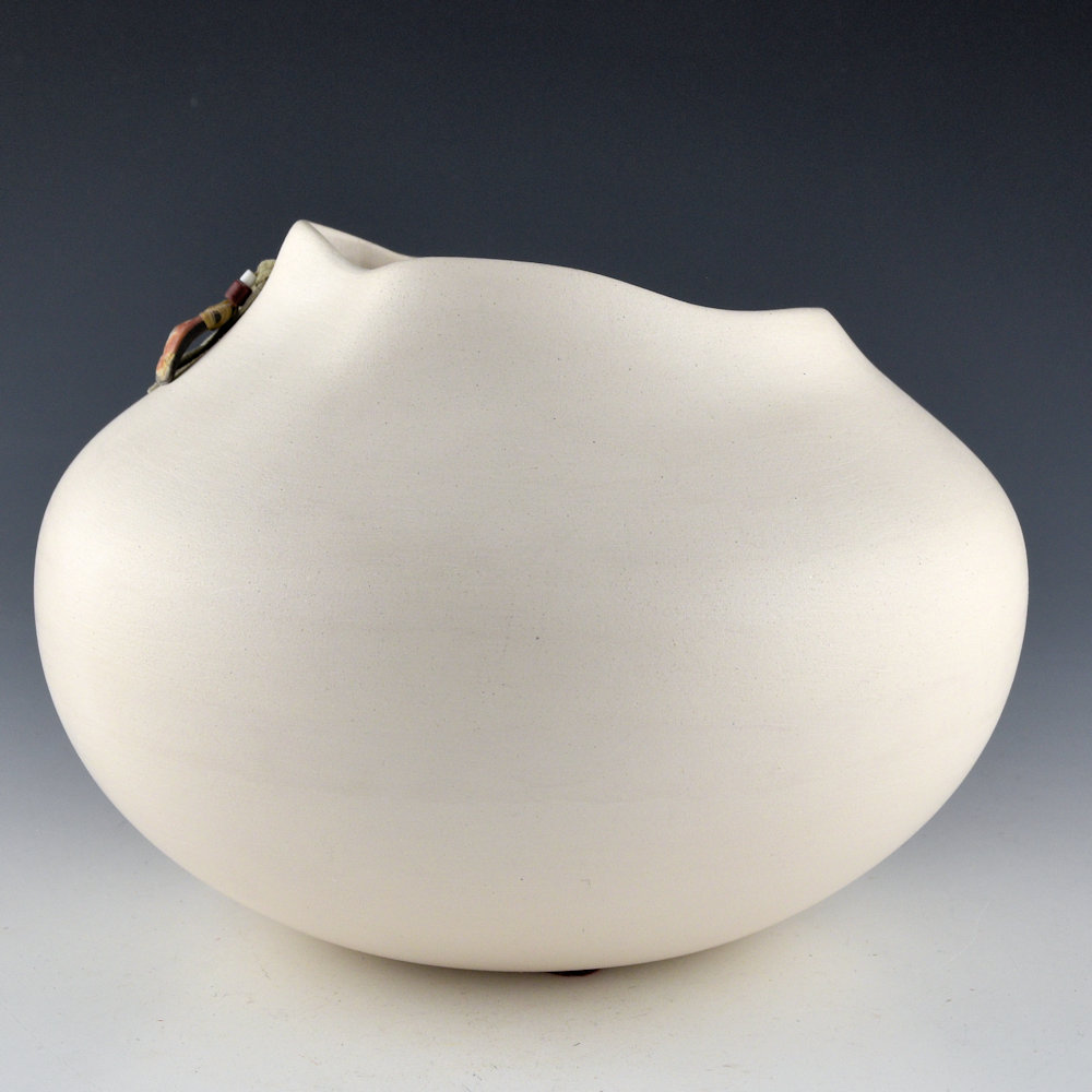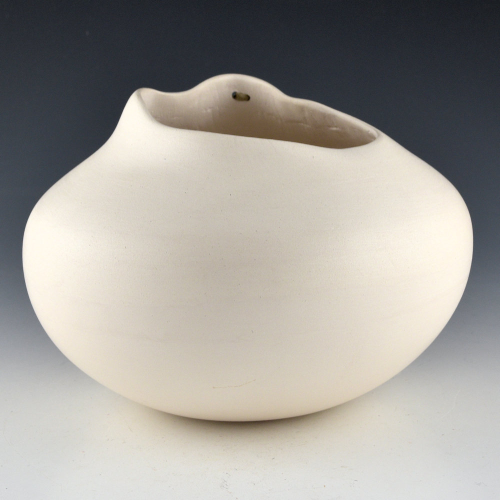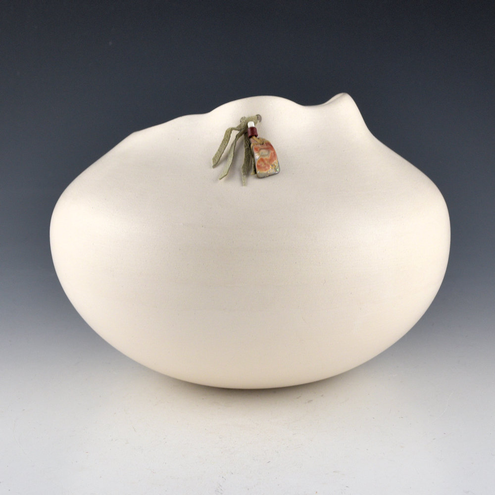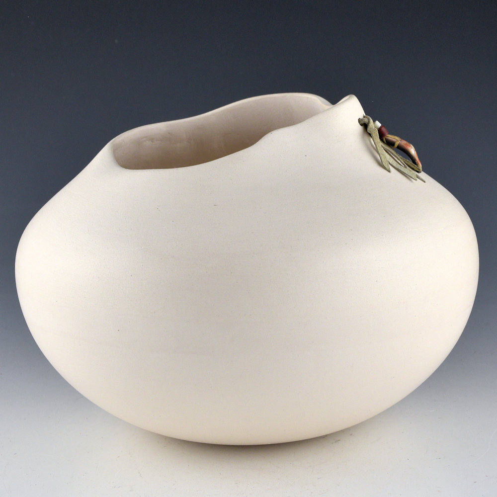 Jacquie Stevens is best known for the simple use of forms on her pottery.  Over the years she brought an unexpected dimension to Native pottery with her immense, undulating vessels. Her Winnebago (Ho-Chunk) ancestry inspired her to add basket weaving and other materials as embellishments to her undecorated forms. Her aesthetic of the organic challenges the symmetry of Pueblo pottery and provides a provocative glimpse into the future of Native pottery.  This jar is one which she used to call her “Bag” jars. The form is reminiscent of a bag with asymmetric sides and openings.  The rim has a single hole laced with leather and beads. The jar has an asymmetric rim and it is thin-walled.  This jar is made from white micaceous clay.  The piece is in excellent condition with no chips, cracks, restoration, or repair.  It is signed on the bottom in the clay, “Jacquie Stevens”.