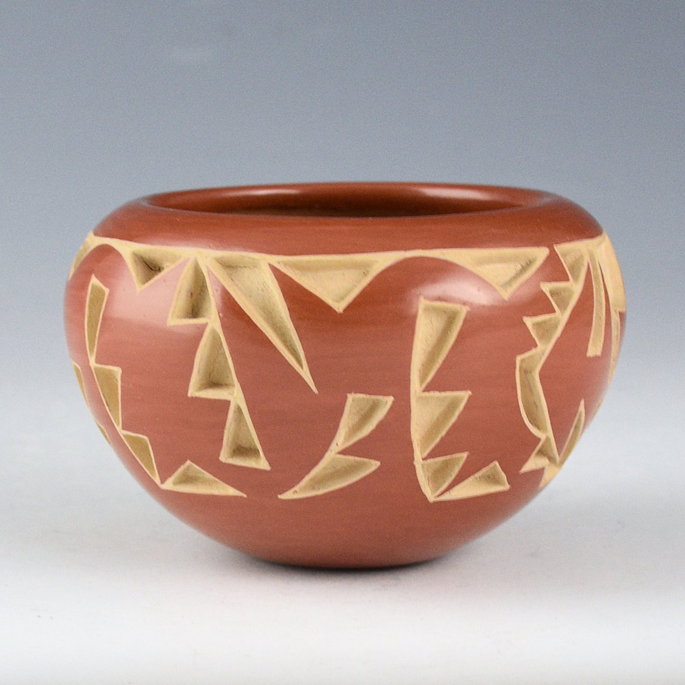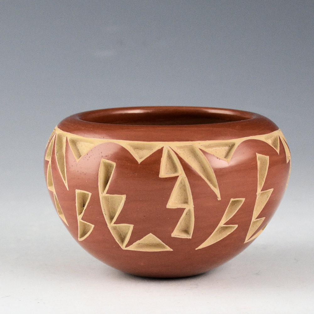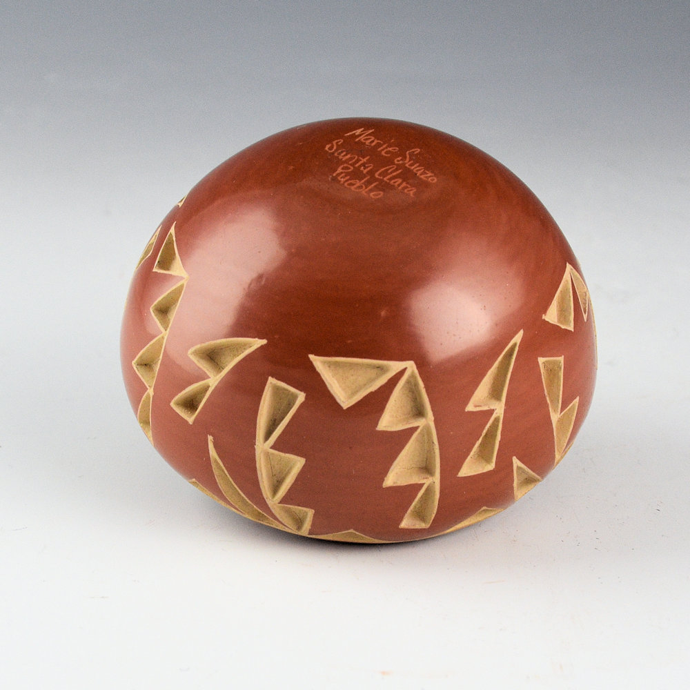 Marie Suazo is a granddaughter of noted potter Rosita Velarde and a daughter of Teresa Gutierrez. She is a sister of potters Carol Velarde and Doris Tenorio. She is known for her deeply carved pottery and use of complex designs. This bowl is one of her few red pieces. It is highly polished and it is very deeply carved. The design is an avanyu that encircles the bowl. The recessed area from the carving has a cream-colored clay slip which she also uses to outline the carved designs. The result is that the design detail is accentuated. It is signed on the bottom in the clay, “Marie Suazo”. It is in excellent condition with no chips, cracks, restoration, or repair.