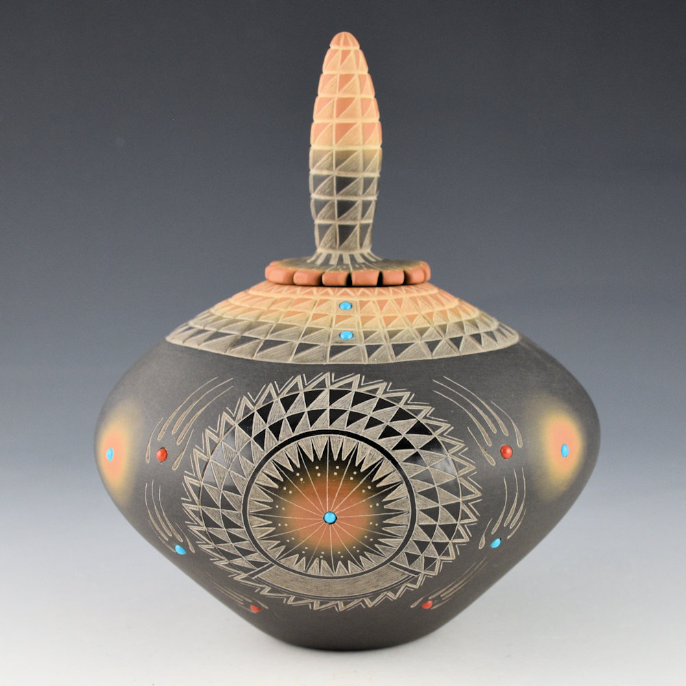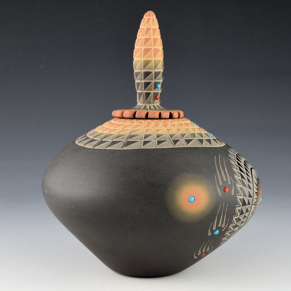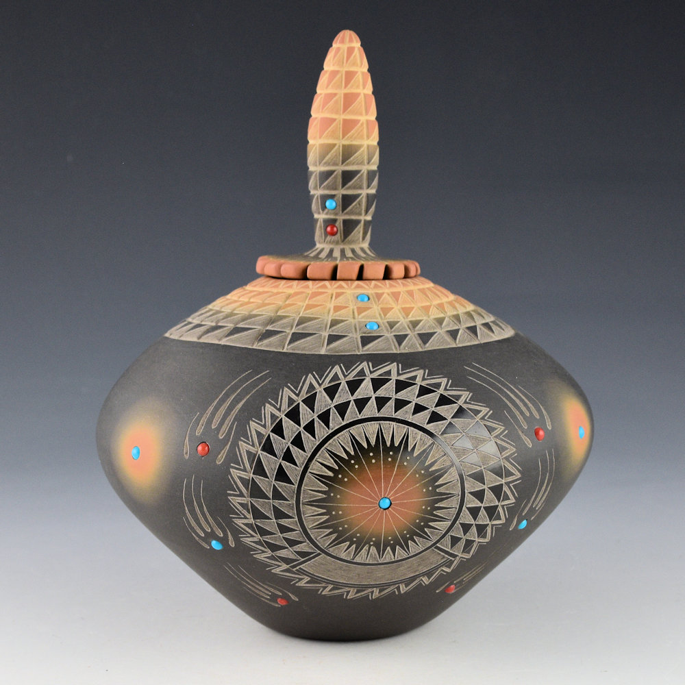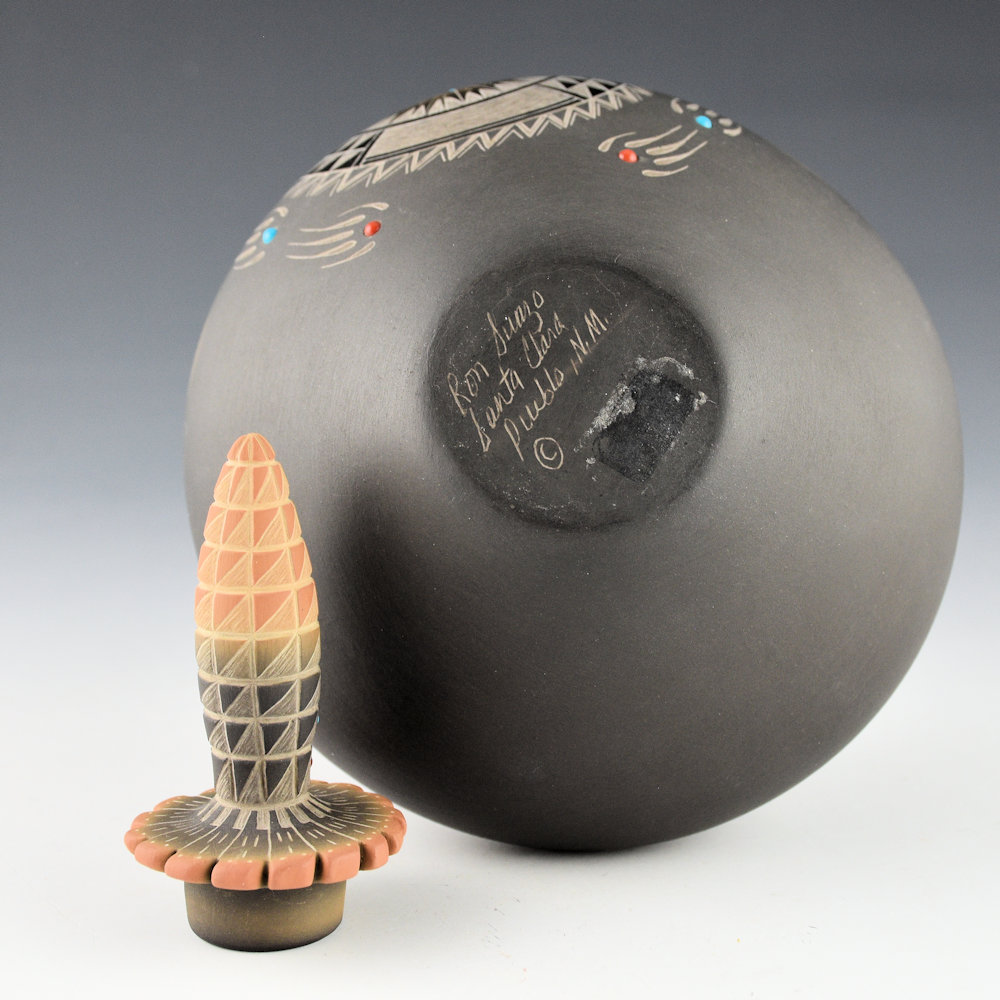 Ron Suazo learned to make pottery from his mother, Clara Suazo. His sister is Margaret Garcia. He said of his work, “As a result of studying both traditional and early designs, my decision was to create my own style, yet include a combination of both, with feather designs, bear paws, and early designs with inlaid turquoise and coral stones on both completely polished black pots, and on matte finish pottery.”. This jar has a round shape and a polished front. The front polished medallion is etched with a starburst pattern. It is surrounded by six bear paws. The neck of the jar is etched with four rows of mountain designs. The jar was fired black and then two-toned in areas sienna. There are two turquoise stones in the neck of the jar. The bear paws are inset with coral and turquoise. There are small sienna medallions with inset turquoise. There is another single inset piece of turquoise in the center of the polished medallion. The lid for the piece is very unusual, as it is carved in the shape of an ear of corn, fully etched, and then fired black and two-toned sienna. There is an additional coral and turquoise inset for the lid. The jar is signed on the bottom in the clay, “Ron Suazo”. It is in excellent condition with no chips, cracks, restoration or repair.
