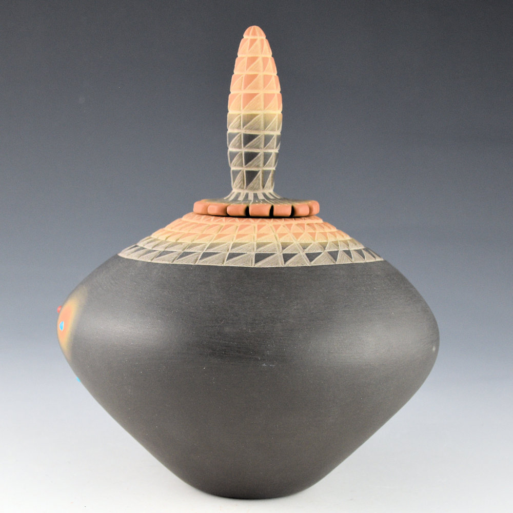 Suazo, Ron – Black and Sienna Jar with Stones and Corn Lid (1990s)