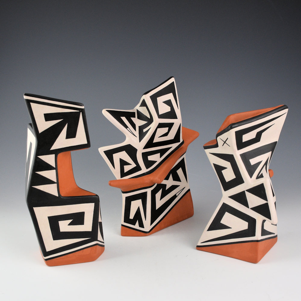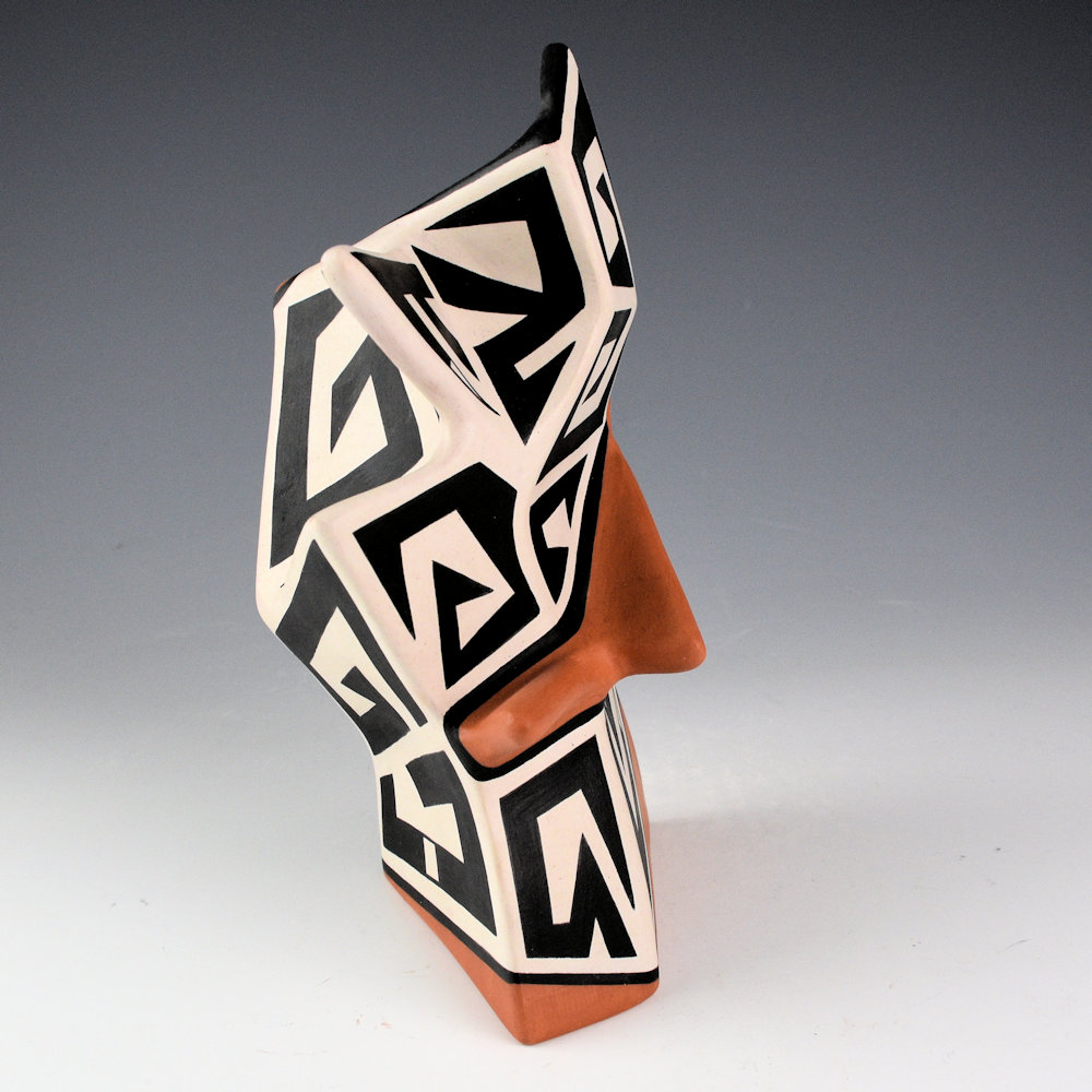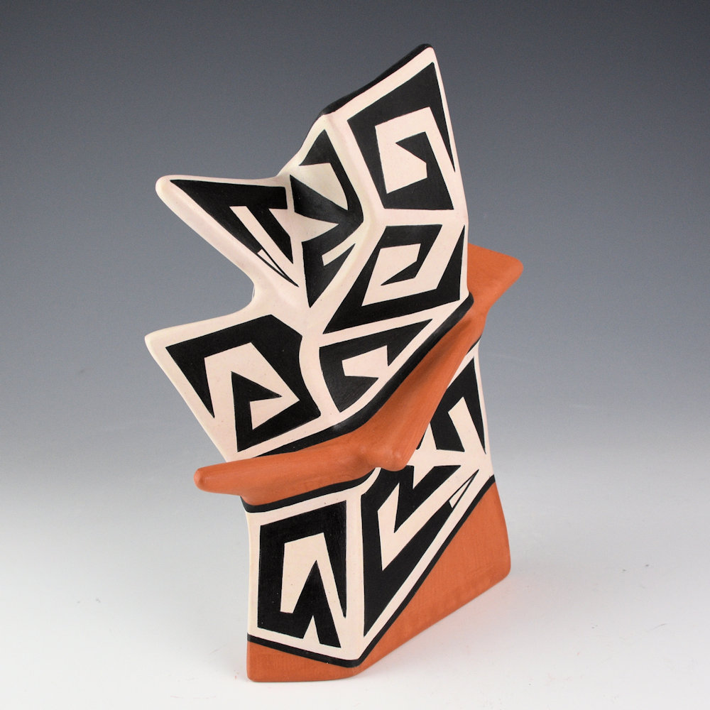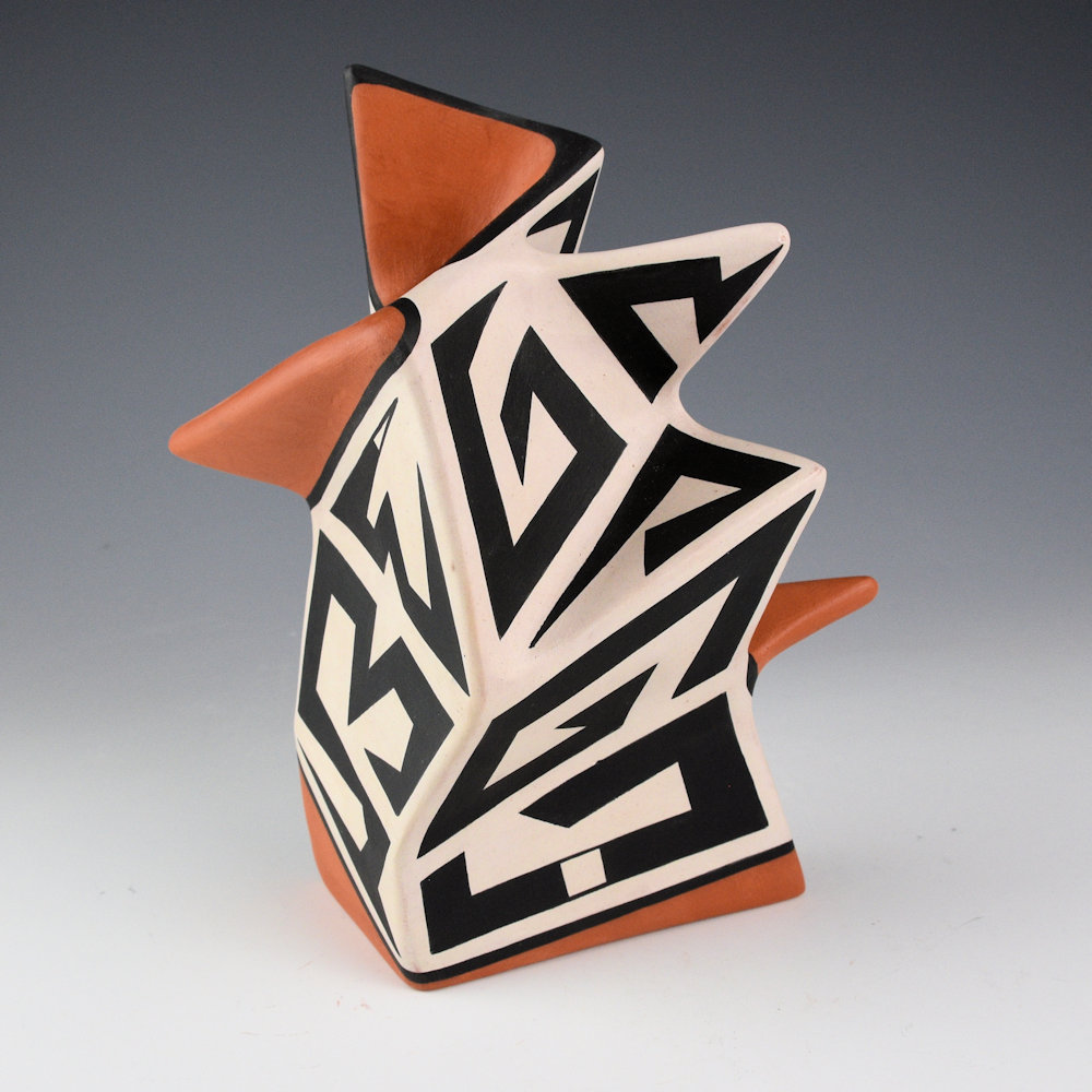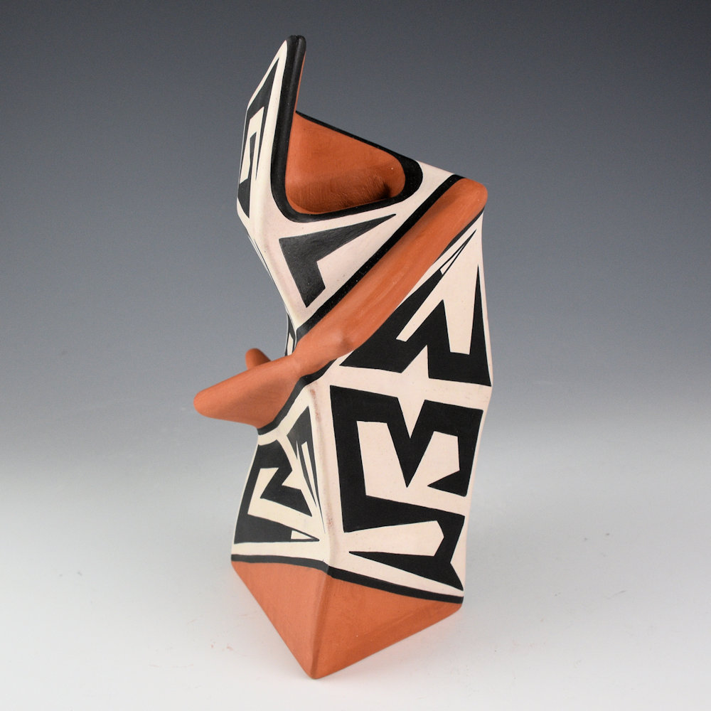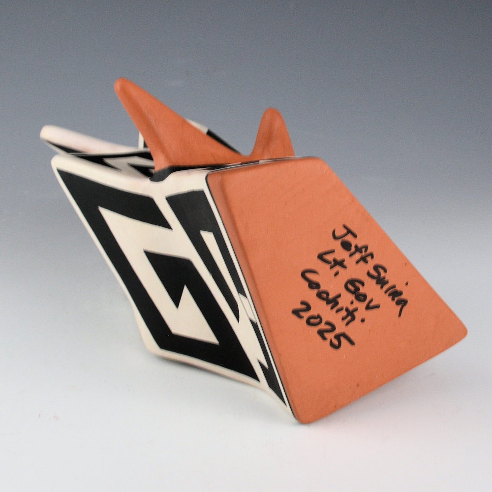 Jeff Suina works in clay and multi-media. Each piece is made from clay and painted with mineral clays for the design. This is one of his creative sculptural pieces. The jar is slab-built to create the flat sides. The piece is entitled “Edge”. The name comes from the extend red slipped “edge” that encircles the piece. The sections are graphically painted with classic Cochiti angular mountain designs. The contrasting positive and negative spaces are visually striking to the eye. The piece is signed, “Jeff Suina”.