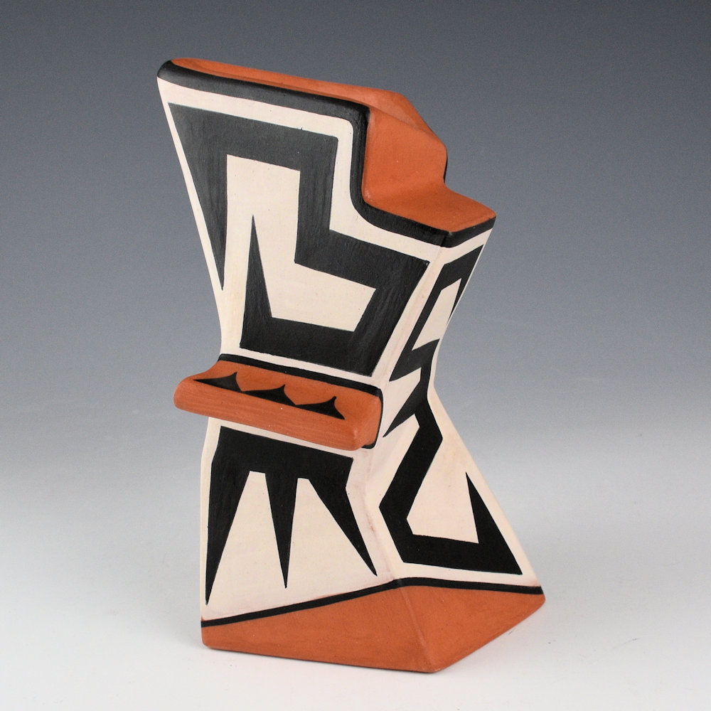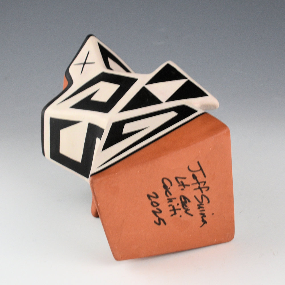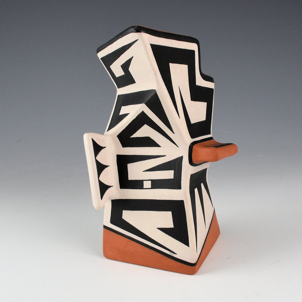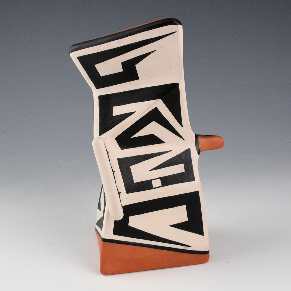 Jeff Suina works in clay and multi-media. Each piece is made from clay and painted with mineral clays for the design. This is one of his creative sculptural pieces. The jar is slab-built to create the flat sides. The piece is entitled “Gray Haven”. The piece has extended ridges at various angles. It is a creative form with a sharp appearance. The sections are graphically painted with classic Cochiti angular mountain designs. The contrasting positive and negative spaces are visually striking to the eye. The piece is signed, “Jeff Suina”.