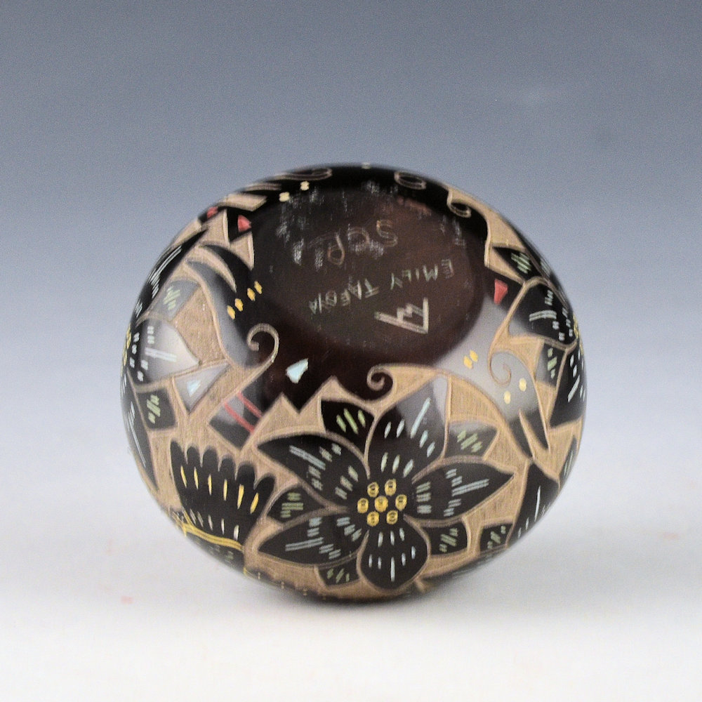 Emily Tafoya was the wife of noted potter Ray Tafoya and is the mother of Jennifer Tafoya. Each piece is coil-built, stone-polished, traditionally outdoor-fired, and then etched with designs. This seed jar is round in shape with a small neck. The entire piece is fully polished and fired black. There are two hummingbirds and flowers etched into the clay. They are surrounded by cloud, rain, and water designs. The entire piece is fully designed and then highlighted with additional clay slips for more coloration. It is signed on the bottom, Emily Tafoya.