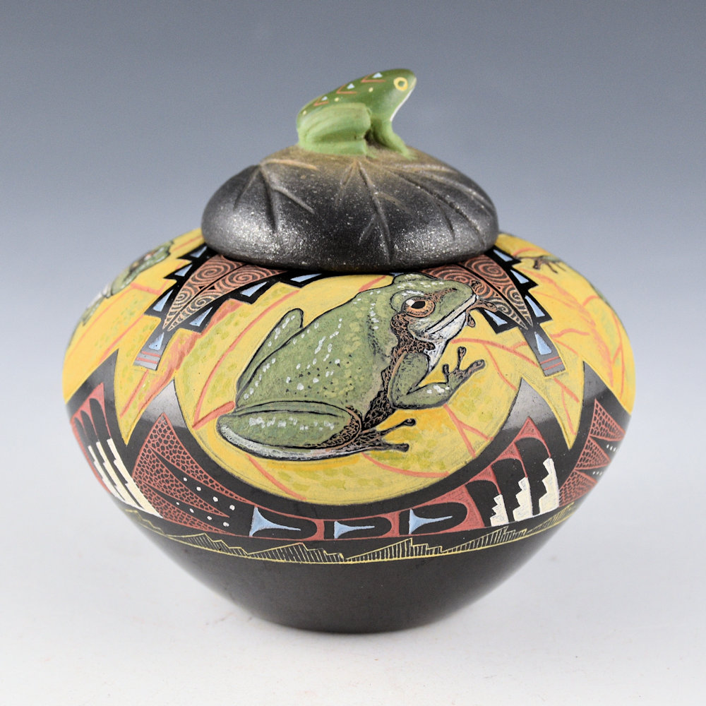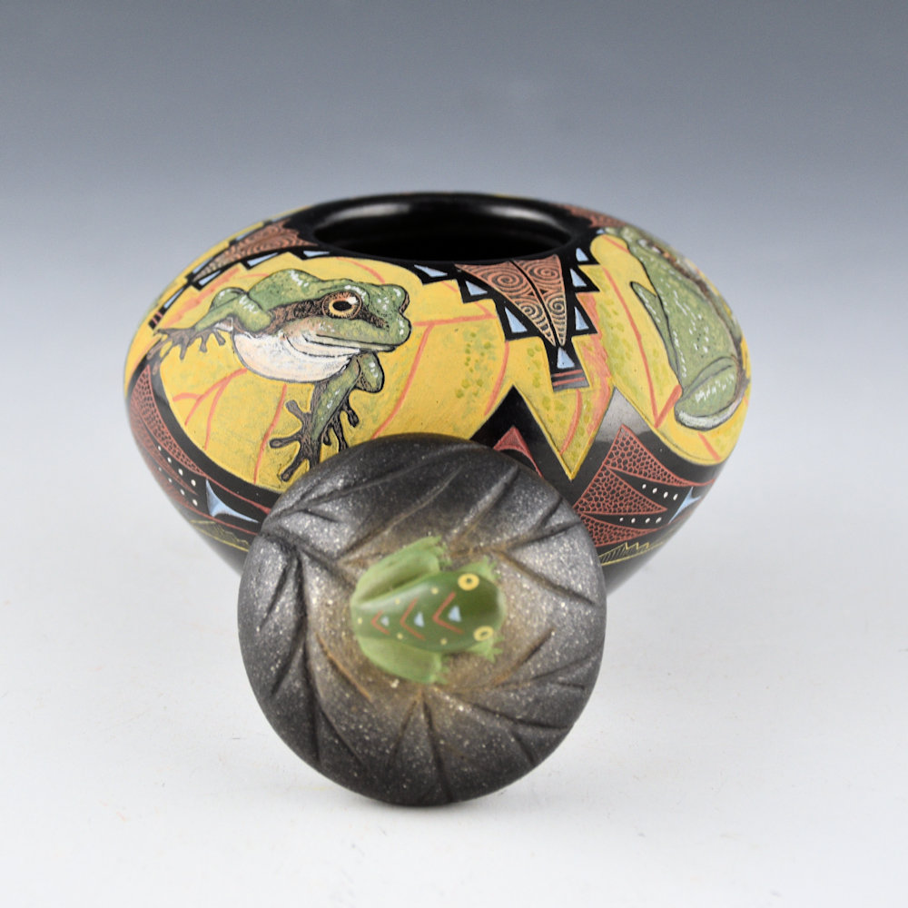 This is a creative bowl by Jennifer Tafoya.  The piece is round and fully polished.  On the top half, there are four Grey Tree Frogs, each on a leaf.  What is hard to see is that they way she has etched the leaves, the frogs appear to be on a raised surface!  It is a great optical illusion.  Each frog is highly detailed and note the details in the eyes!  They are surrounded by tiny etched geometric designs.  The bowl has a lid that is carved with leaves and there is a green polished frog on top!  It is also etched.  All the colorations are derived from natural clay slips.  It is signed on the bottom in the clay, “Jennifer Moquino”.  It is in excellent condition with no chips, cracks, restoration, or repair.  Jennifer continues to be one of the leading innovative potters working today!  She most recently won the “Tony Da Award” for innovative pottery at Santa Fe Indian Market in 2019 and “Best of Show” in 2023 and “Best of Pottery” in 2025!