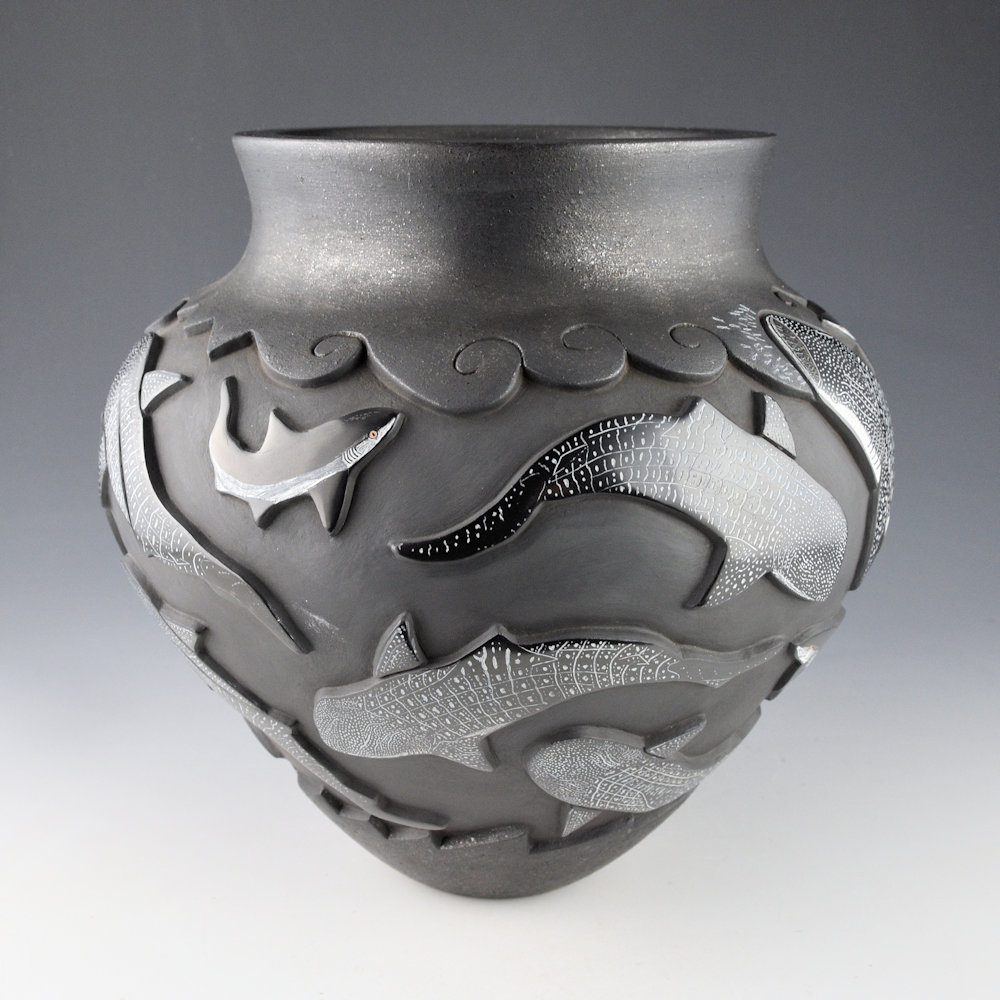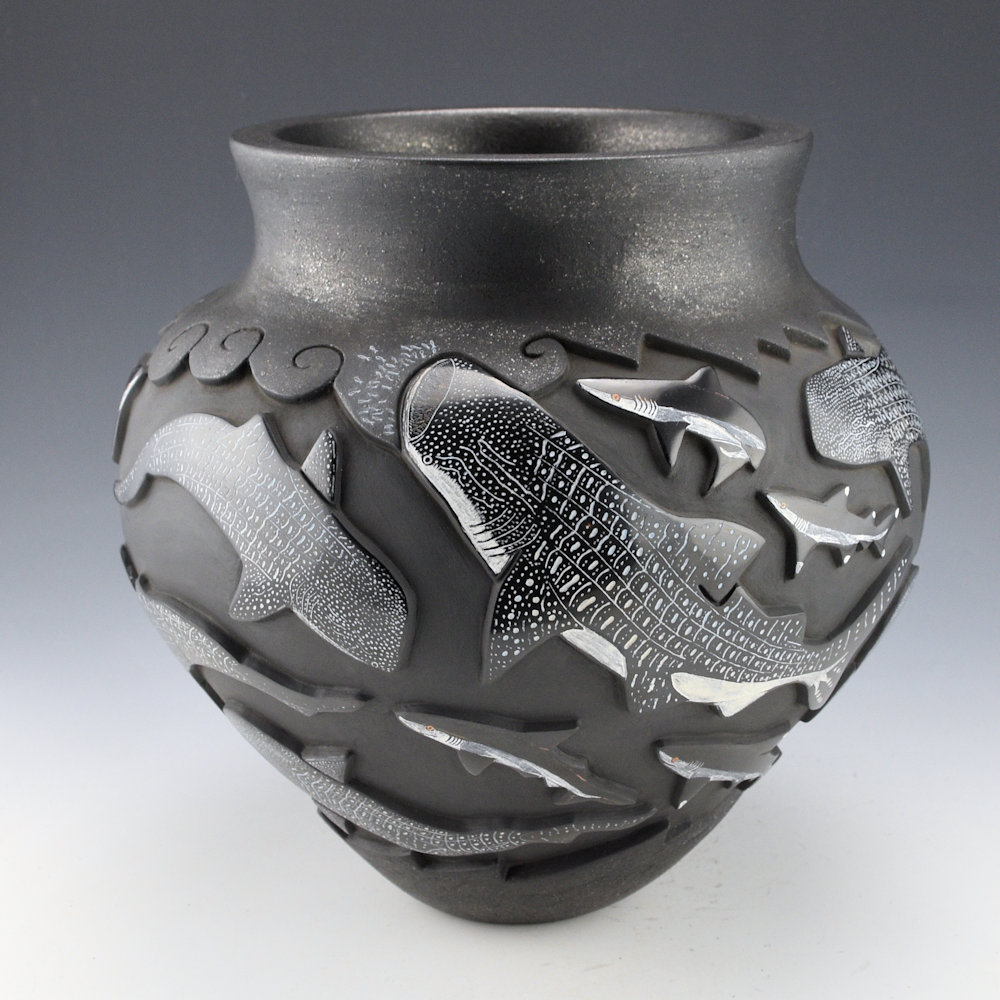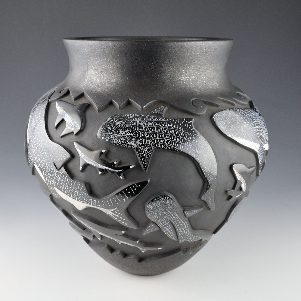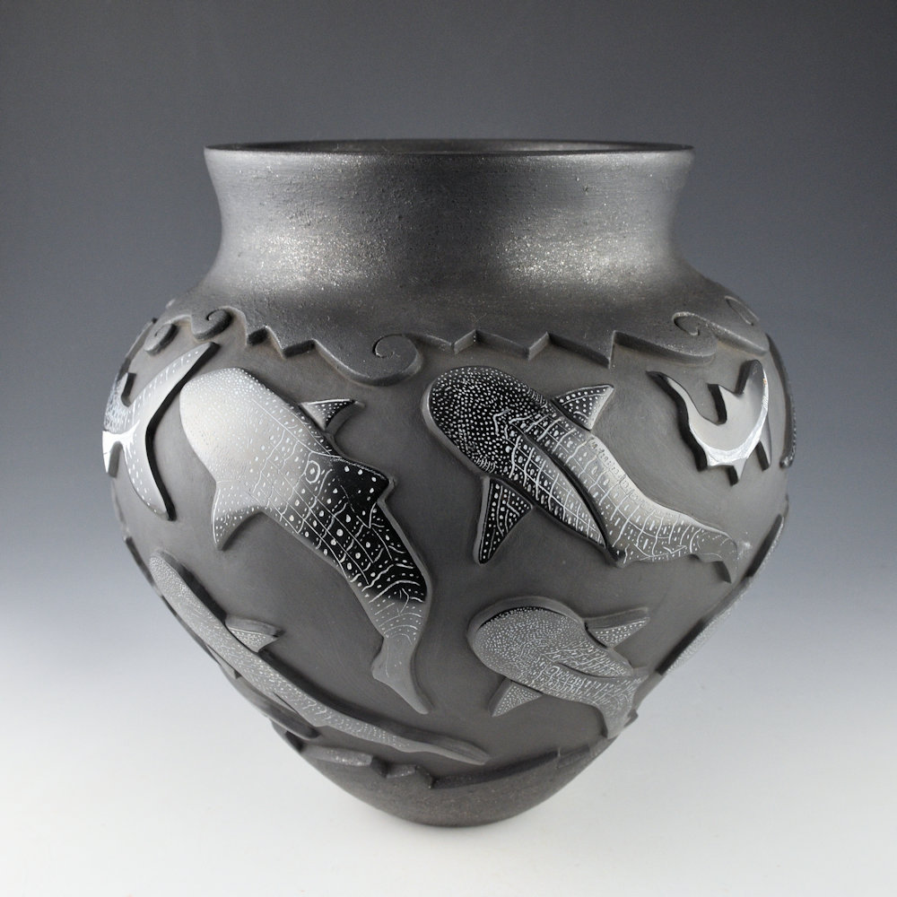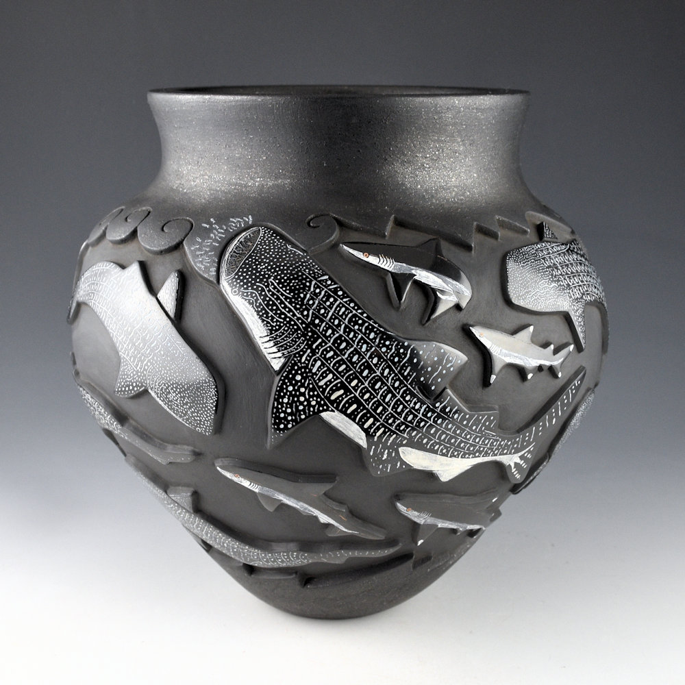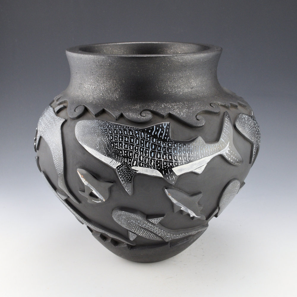 This is an elegant collaborative piece by Christopher Youngblood and Jennifer Tafoya. The piece is a water jar, with a high, round shoulder and a turned-out neck. The neck and base are both slipped with mica. What you can’t see is what you can feel, the jar is thin-walled for the size and depth of carving! There are 21 Whale Sharks and sharks carved into the piece. Each is fully polished and etched with designs. There is a beautiful flow of the sharks across the jar. I didn’t realize until I saw the piece in person is the amount of subtle coloration Jennifer added to the etched designs. The large whale sharks have blues and white in their complicated scales that are stunning! The jar was fully polished and then it was fired a deep, glassy black. After the firing, the jar was etched with a design and painted with clay slips by Jennifer. The details etched by Jennifer is exceptional! She creates such beauty in her realism. It is a creative vessel, but striking in design and amazing in the complexity of its levels of carving. It is signed by both Chris and Jennifer.