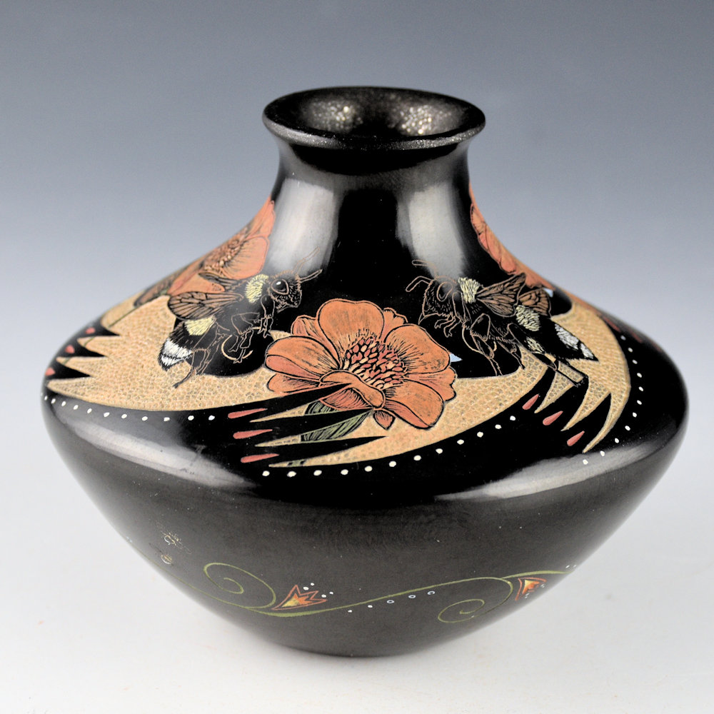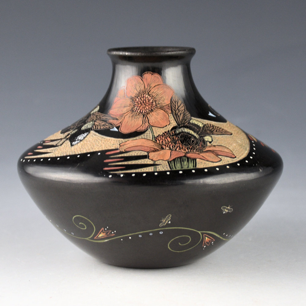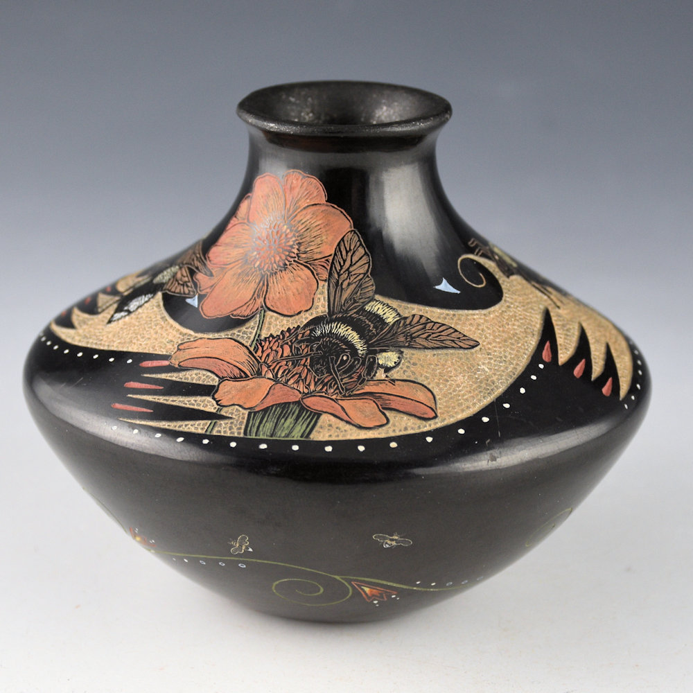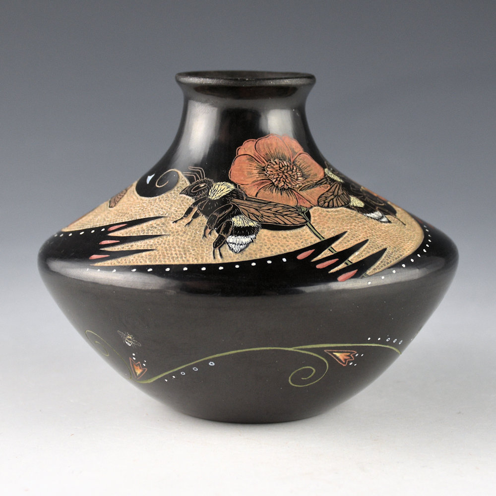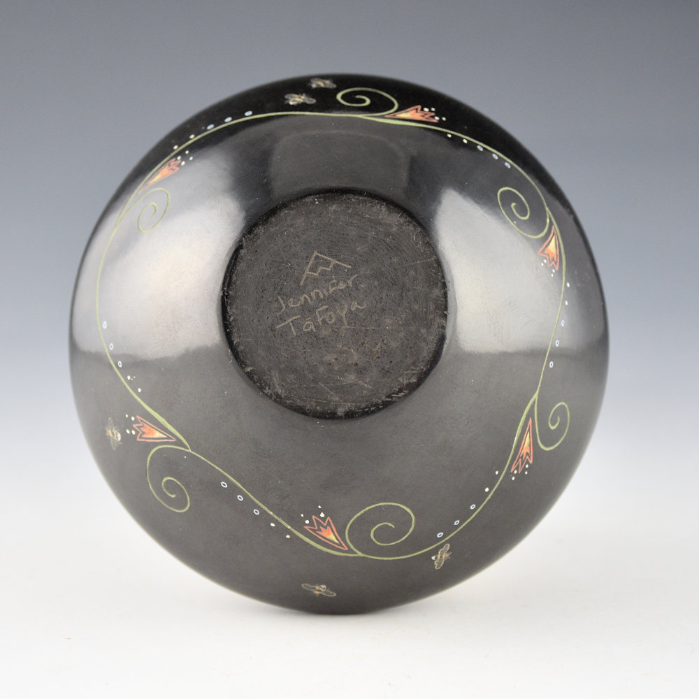 Jennifer Tafoya is known for her clay vessels and also her amazing animal figures! This jar has a square shape and an elongated neck. The jar is fully polished and the inside of the neck is slipped with mica. The neck of the jar has four etched bees with flowers. They are each realistically depicted with great detail etched into the clay. The background area is more deeply etched with small circles, representing the honeycomb. The bottom of the jar has a series of flowing flowers and tiny etched bees. The jar was fired black and then etched with a design. All the various colors are derived from natural clay slips. It is signed on the bottom in the clay, “Jennifer Tafoya”. Definitely an exceptional piece of her pottery art.