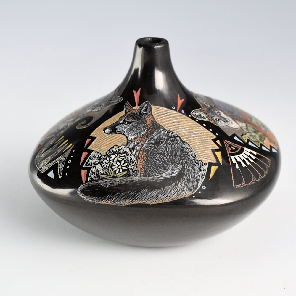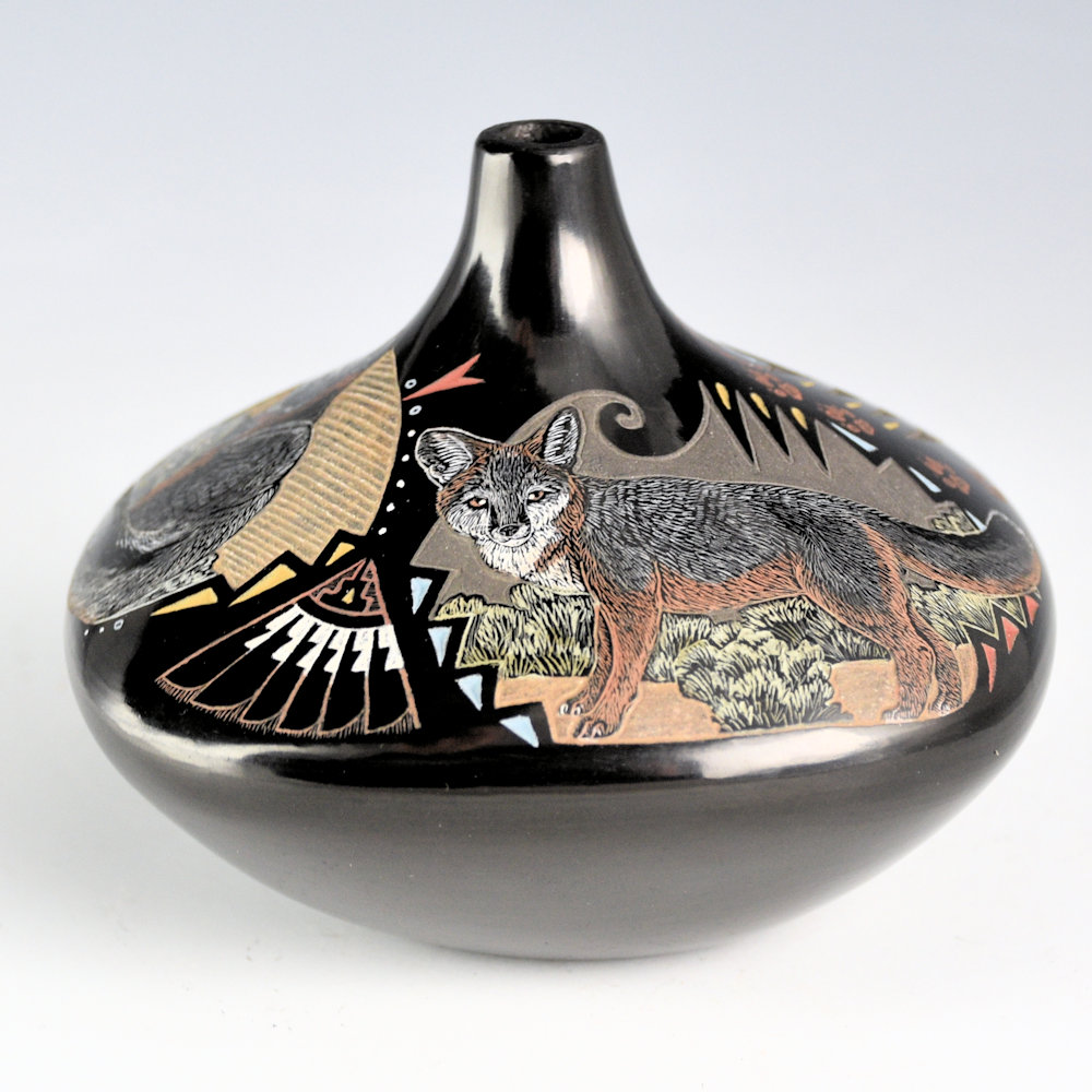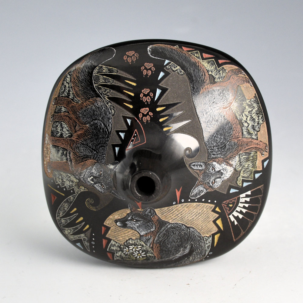 Jennifer Tafoya is known for her intricately etched pottery. Each piece is coil-built, stone polished, and traditionally fired. The designs are etched into the clay, and additional clay colors are added. This jar is square in shape, has an elongated neck. On the top are three Gray Foxes. Each fox is realistic in detail. Did you know Gray Foxes one of the few species of foxes that can climb a tree!?! They do this to hunt for food and escape predators. Sometimes they even make their dens in the trees, though when they have young, they prefer to sleep underground. Each one is depicted in a different position. There are tiny fox tracks etched into the clay leading up to the rim. There are additional feather and cloud designs. The realism is exceptional on this piece. The jar shape, size, and designs work together perfectly on this piece. All the various colors are derived from natural clay slips. The piece is signed on the bottom in the clay, “Jennifer Tafoya”. Jennifer continues to be one of the leading innovative potters working today!