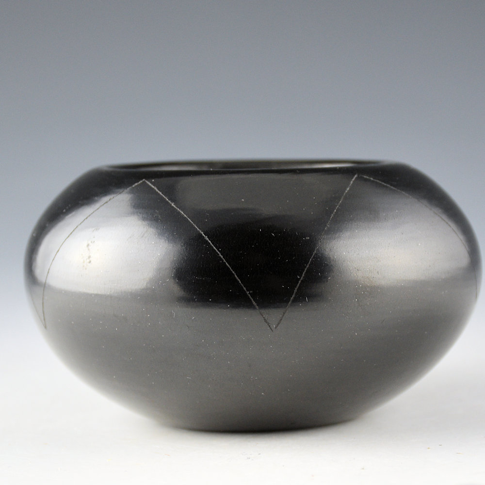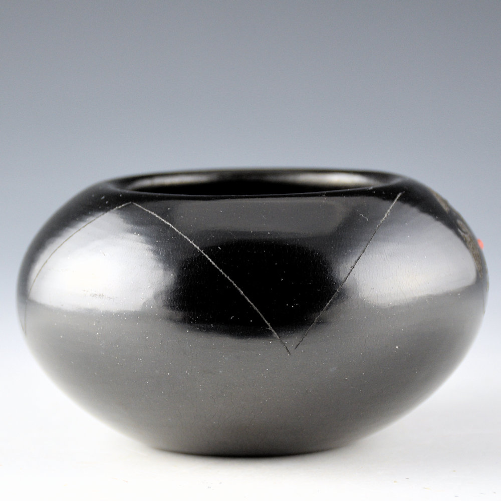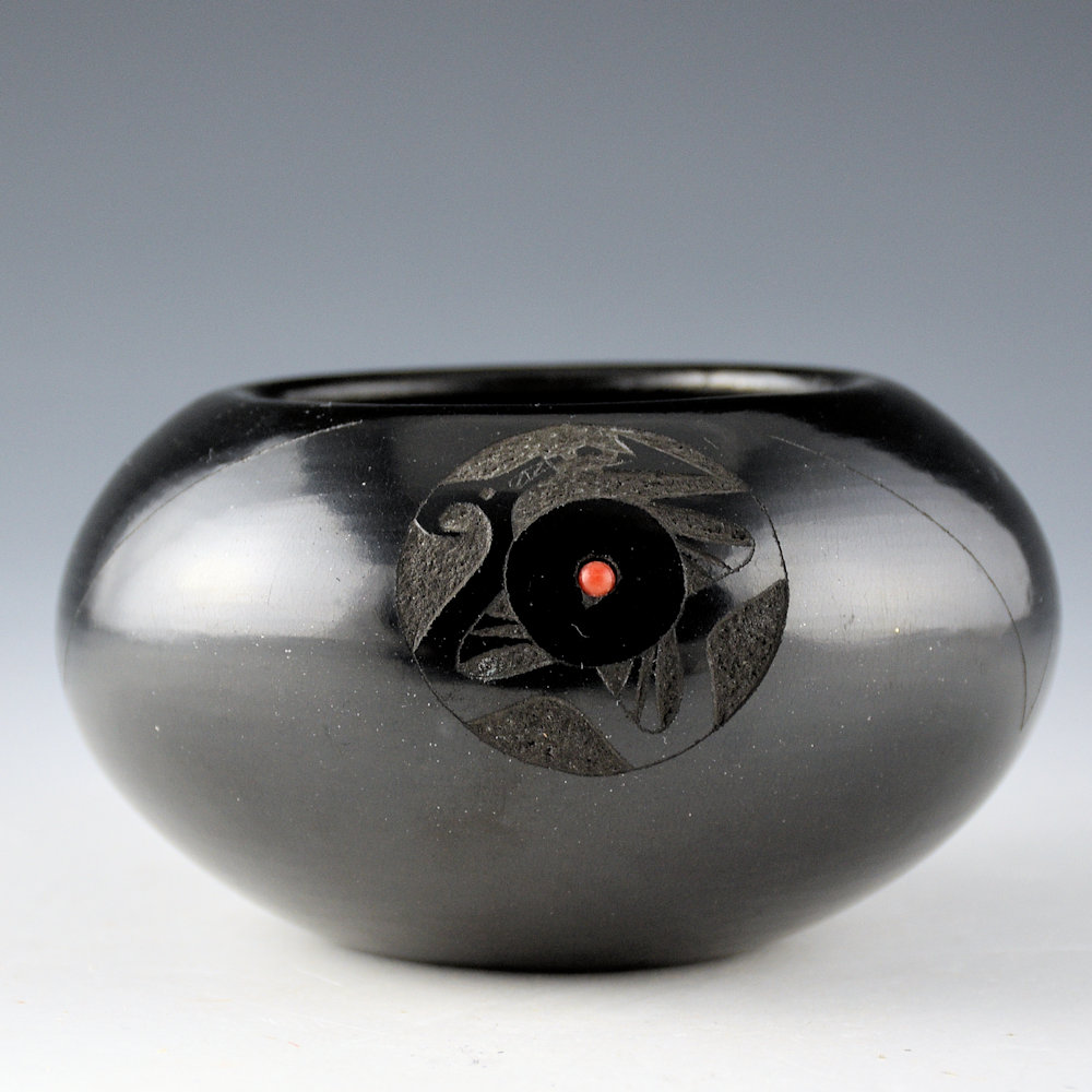 This is a classic bowl Juan Tafoya. It is from 1980. The bowl is coil-built and it is fully polished. It was etched with an avanyu (water serpent) in a medallion on one side. It was fired a deep black coloration. There is a single inset piece of coral in the center of the medallion. The bowl is signed in the clay on the bottom, “Juan Tafoya”. It is in excellent condition with no chips, cracks, restoration, or repair.