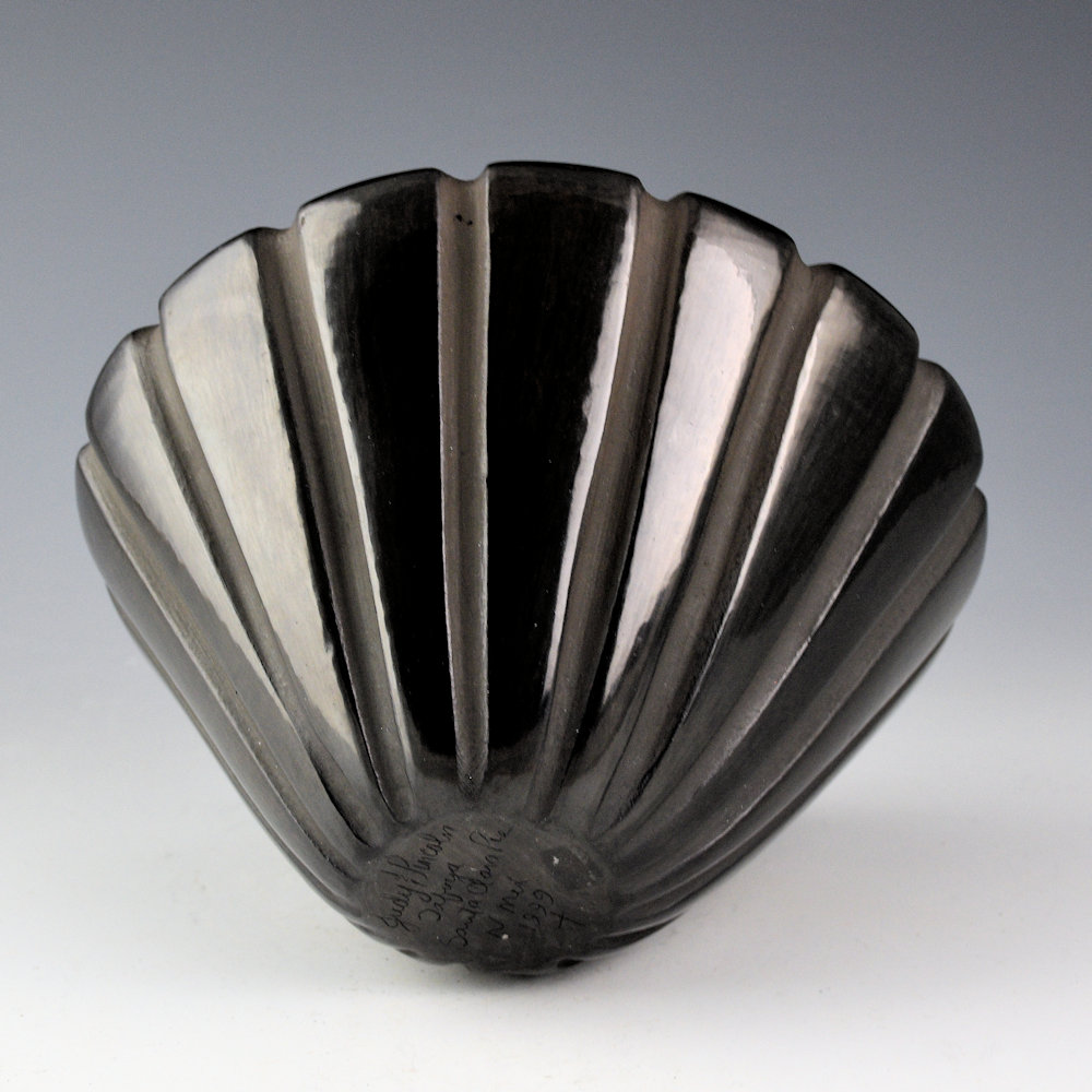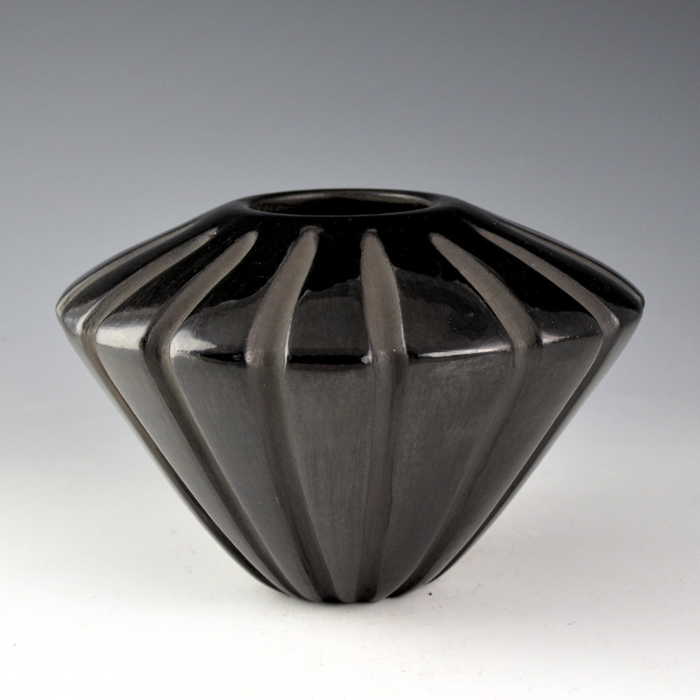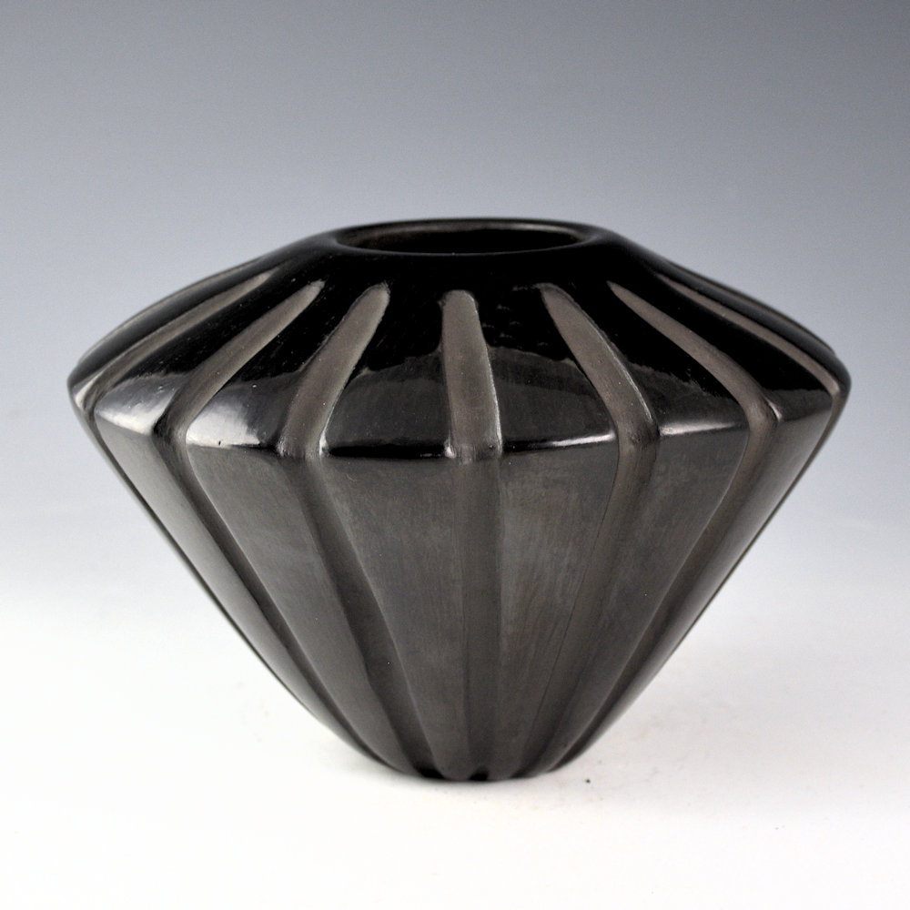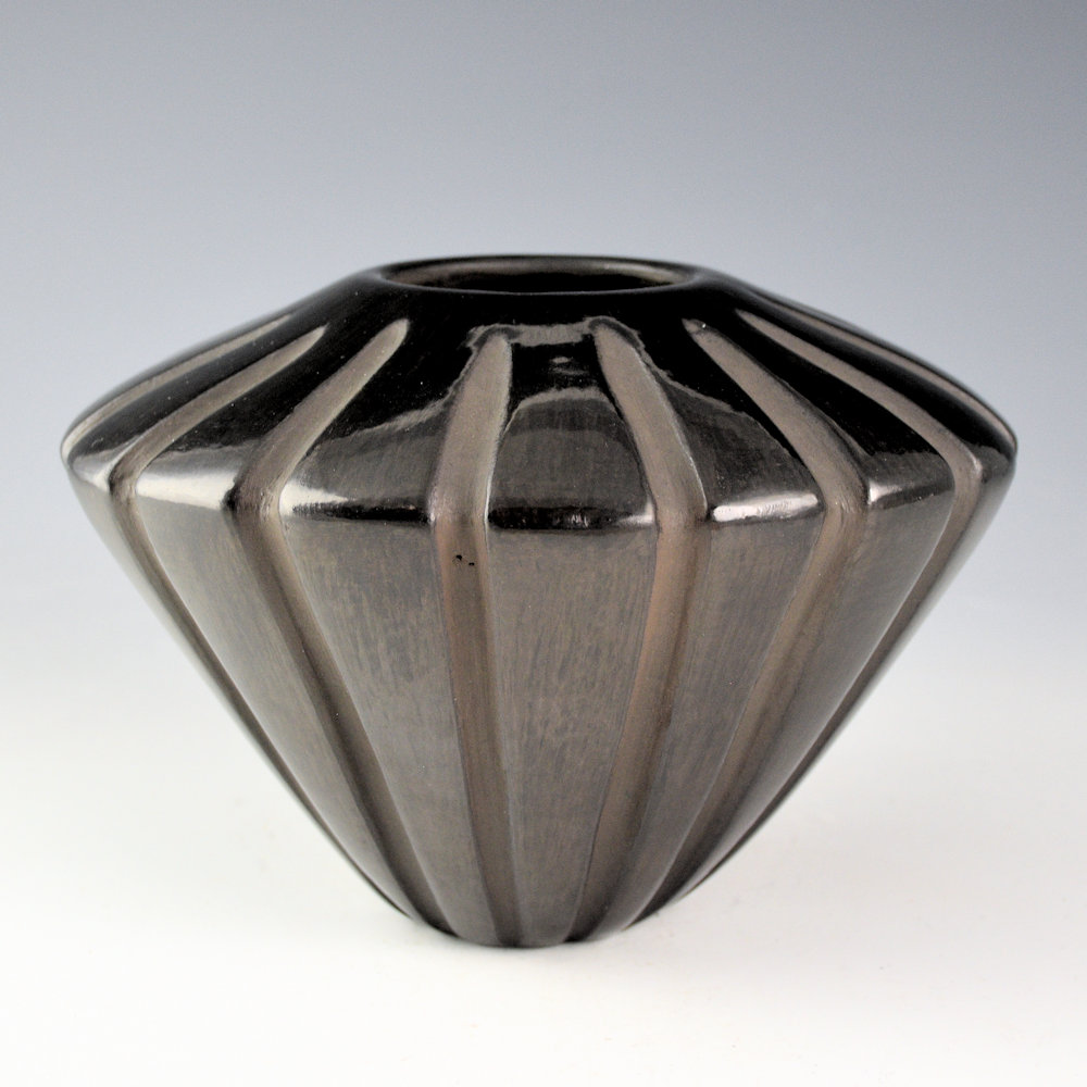Judy and Lincoln Tafoya (1954-2005) worked together for twenty years making pottery. Lincoln learned to make pottery from his sister-in-law Sharon Naranjo Garcia. He was a son of Dan Tafoya and Billie Rose Lee. Judy is a daughter of Cecilia Naranjo and learned to make pottery from her grandmother, Christina Naranjo. Judy began making pottery in 1982 and married Lincoln in 1984. This jar is from 1999. It is coil-built and has a sharp shoulder. There are 16 deeply carved melon ribs on the piece, extending from the rim to the base. Each rib is stone polished. The entire piece is fully polished and fired a glassy brownish-black. It is signed on the bottom in the clay, “Judy and Lincoln Tafoya”. It is in very good condition with no chips, cracks, restoration or repair.