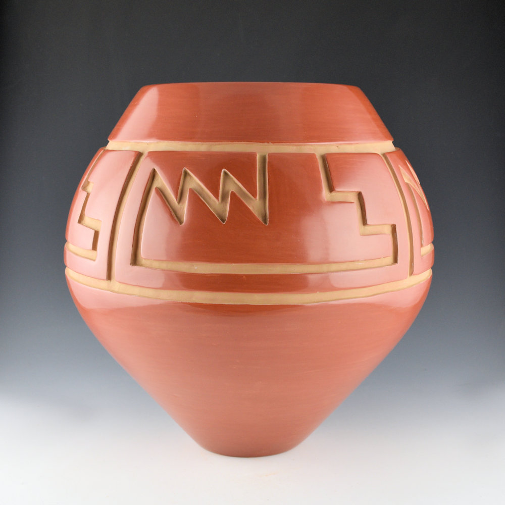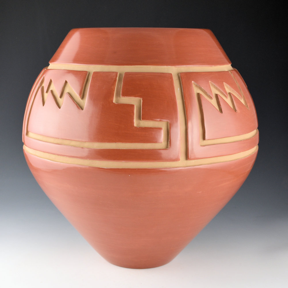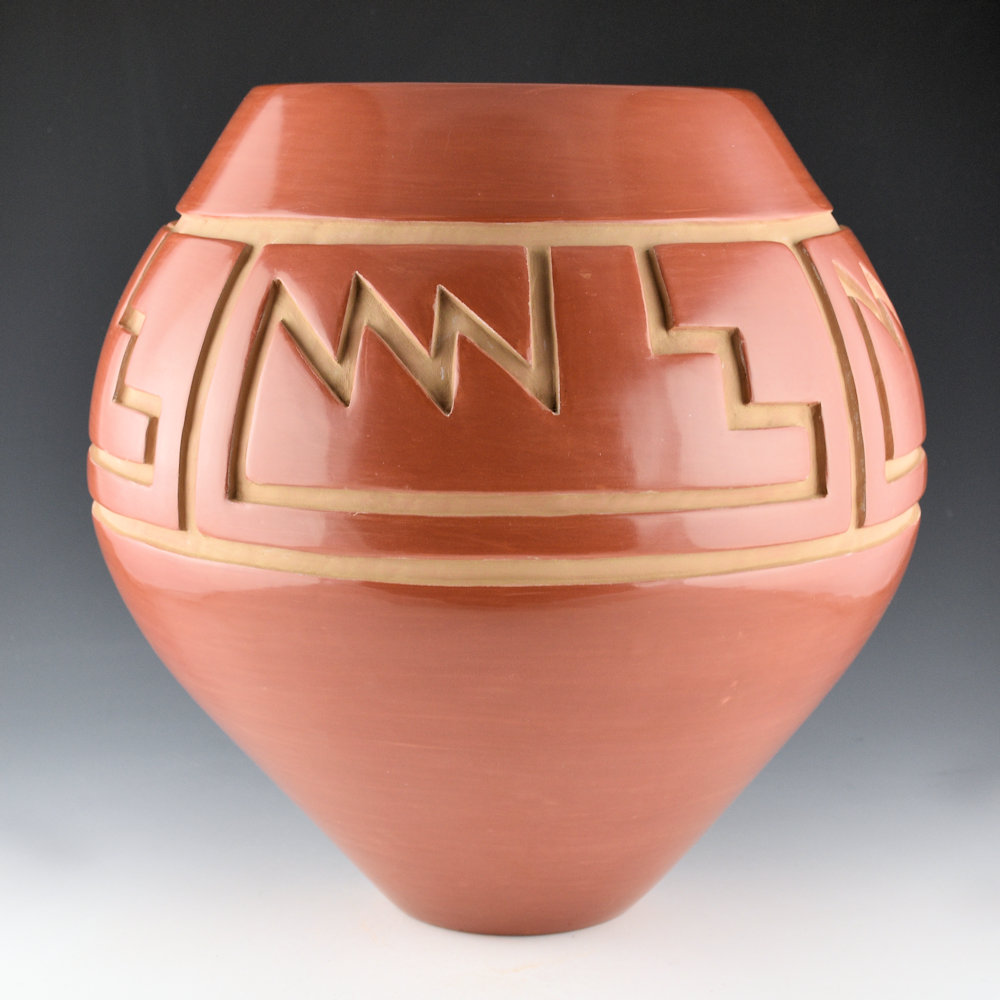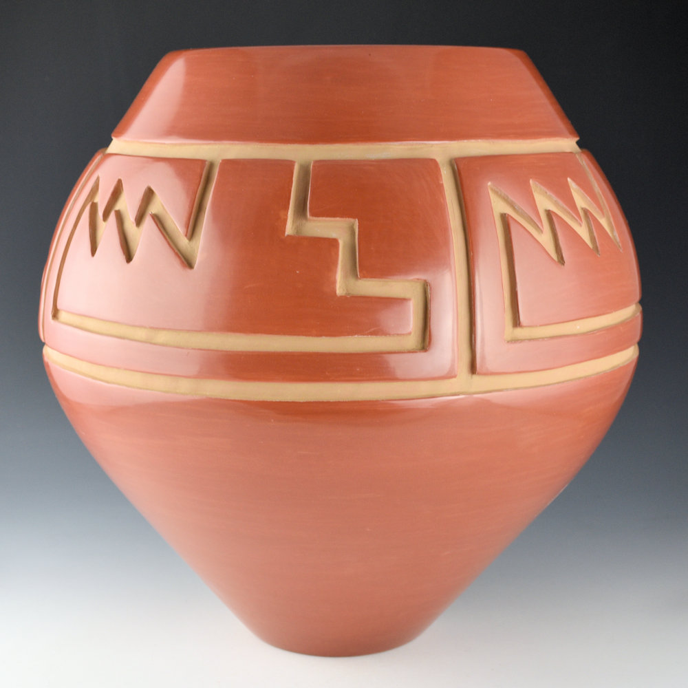 WOW!  This is a spectacular, large jar by LuAnn Tafoya.  She is known for her highly polished traditional Santa Clara pottery.  This jar is one of her famous shapes with a high, round shoulder.  The side of the jar is very deeply carved with four panels of design.  This wide shape creates a large area of carved design.  The jar has interlocking mountain and cloud patterns followed by a mesa design.  I remember she told me that this design represents the clouds coming over the mountains, to the mesa steps.  Then there is lightning and rain falling over the mesas.  The jar has angular carving that captures this creative story.  The jar is highly polished and traditionally fired red.  The piece is surprisingly thin-walled for its size!  LuAnn said about her designs:
