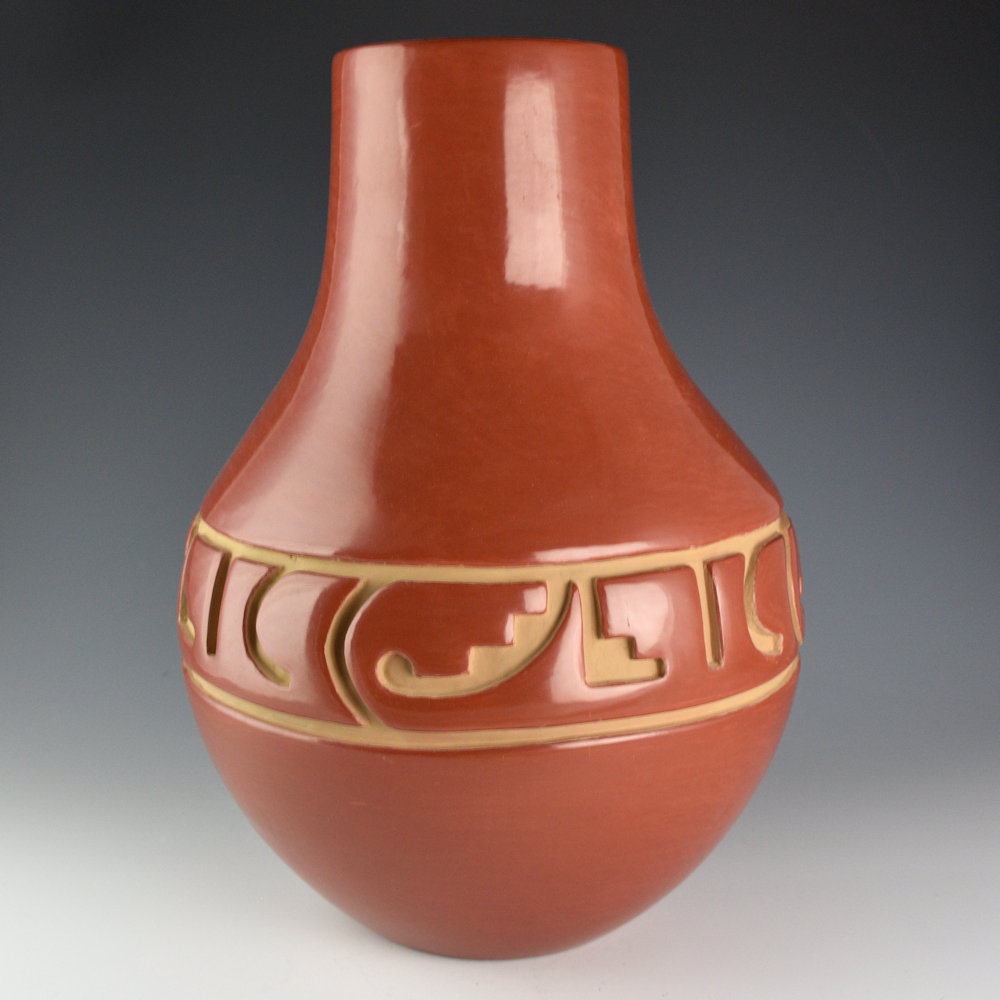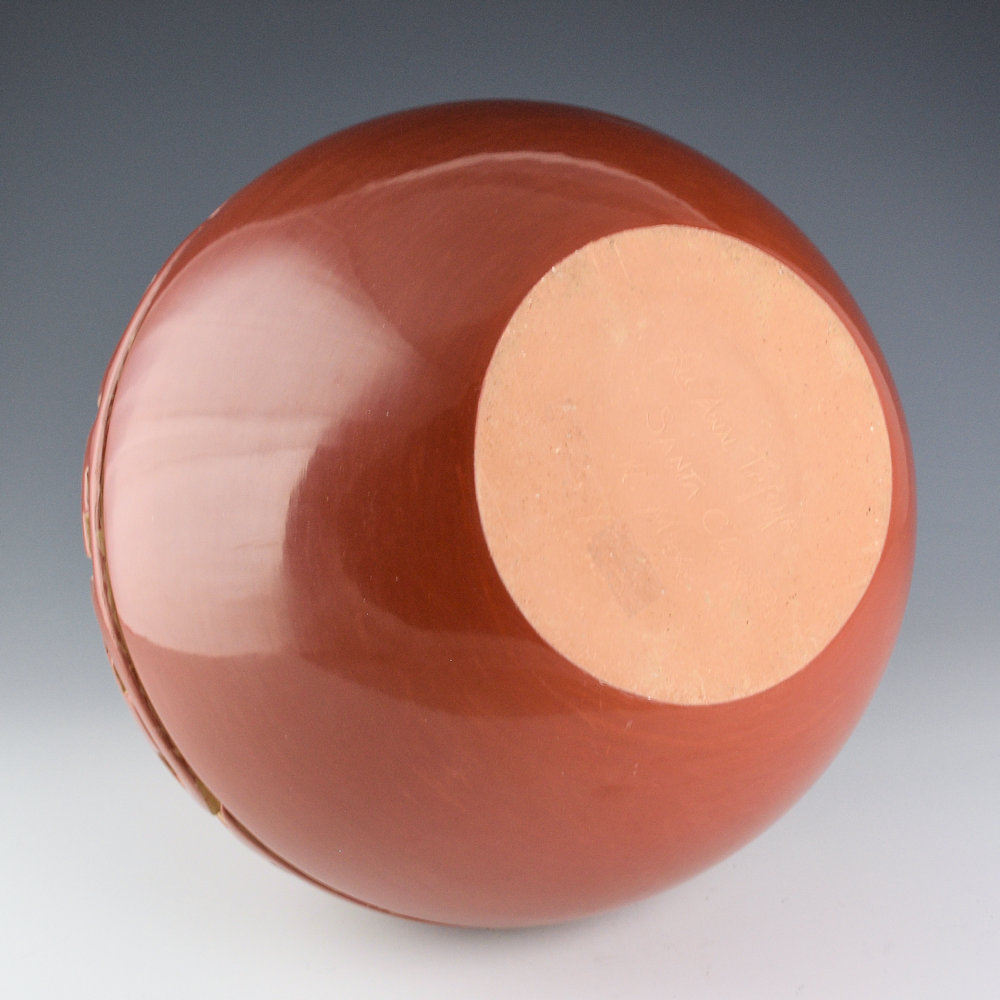 The jar is highly polished and fired a rich red coloration. LuAnn is one of the few potters making pieces of such quality and historic continuity. The jar is signed on the bottom in the clay, “LuAnn Tafoya”. It is an exceptional example of her skill, creativity, and commitment to traditional Santa Clara pottery. It is in excellent condition with no chips, cracks, restoration, or repair. Definitely a piece of history in clay!