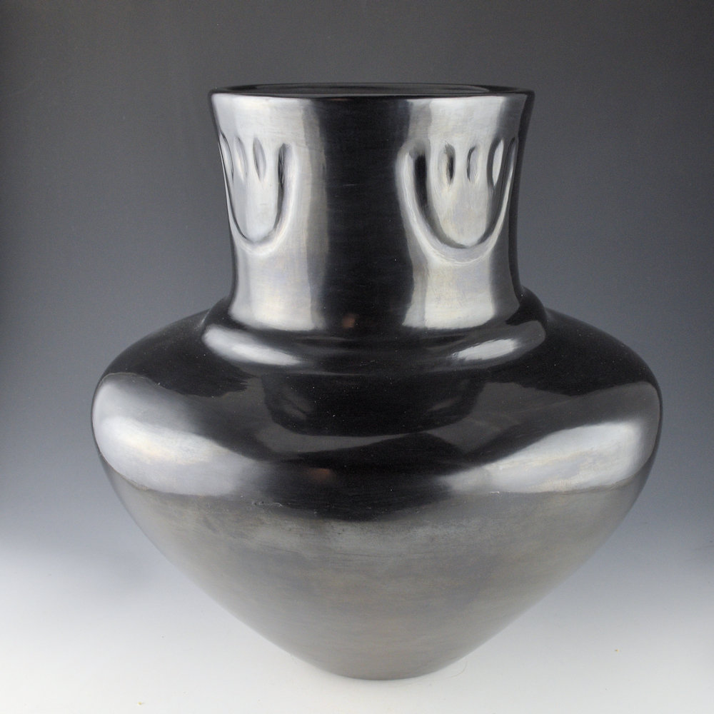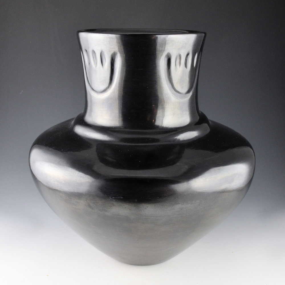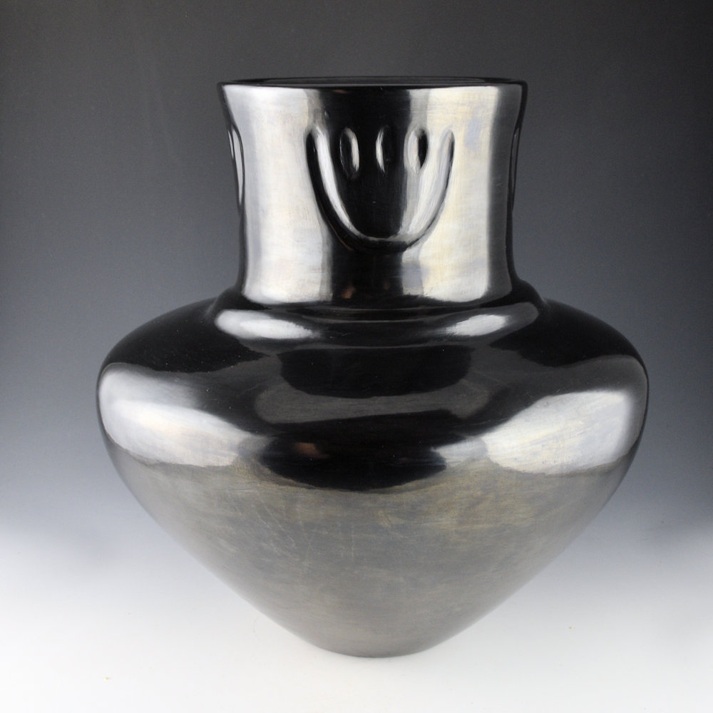 WOW! This is a spectacular water jar by LuAnn Tafoya and her son, Daryl Whitegeese. The jar may well be one of the only pieces that is signed by both LuAnn and Daryl. It was made in 2022 and LuAnn made the jar and Daryl polished the surface. The jar is an elegant shape with a wide shoulder, a rainbow ridge, and an elongated neck. The neck of the jar has four bear paws that are impressed into the clay. The entire piece is fully polished and it was fired a glassy black. LuAnn and Daryl would usually work together at the same table, but always independently, making their pieces. This is one the last large pieces LuAnn made and Daryl helped with the polishing and firing. The result is an amazing piece of history!