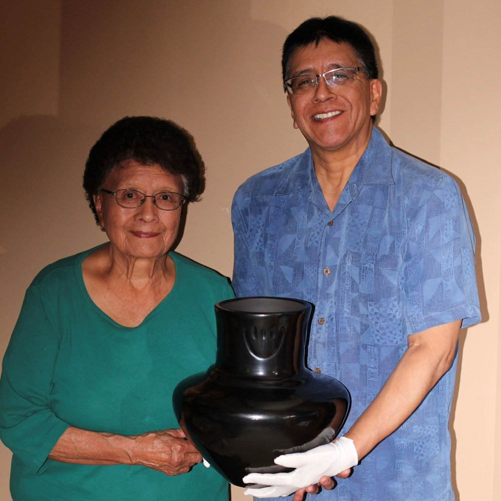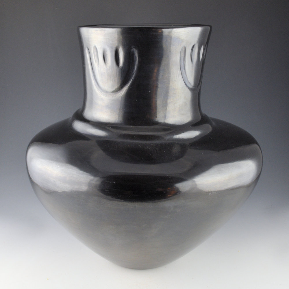 “For the double-band water jar, you have to start polishing early in the morning, and it takes about five or six hours to polish that whole piece. Then, when it’s drying, that’s when I put the bear paw on all four sides. That means the directions of the east, west, south, and north. I have to slip and polish on the whole jar at one time so that I can finish it evenly. It would be impossible to do just half of it. It’s difficult, but you have to polish the whole thing. It is more difficult when you are making the double band on the shoulder of a water jar. When it is wet, what I do, I have to put my hand inside to push the band inward. Using one finger, I place it against the top band from the inside and push it out. Sometimes you push it out a little bit too far, and it cracks. The clay can’t be too dry, and if it’s too wet it won’t hold.” LuAnn Tafoya, Spoken Through Clay