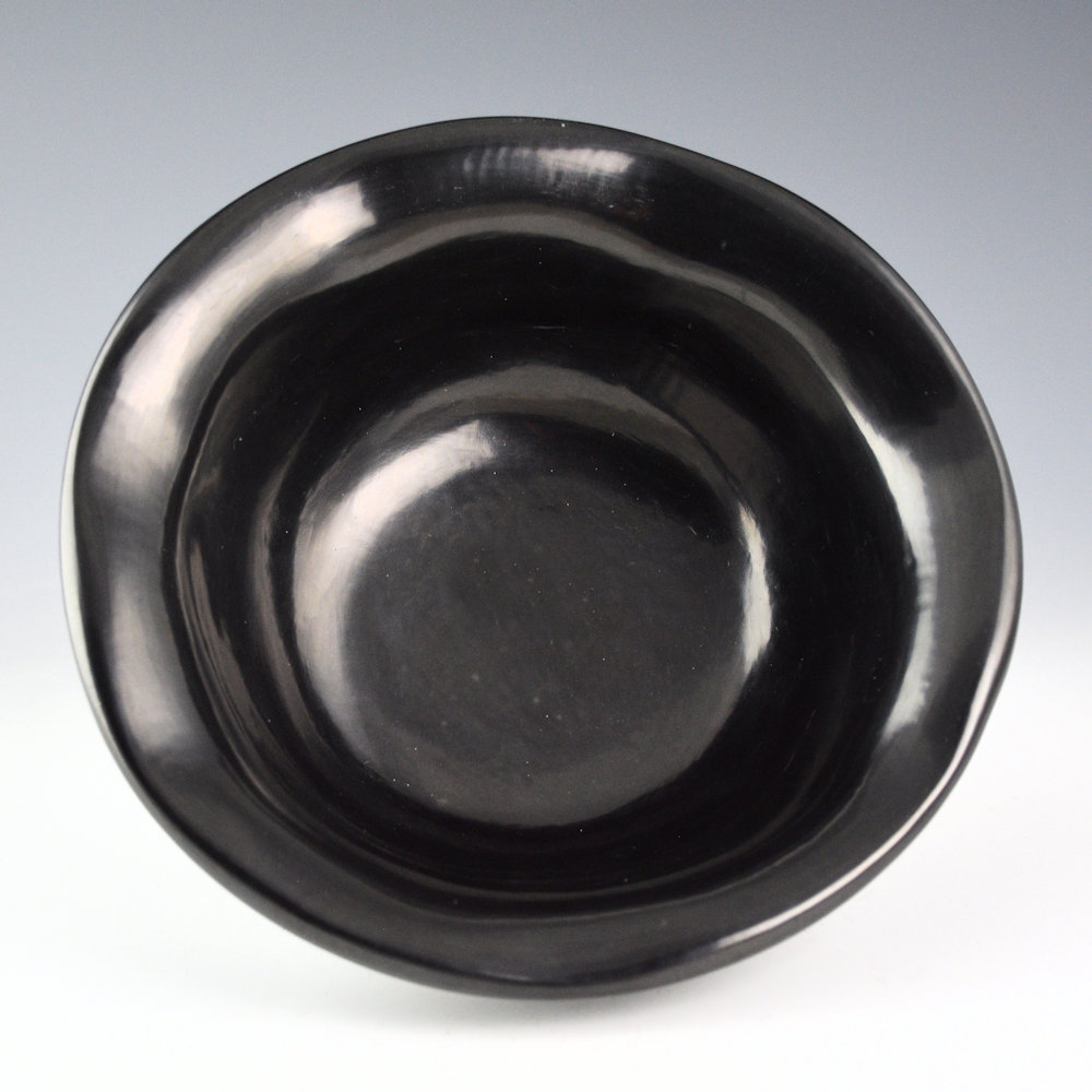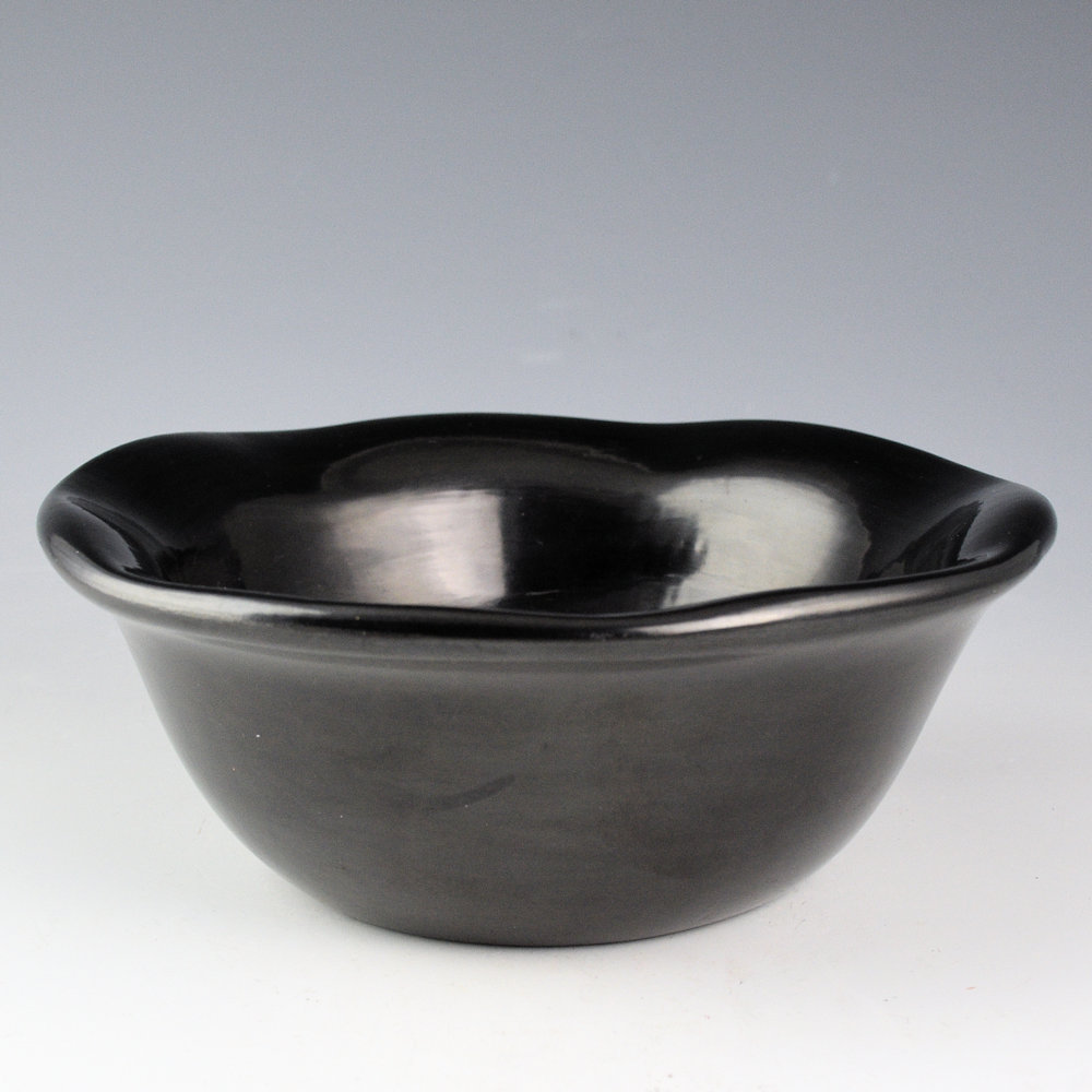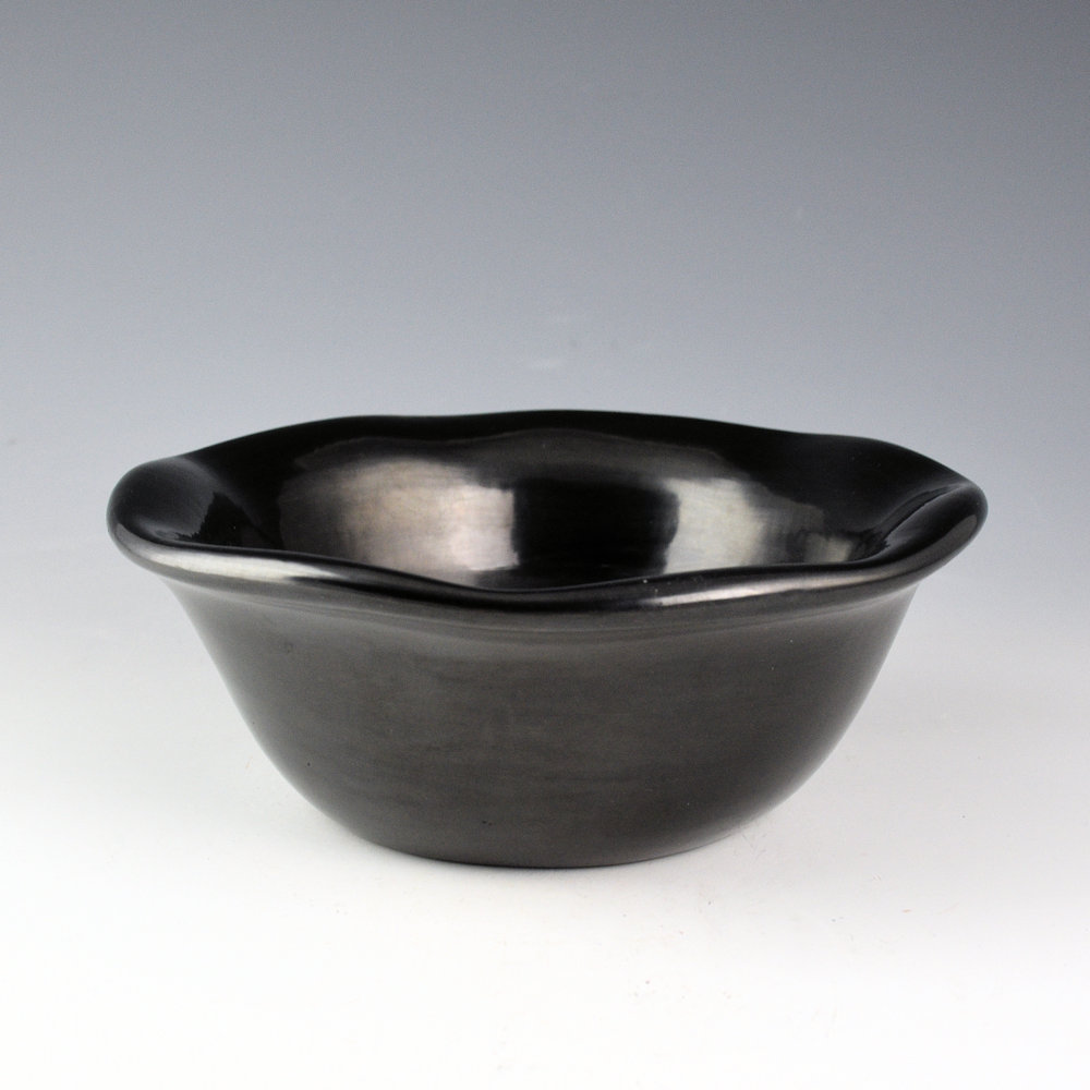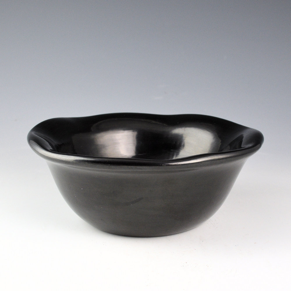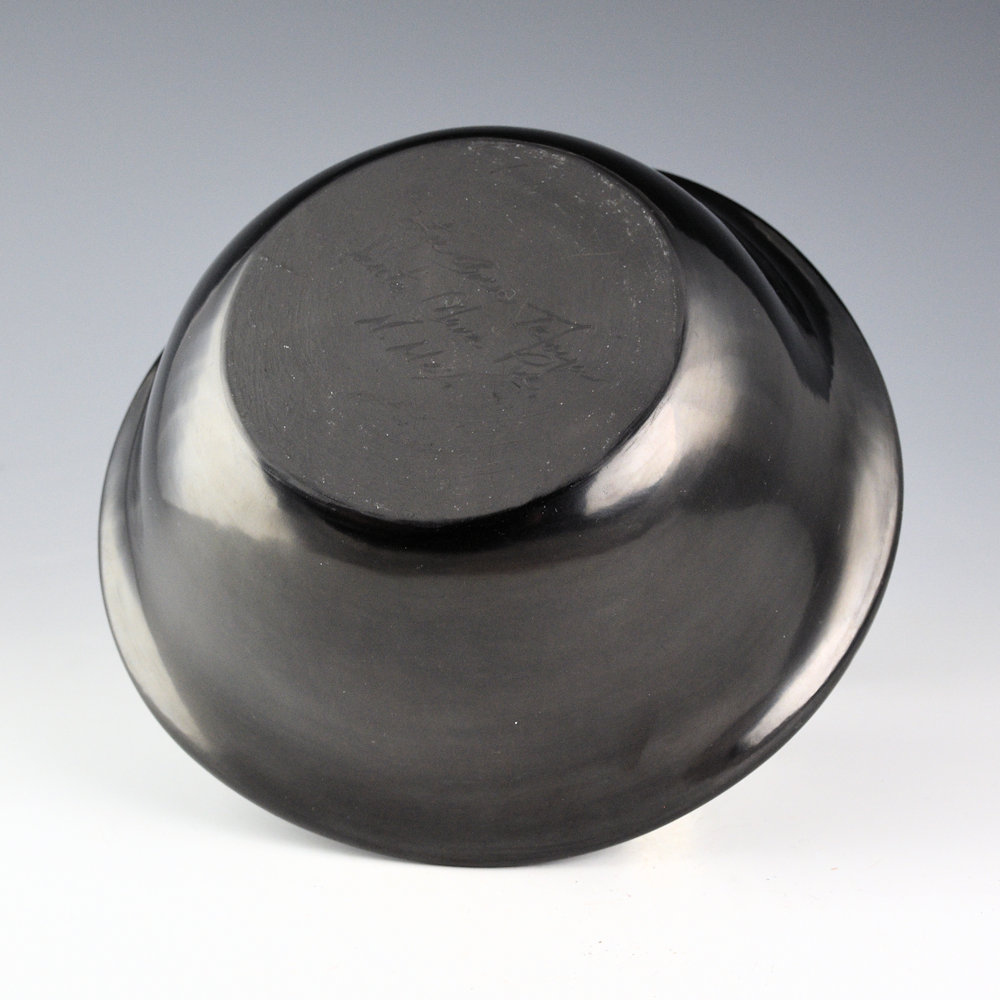 LuAnn Tafoya is a daughter of Margaret Tafoya and learned to make large vessels from her mother. This jar is one of her classic-shaped smaller pieces that is fully polished. The bowl has an open shape with a fluted rim. The entire piece is fully polished, even the inside. It is a reflection of how great LuAnn can polish her pottery. It was fired to a glassy black. The pottery of LuAnn Tafoya is an important continuation of the traditions of her family and the pueblo. Today, few potters create pieces this size and the skill and beauty in LuAnn’s pottery is always remarkable! It is signed on the bottom, “LuAnn Tafoya”. It is in excellent condition with no chips, cracks, restoration, or repair.