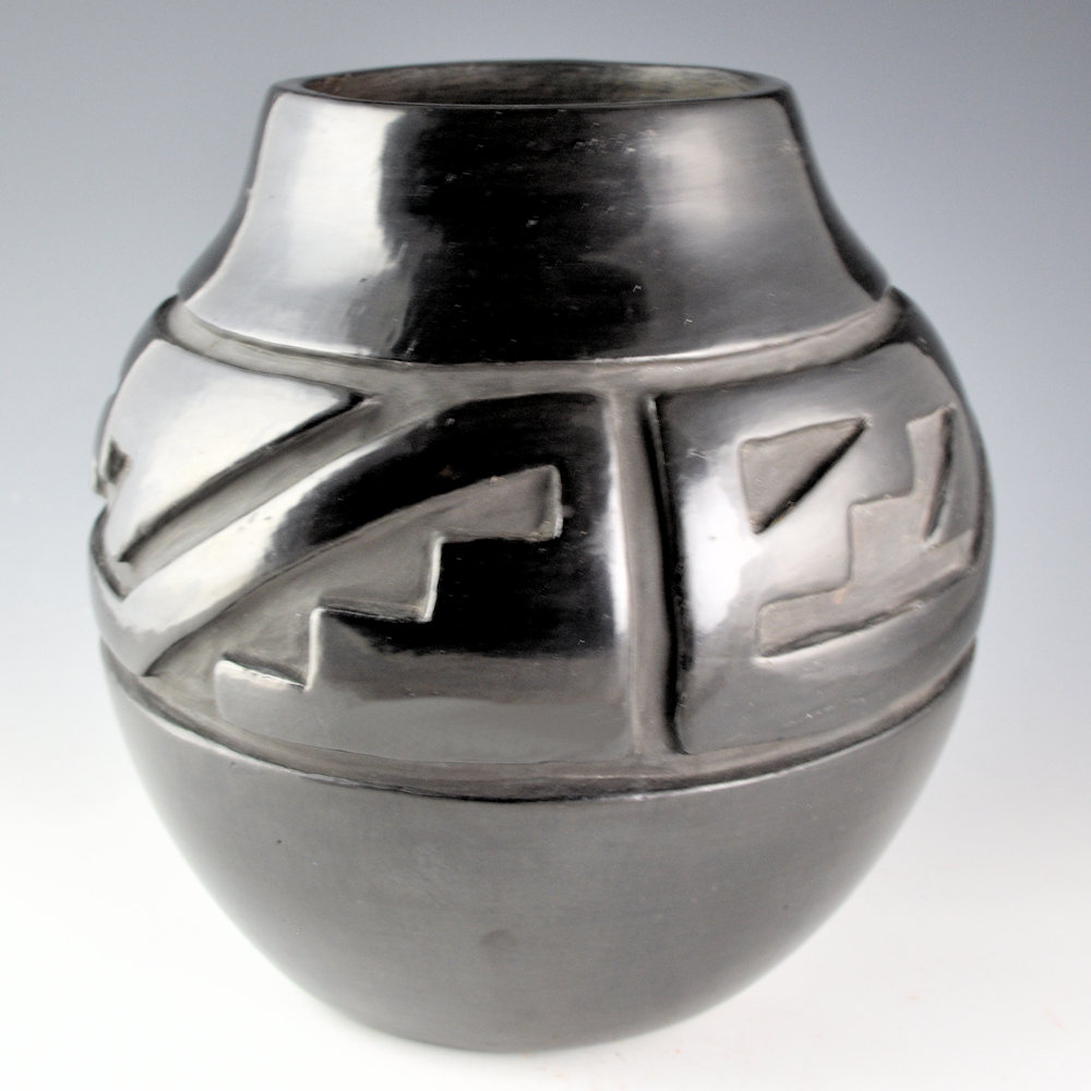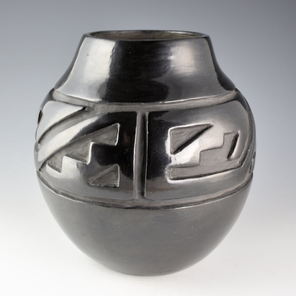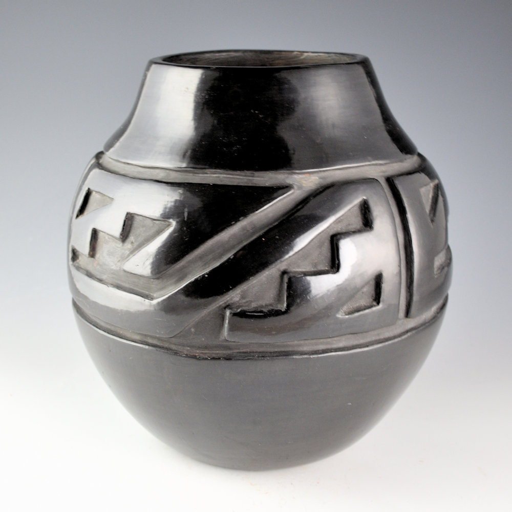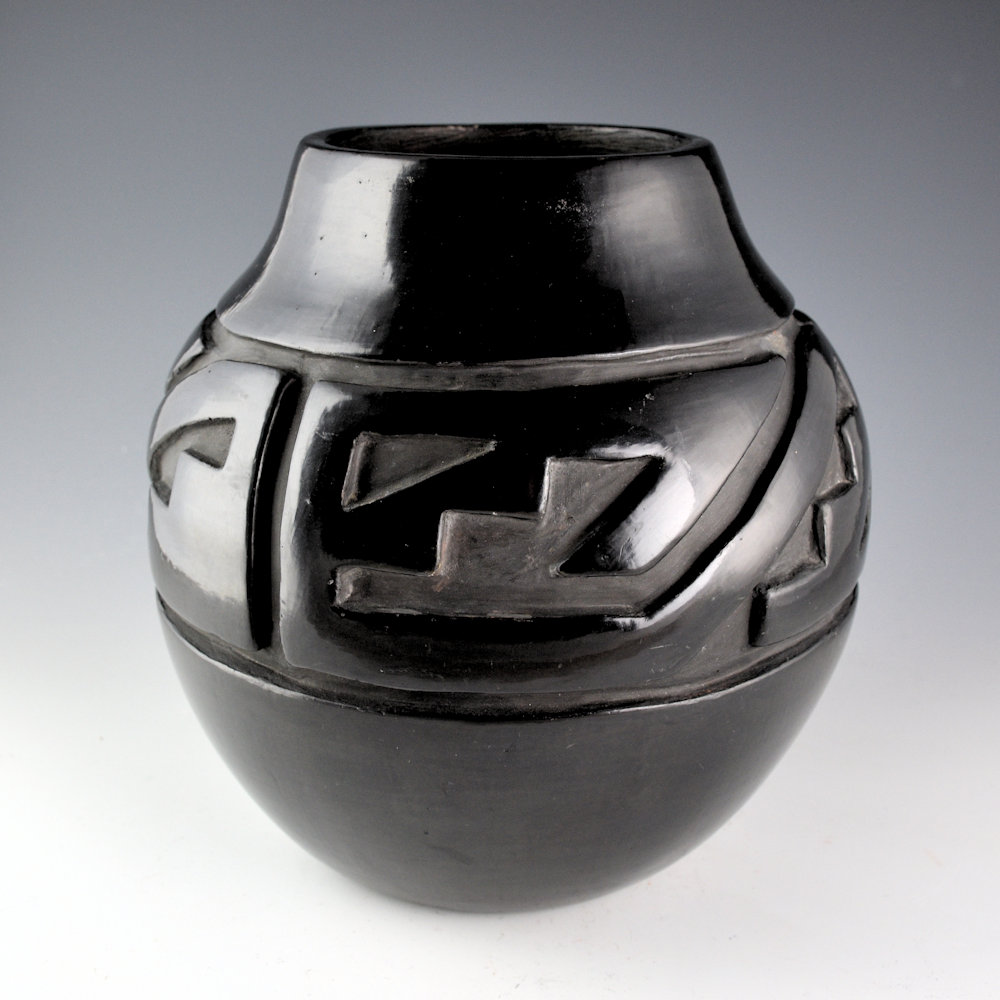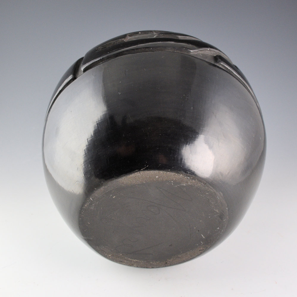 This is a classic storage jar shaped vessel by Margaret Tafoya. It is from the 1960s. The piece is coil-built, carved, stone polished, and traditionally fired black. The jar has a round body and a short neck. The neck and base are fully polished and the center band is deeply carved. The design is a series of kiva step and rain designs. The entire piece is fully polished to a high, glassy shine. It was traditionally fired a dark black coloration. It is signed on the bottom in the clay, “Margaret”. It is in very good condition with no chips, cracks, restoration or repair. There are a few light surface scratches.