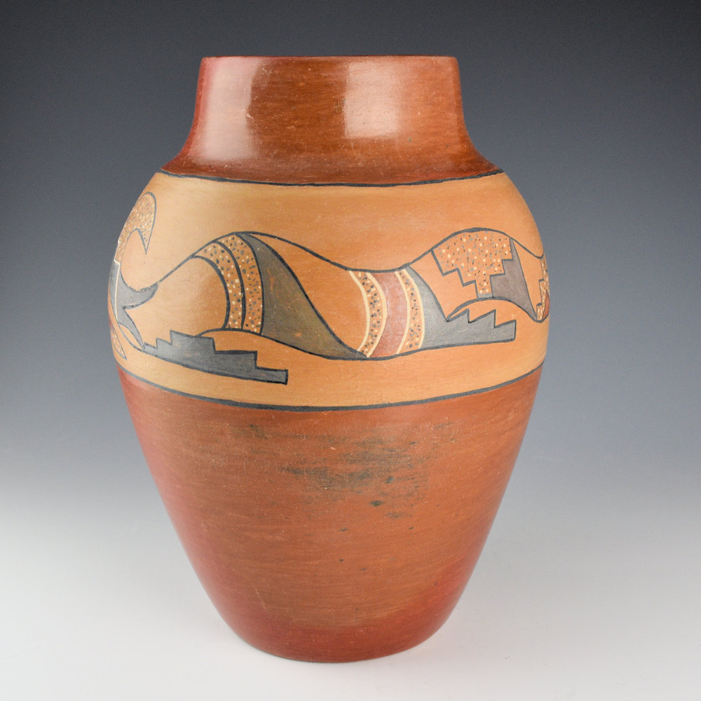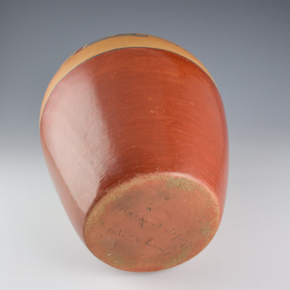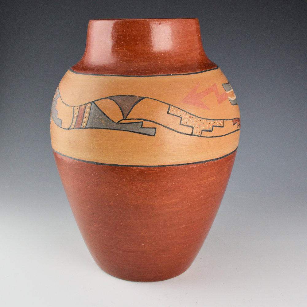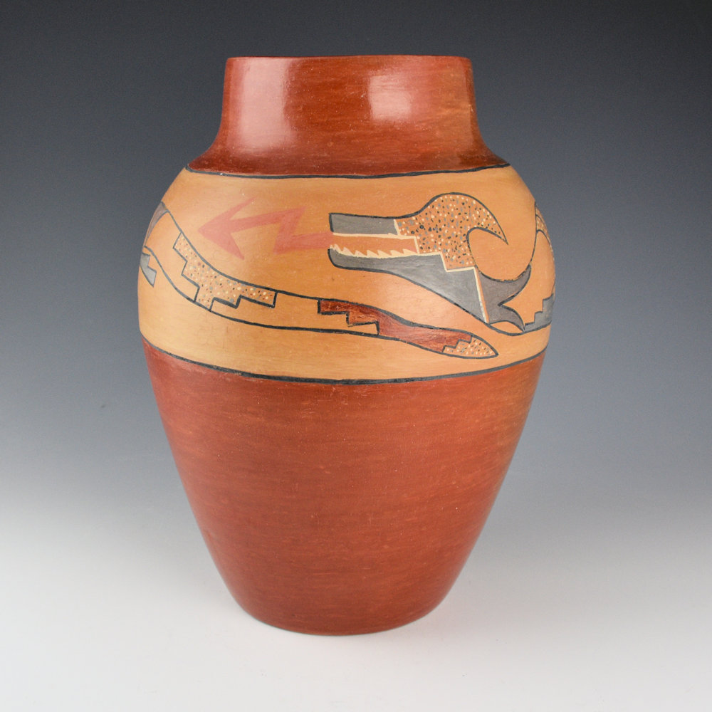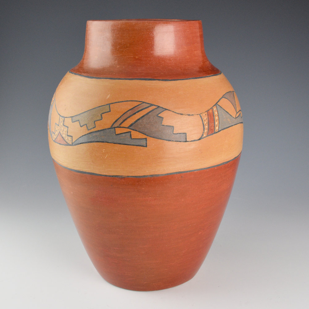 WOW!  This is an extraordinary and rare large polychrome jar by While Margaret Tafoya.  While was famous for her large vessels and black fired pieces, in the 1930s to 1950s, she also created amazing polychrome pottery.  She made fewer of these pieces and they have rarely survived over the ensuing century.  However, they are among her most important and rarest pieces of pottery.  This jar is from the 1940s and it has a high shoulder and short neck.  The jar is polished red on the neck and the base.  The central band has a painted avanyu encircling the piece.  The design uses multiple clay, but also note the use of the small dots of clay to accentuate the designs on the head, tail, and body.  The jar was traditionally fired and has slight color variations from the firing.  The jar is signed on the bottom in the clay, “Margaret Tafoya”. It is in very condition to nearly excellent with no chips, cracks, restoration or repair.  This is definitely a historically important and exceptional jar by this important Santa Clara potter.