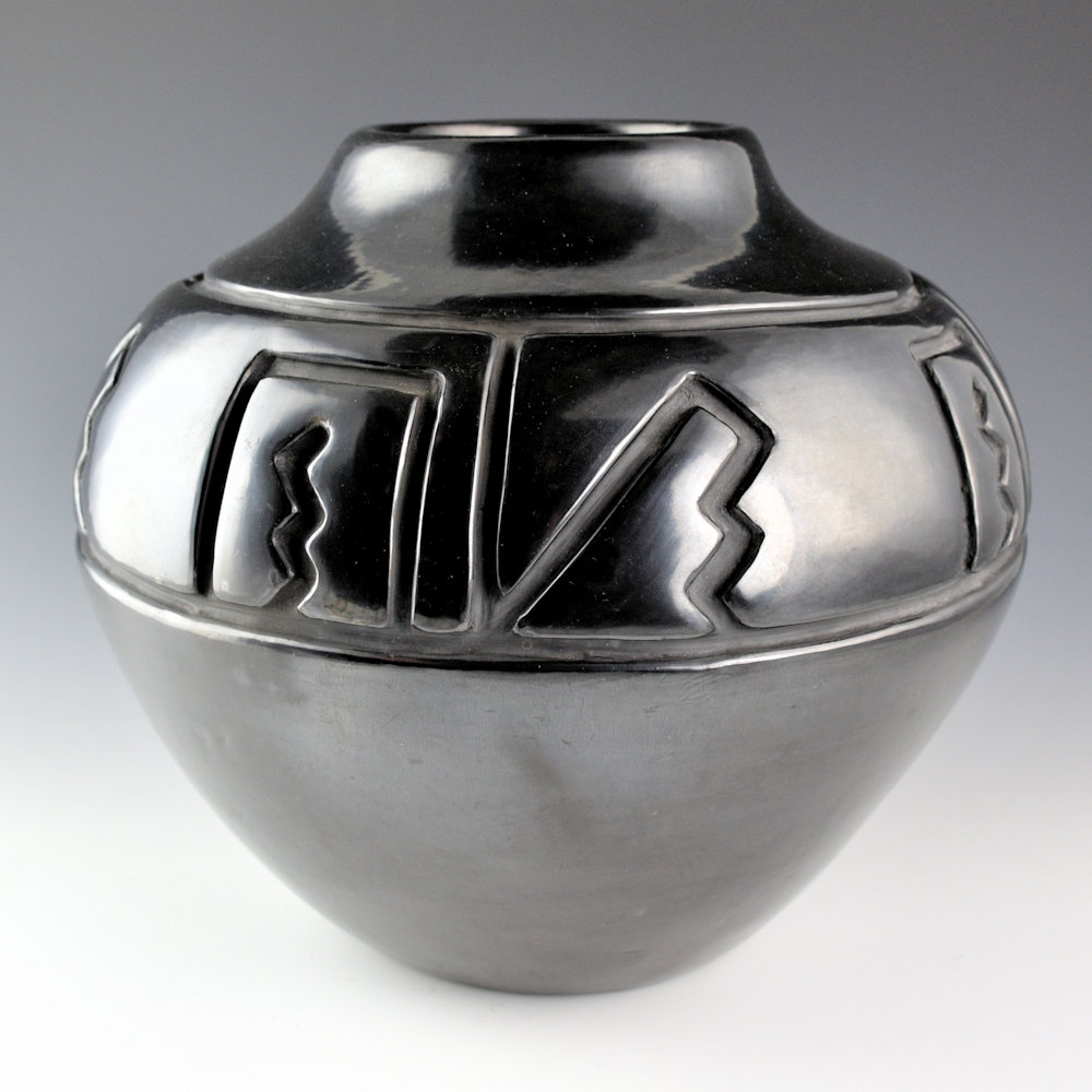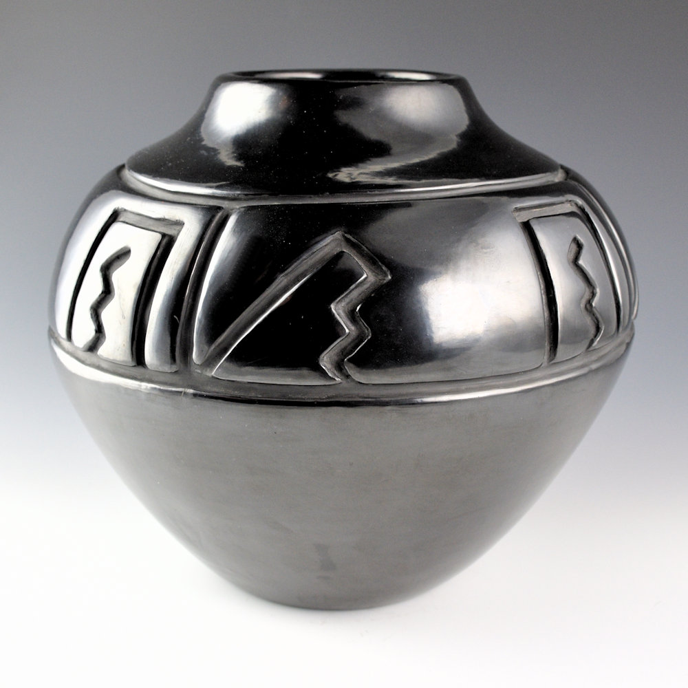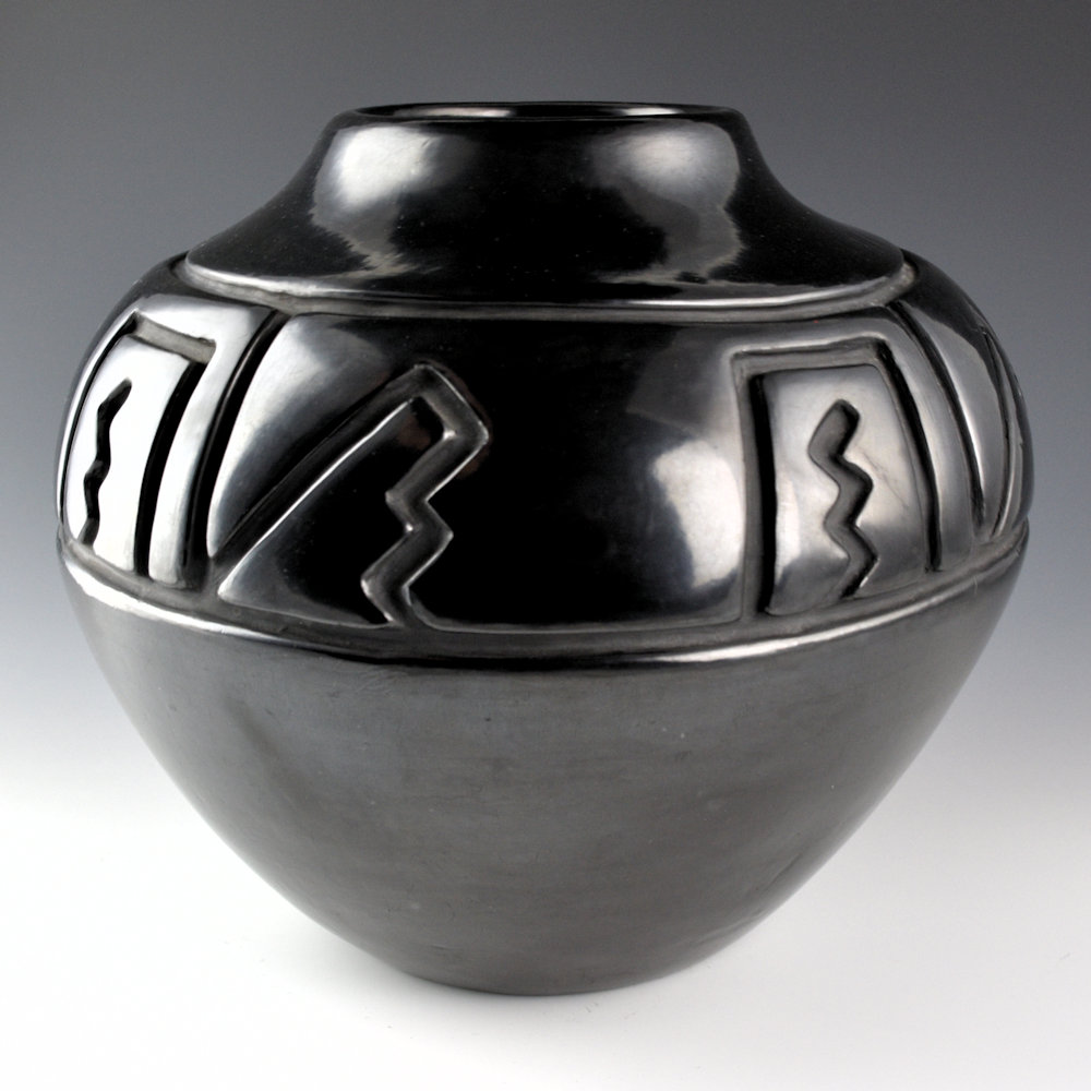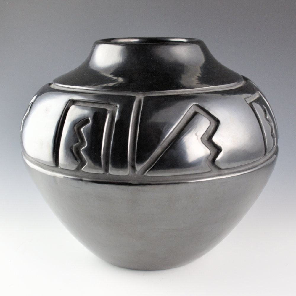 WOW! This is an exceptional classic storage jar-shaped vessel by Margaret Tafoya. The jar has a round shoulder and a short neck, creating a storage jar shape in a smaller size. It is not often that Margaret would make smaller storage jar-shaped pieces. This was because they created a lot of surface area to either carve or polish, even on a smaller piece. On this jar, the carved section takes up a large portion of the jar. Note the complexity and depth of the carving on this piece. The contrasting kiva step and lightning designs are tightly carved and create a striking angular contrast to the round vessel. The jar is very highly polished and fired to a deep, glassy black. Margaret was masterful not just at shapes but also at creating carved imagery that would accentuate her forms. This jar is signed on the bottom in the clay, “Margaret Tafoya”. It is in excellent condition with no chips, cracks, restoration or repair. Exceptional in person!!