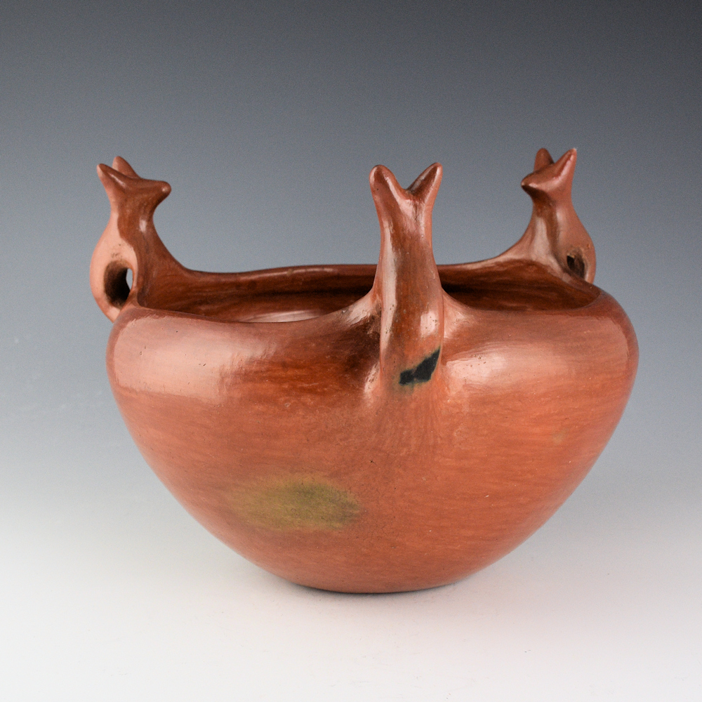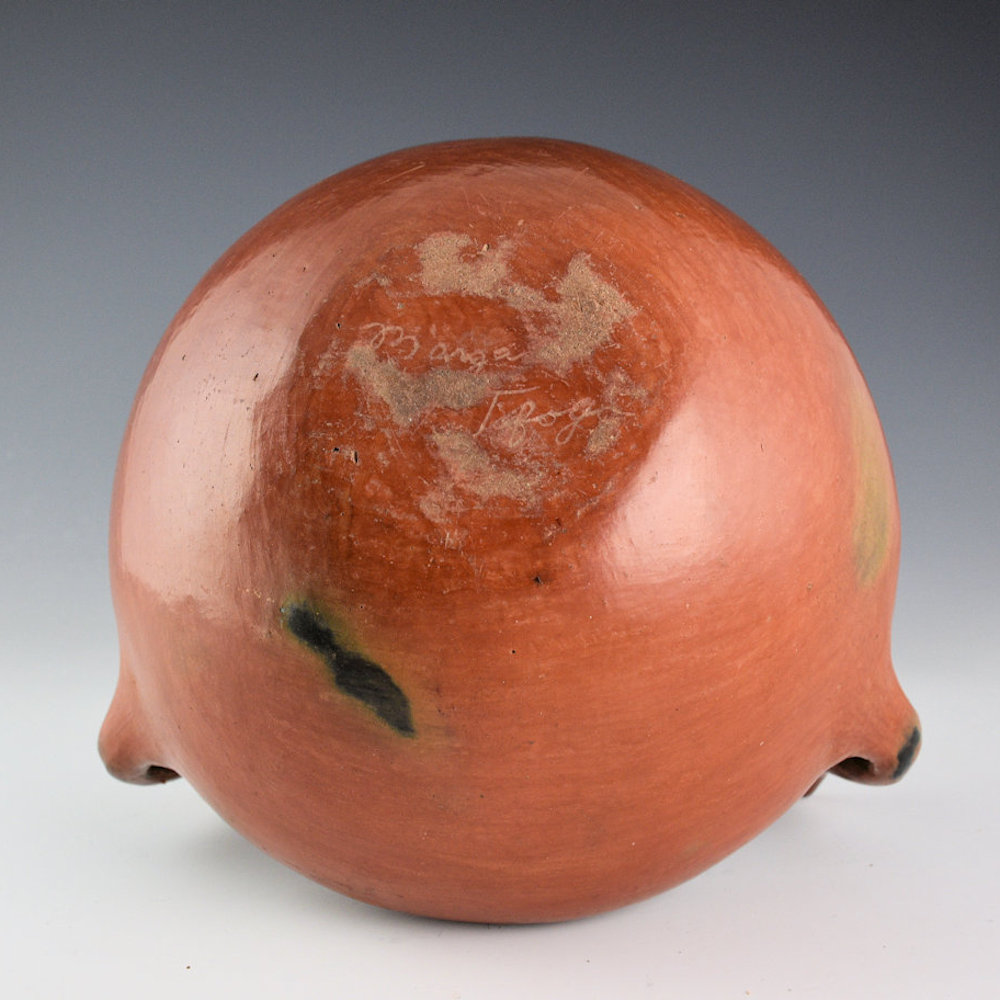 This piece by Margaret Tafoya is one that is fascinating on both a historic and research level. Since I wrote “Born of Fire” in 2005, I have seen hundred of pieces by Margaret Tafoya. I have seen numerous pieces attributed to her with animal handles. However, this (and the black oval 2 fox bowl), are the only signed ones I have ever seen. Not only are they signed, but they are each in very good condition. The bowl is round in shape and has three foxes as handles. The exterior and interior are both fully polished, as is each fox. Note in the photos how they are placed, which is perfect opposition to one another. There is something genius about both the design and style of this piece. The bowl was polished red and fired a deep red coloration. You can see the small areas of black, which almost make me this that her mother, Sarafina Tafoya, helped to fire this piece. Sarafina would often take a hot stick and touch it to the red pieces to create a mark as she said that only God was perfect. That the bowl survived the firing, and nearly 100 years intact, is amazing! It is in very good condition with no chips, cracks, restoration or repair. It is signed on the bottom, “Margaret Tafoya” in the clay. Simply a spectacular piece of history and a significant rarity among her work. In addition, it finally helps to define the style of Margaret’s fox handles on her pottery and is certainly one of her important early redware pieces.
