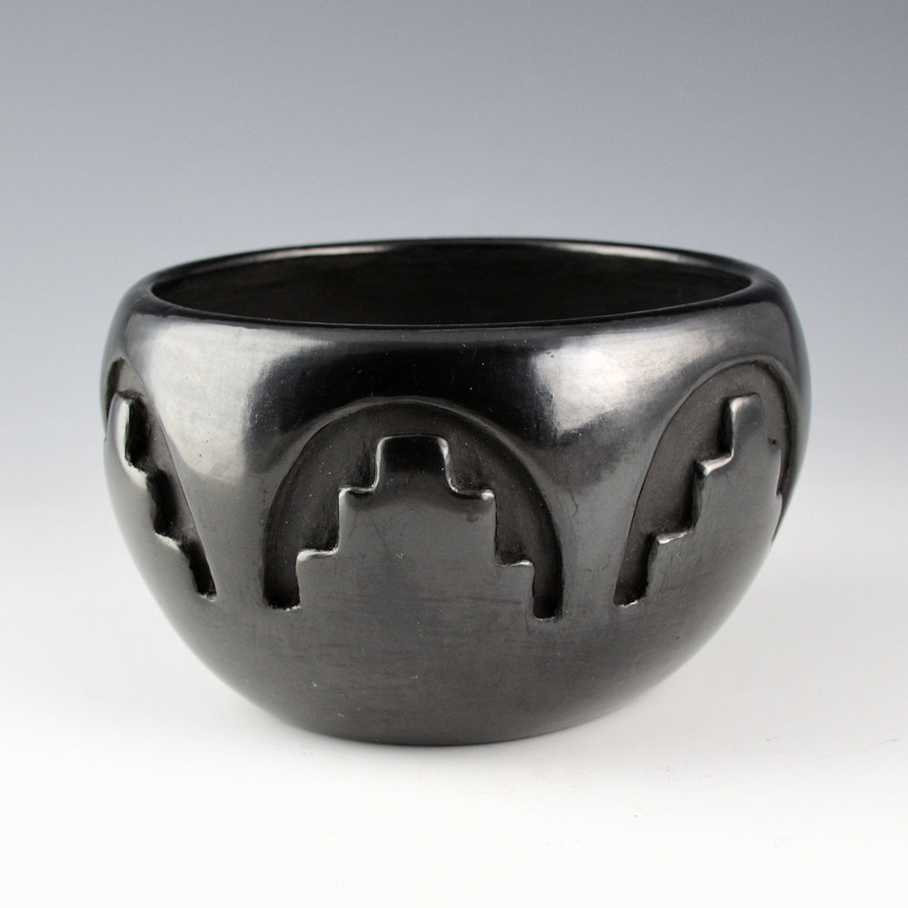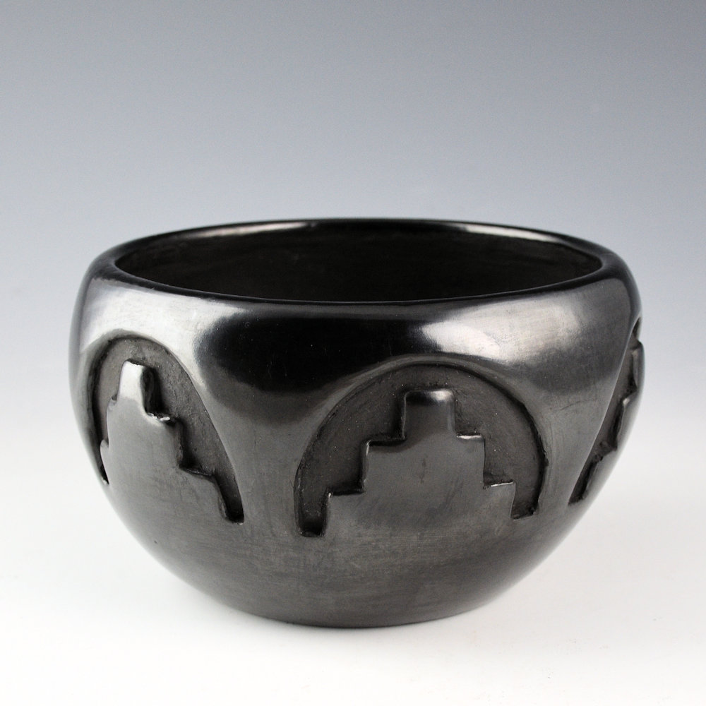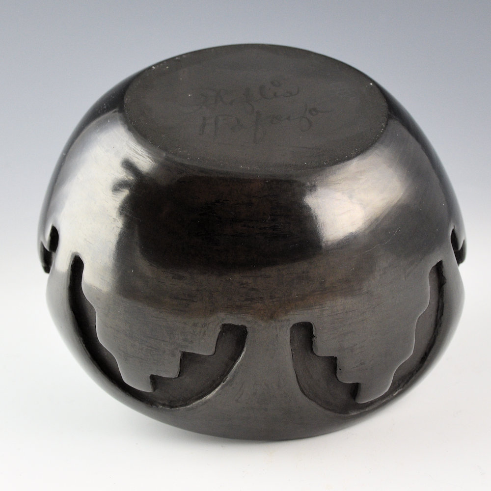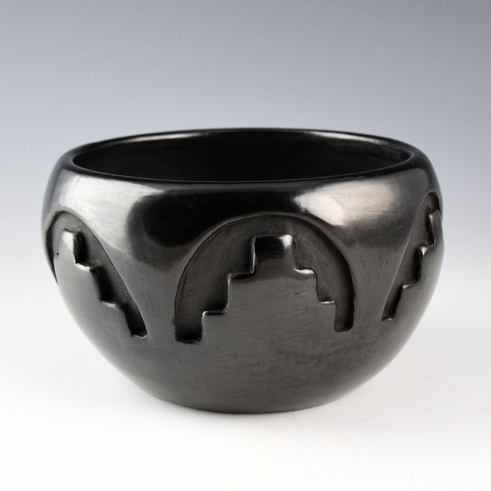 Phillis Tafoya (b. 1955) isa granddaughter of Christina Naranjo and a daughter of Mida Tafoya. She is the wife of Matthew Tafoya. This bowl is coil-built and has four carved kiva step clouds. The entire surface is fully polished and fired a deep black. It is signed on the bottom in the clay, “Phyllis Tafoya”. It is in excellent condition with no chips, cracks, restoration, or repair. While Phillis makes little pottery today, her work is beautiful in form, design, and polish.