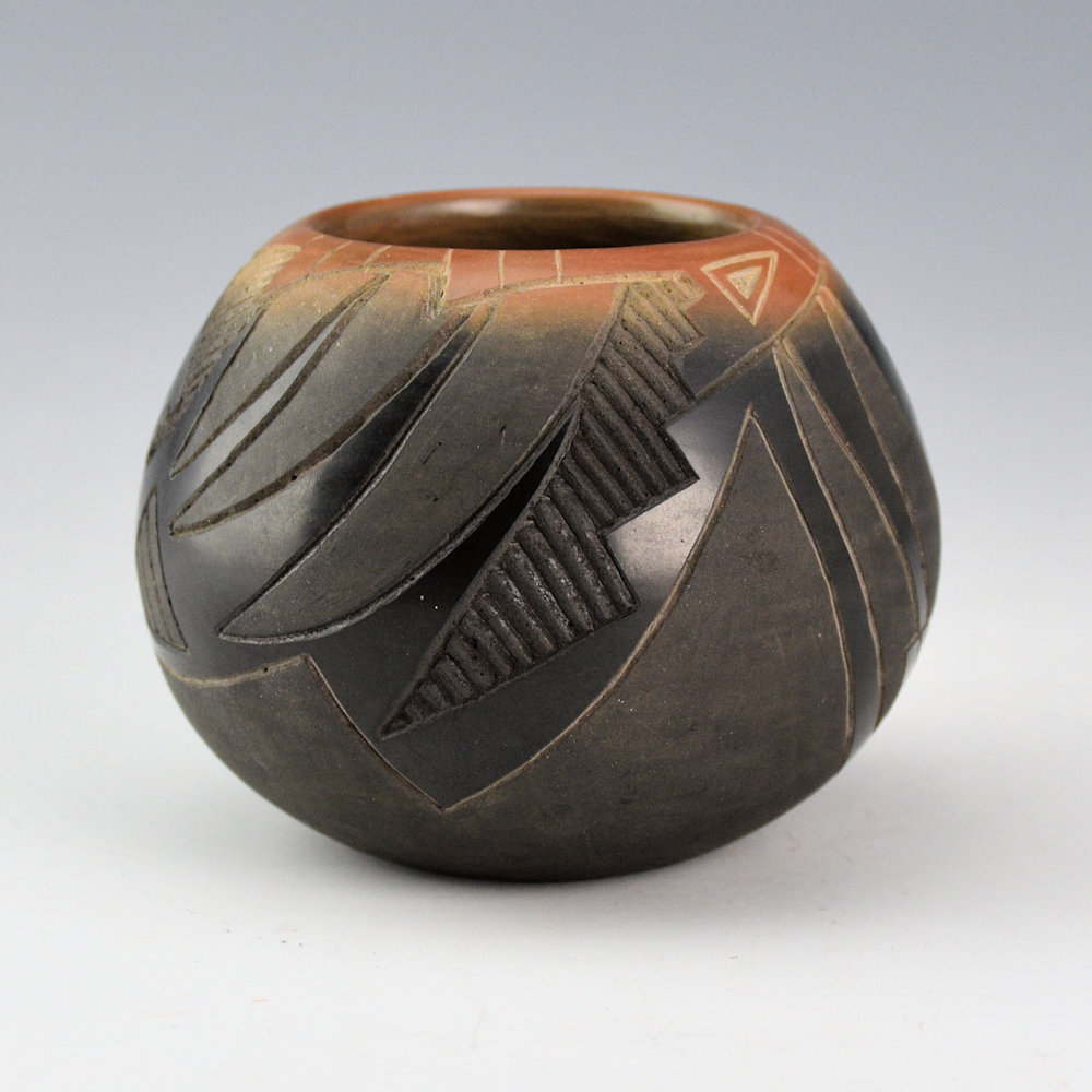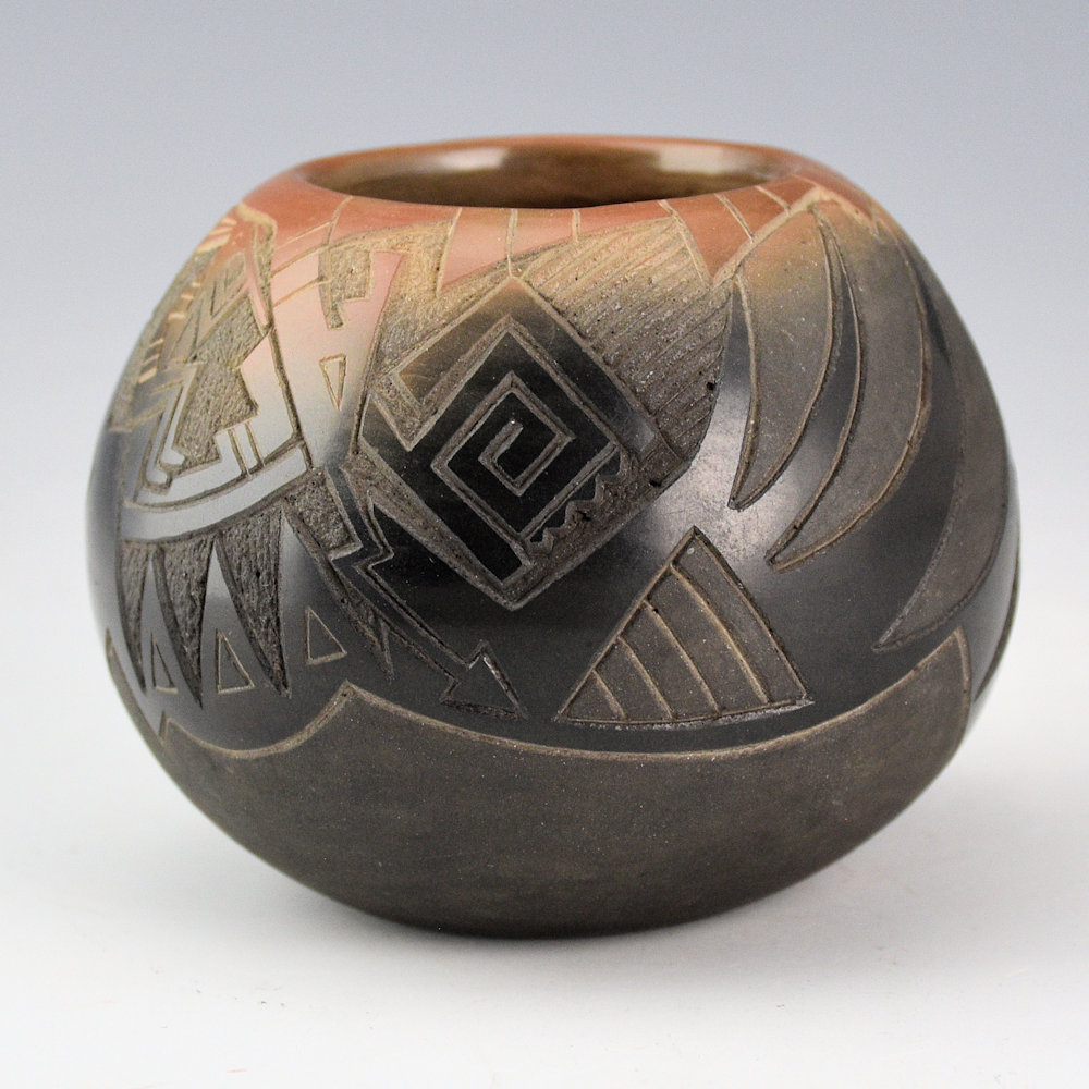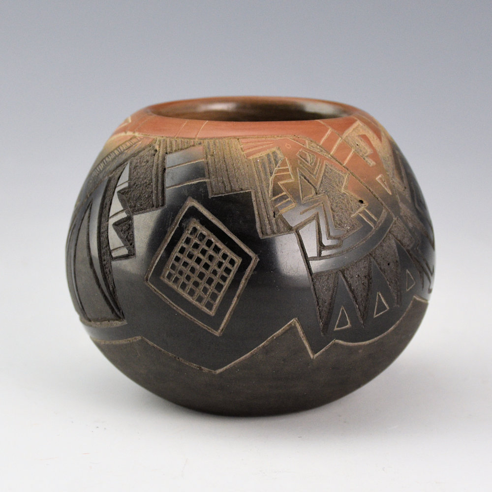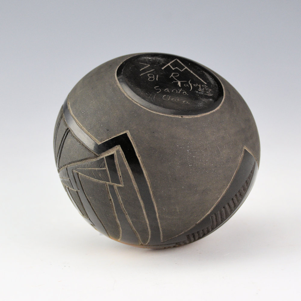 This bowl by Ray Tafoya is from 1981. It is an earlier piece of his pottery. The piece is fully polished, carved, and etched. The bowl has both matte and polished surfaces. There clouds extending down from the rim. There is a single flute player and three feathers etched into the clay. The piece was fired black and it was two-toned sienna on the rim. It is an exceptional early piece in terms of design. The seedpot is in excellent condition with no chips, cracks, restoration, or repair. It is signed on the bottom with his hallmark which is a White Mountain (his name in Tewa).