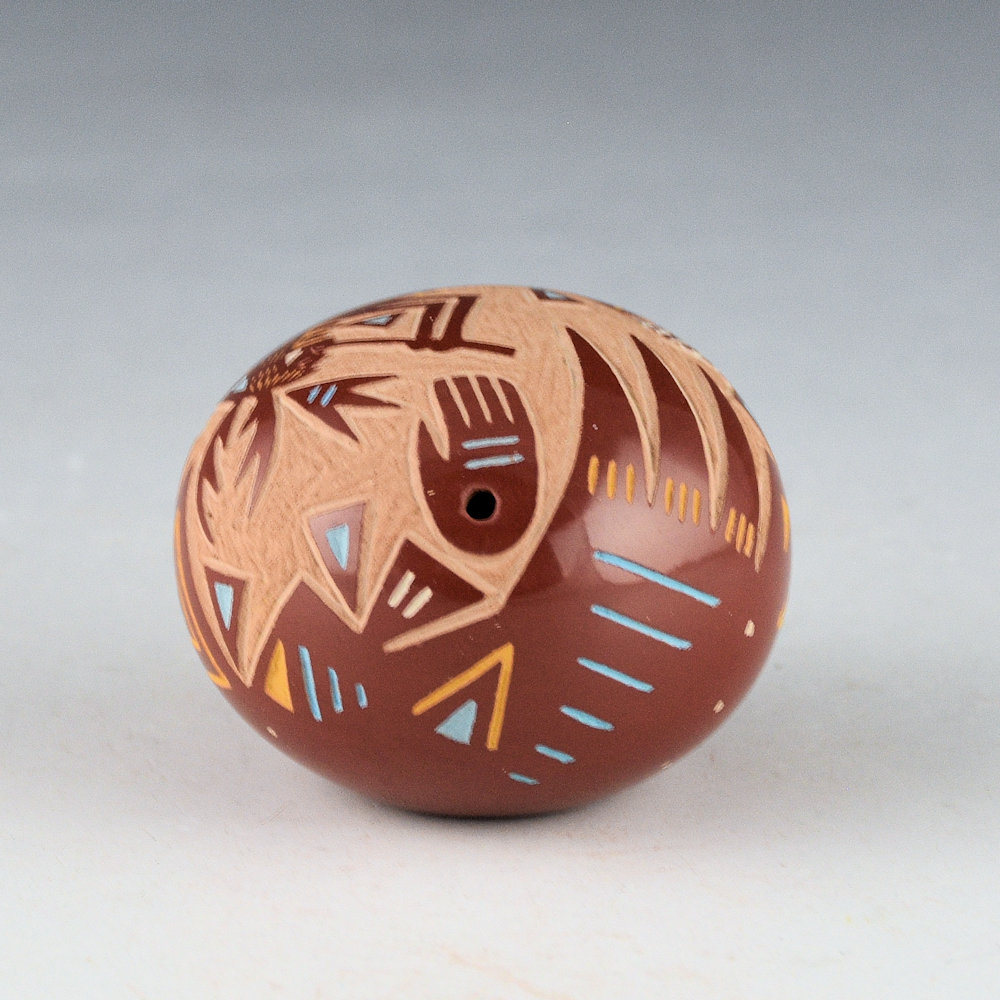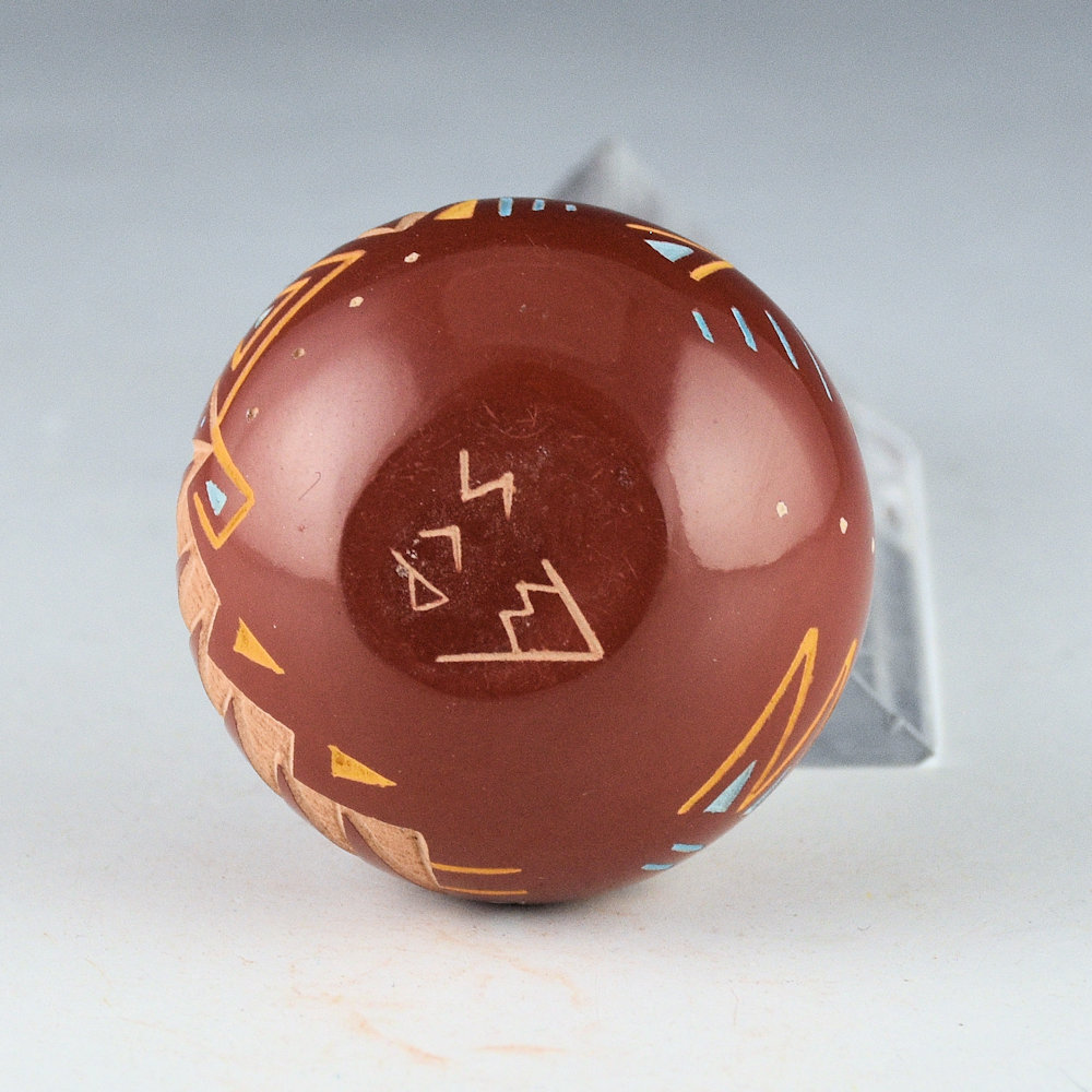 This miniature seedpot by Ray Tafoya. It is fully polished and round in shape. It has a stylized Deer Dancer holding a flute. Ray added more detail to this piece, as noted in the hatchwork on the stockings on the figure. There is a bear paw to one side (with the hole for the seedpot in the center). The remainder has additional Santa Clara design. It is highlighted with additional yellow and blue clay slips. The seedpot is in excellent condition with no chips, cracks, restoration or repair. It is signed on the bottom with his hallmark that means “White Mountain” in Tewa.