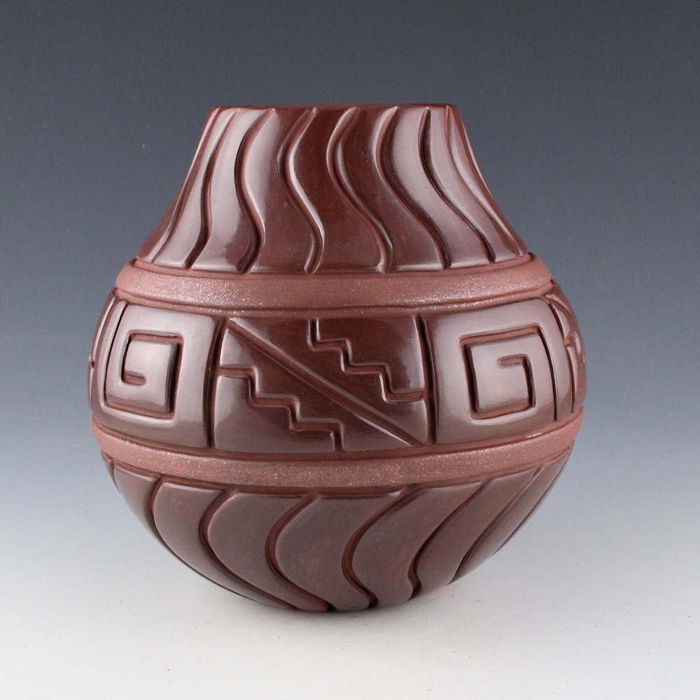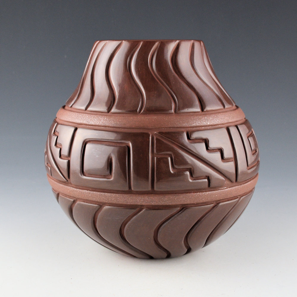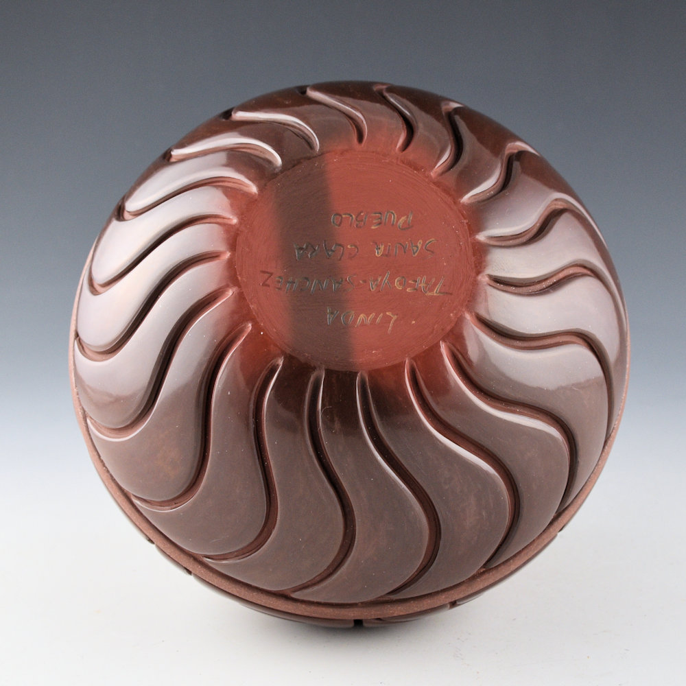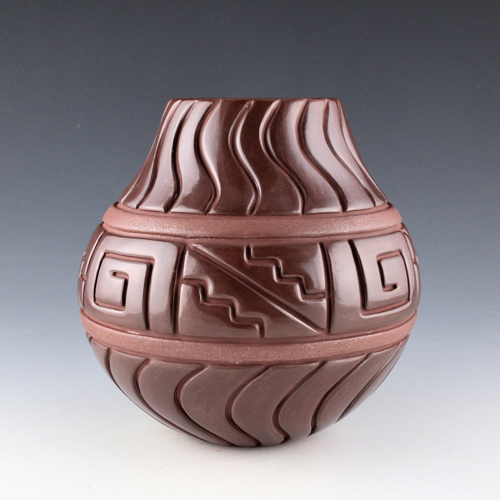 This is a classic jar by Linda Tafoya-Sanchez. This jar has a round and elongated neck. The neck and base are each carved with 20 swirling waves. The center of the jar is carved with rain, lightning, and cloud patterns. There is a single band above and below that are slipped with mica. The jar was fired her new “plum/dark cherry” coloration. It is exceptional in person! The color seems to change in the light. It is exciting that not only has she created this coloration, but she has also been able to achieve it consistently. She says it is a bit more work in the firing but the results are worth the time and risk. The jar has a very modernist appearance and yet is classic in traditional design elements. It is signed on the bottom, “Linda Tafoya-Sanchez”.