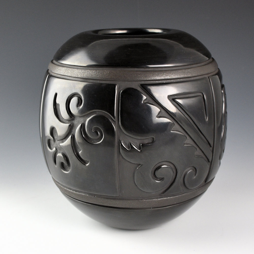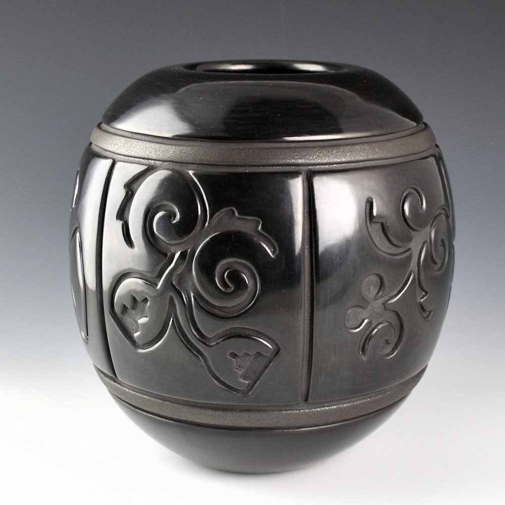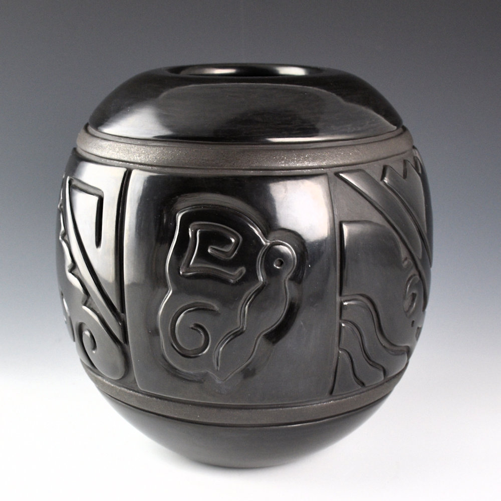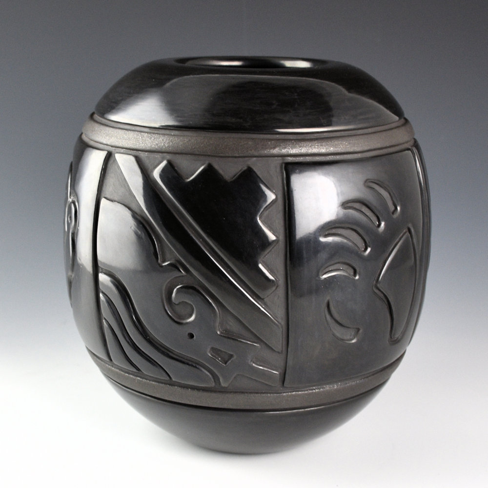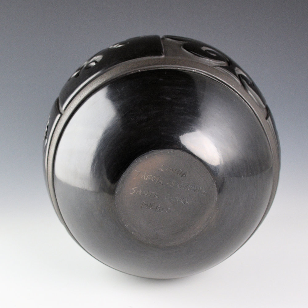 This is a classic tall jar by Linda Tafoya-Sanchez. This jar has a round shape which creates a lot of space for design. The jar has six panels carved into the clay, each with a different design. There is a bear paw track, avanyu and clouds, butterfly, rainclouds, squash plant, and flower. Each section is deeply carved and highly polished. The neck and base are also fully polished. There is a band at the neck and the base that are slipped with mica. The jar was traditionally fired a deep black coloration. The jar has a very modernist appearance and yet is classic in traditional design elements. It is signed on the bottom, “Linda Tafoya-Sanchez”.