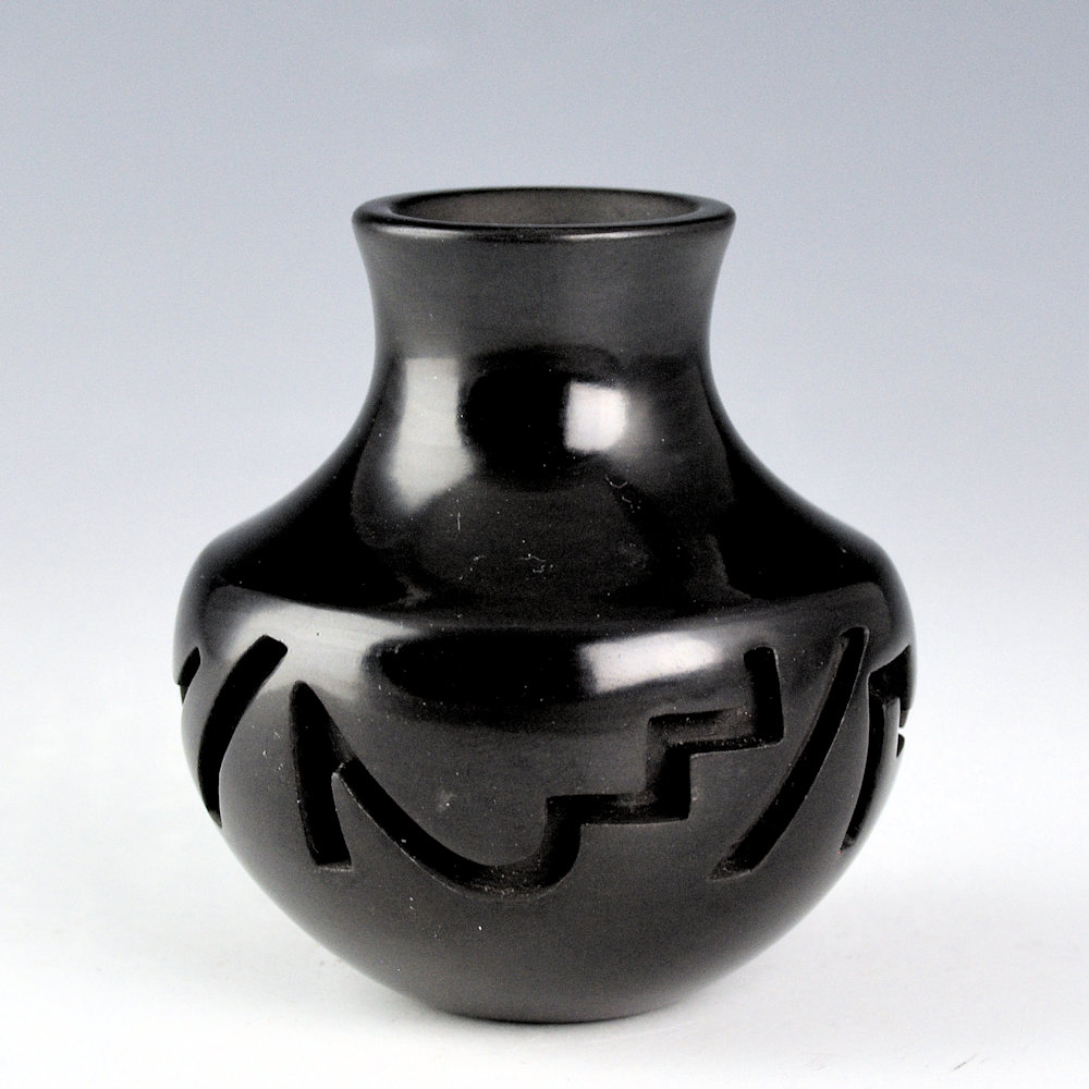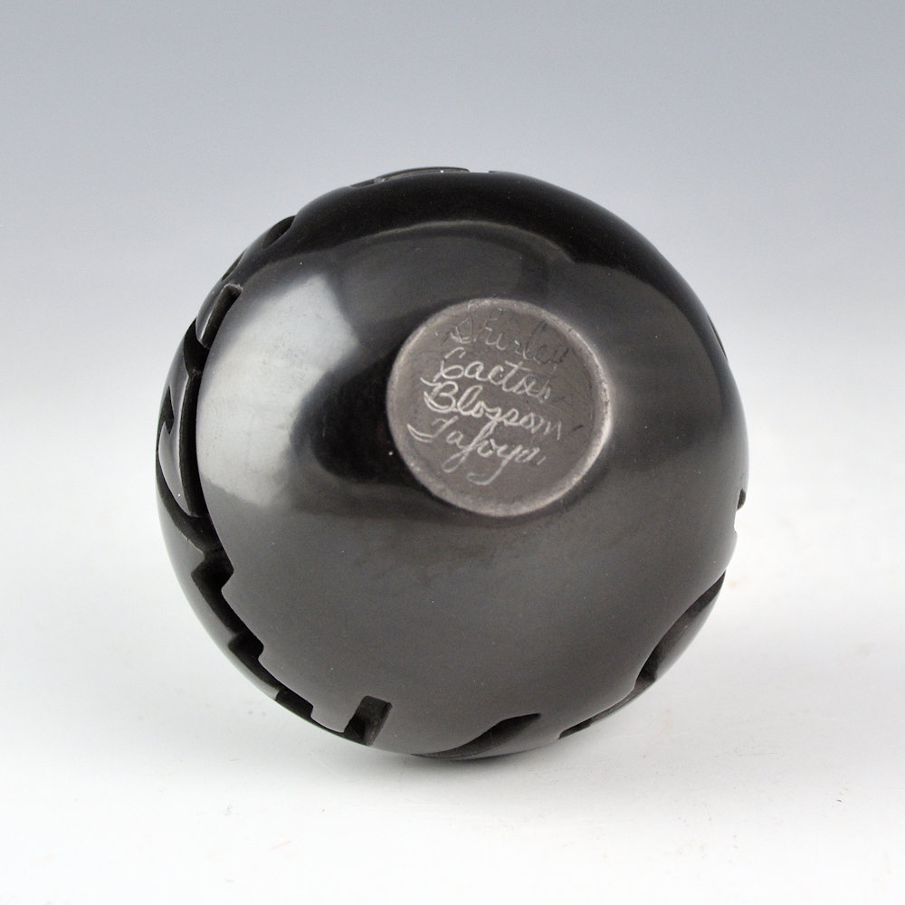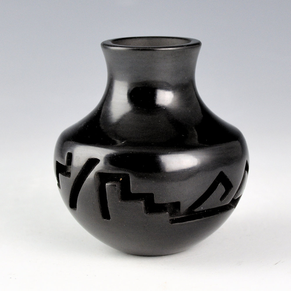 Shirley Tafoya was the youngest daughter of Margaret Tafoya and was known for her miniature pottery. This piece is a classic long neck water jar, much in the style of her mother, Margaret. The jar is VERY deeply carved. The jar has a sharp shoulder and elongated neck. Below the shoulder, the jar is deeply carved with lighting, rain, and mesa designs. The piece is highly polished and fired a glassy black. It is in excellent condition with no chips, cracks, restoration or repair. It is signed on the bottom in the clay, “Shirley Cactus Blossom Tafoya”. Simple but a classic of Tafoya Family pottery!