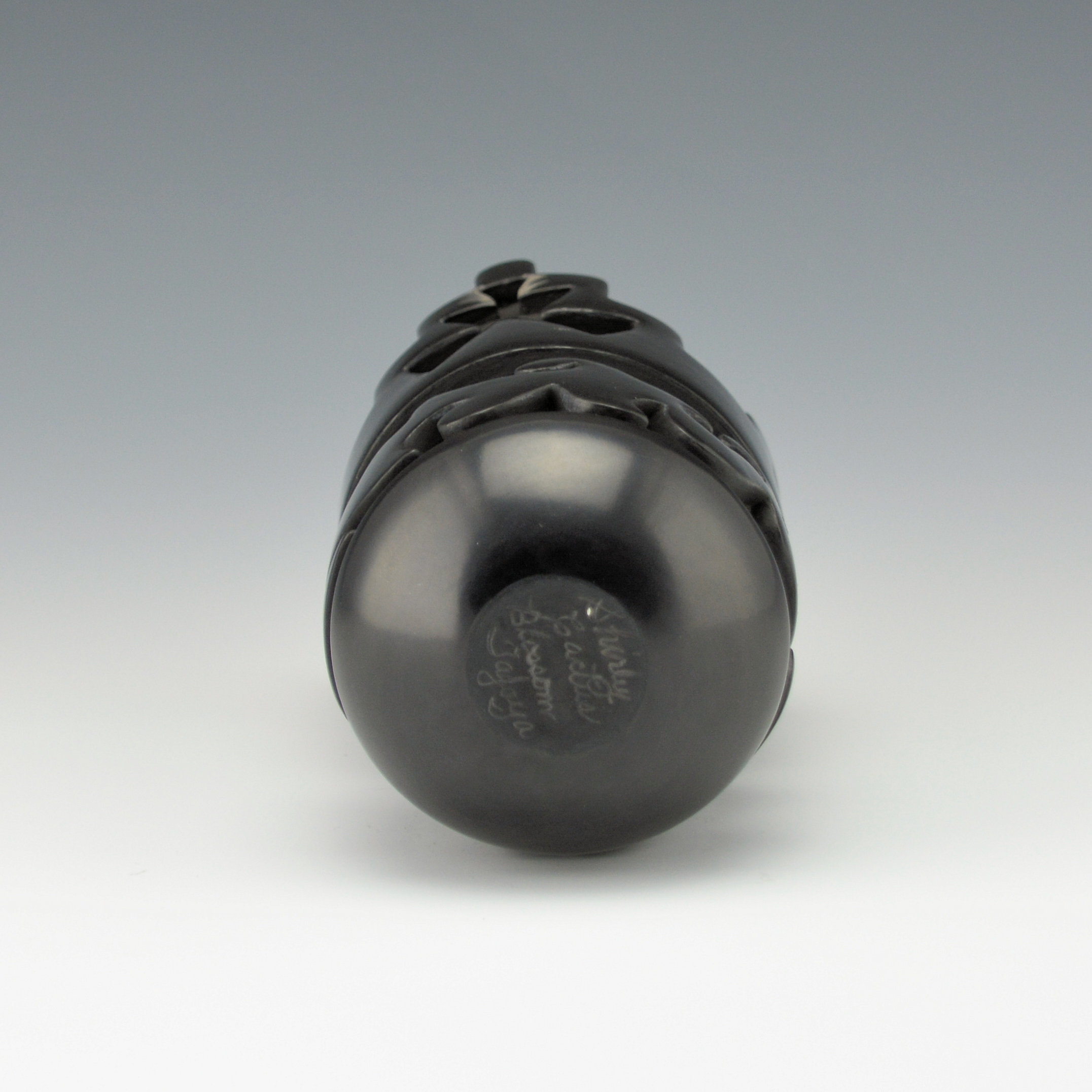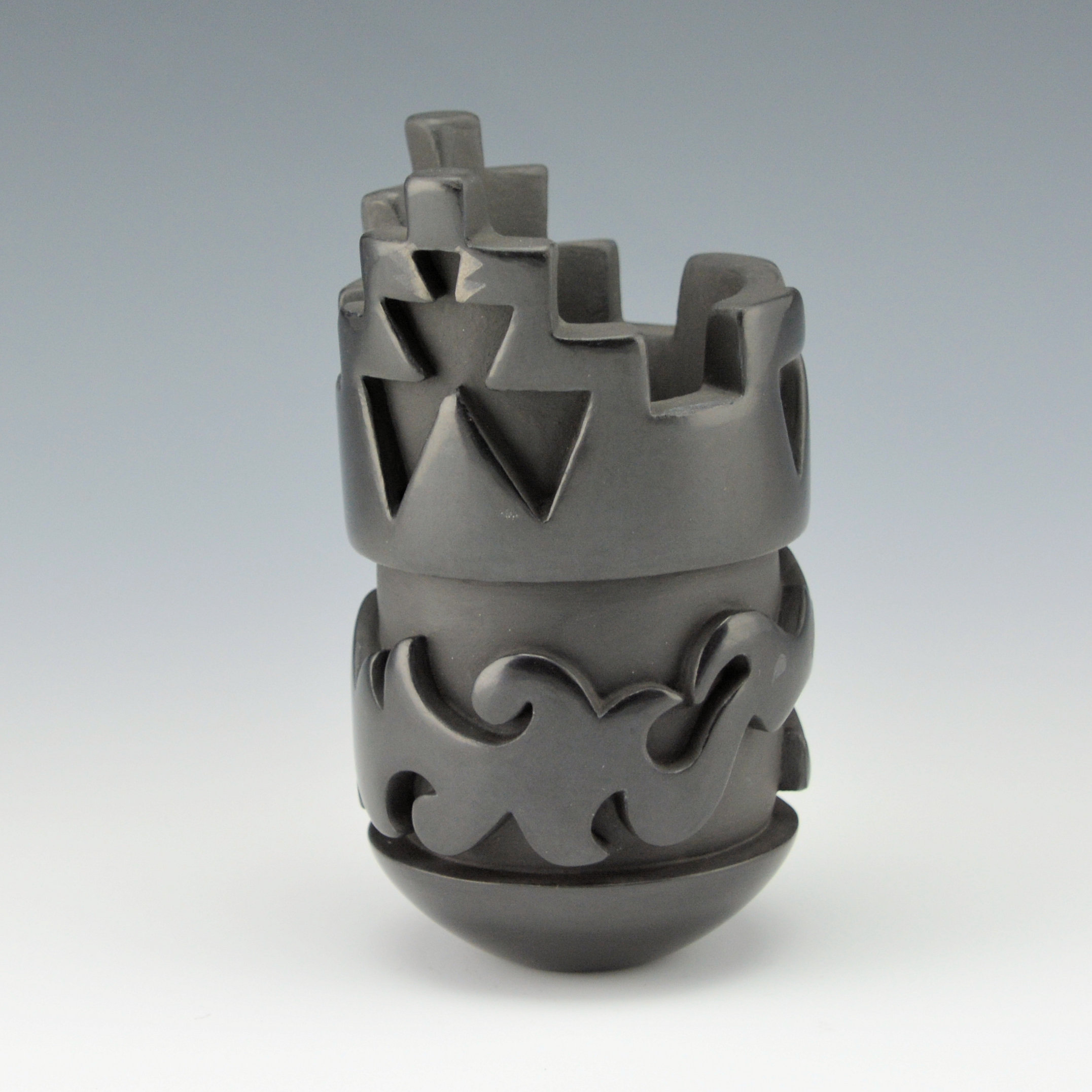Shirley Tafoya was the youngest daughter of noted potter Margaret Tafoya. She was known for her miniature pottery and this is one of her larger sized pieces. The rim is in the shape of a traditional kiva bowl with the stepped rim. Around the body of the piece is a very deeply carved avanyu. There are additional small areas of incised designs. The jar is highly polished and a creative piece of her pottery. The jar is signed, “Shirley Cactus Blossom Tafoya”. This piece was originally made in 2001 for our gallery show with Shirley in Scottsdale. It is in excellent condition with no chips, cracks, restoration or repair. Throughout the years, Shirley won “Best of Miniature Pottery” at Santa Fe Indian Market numerous times. She was involved in the Pueblo religious and Kiva activities, so she did not make a lot of pottery throughout her career.