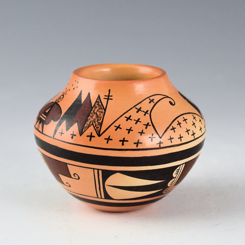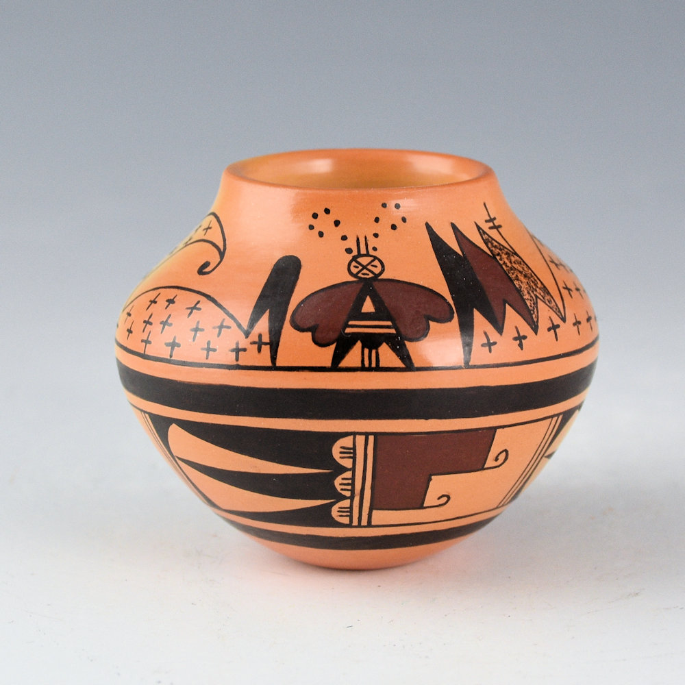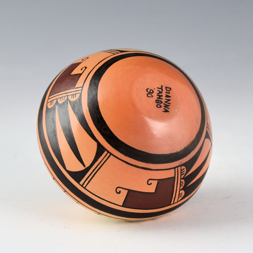 Dianna Tahbo was known for her tightly painted pottery and especially her beautiful miniatures. This piece is from 1990 and it is an exceptional smaller work in clay. Dianna learned to make pottery from her brother, Mark Tahbo. This shape is one for which both of them were famous, with the wide shoulder and short neck. The jar is painted with the moth design which was revived by her great-great-grandmother Grace Chapella. There is a moth on each side and separating them are three obelisk shapes, representing the three Hopi mesas. There are stars for the night sky. Below the shoulder are cloud and mesa designs. The piece is highly detailed and charming in the precision for the size. The jar was traditionally fired so there are blushes on the surface. It is signed on the bottom, “Dianna Tahbo”. It is in excellent condition with no chips, cracks, restoration or repair.