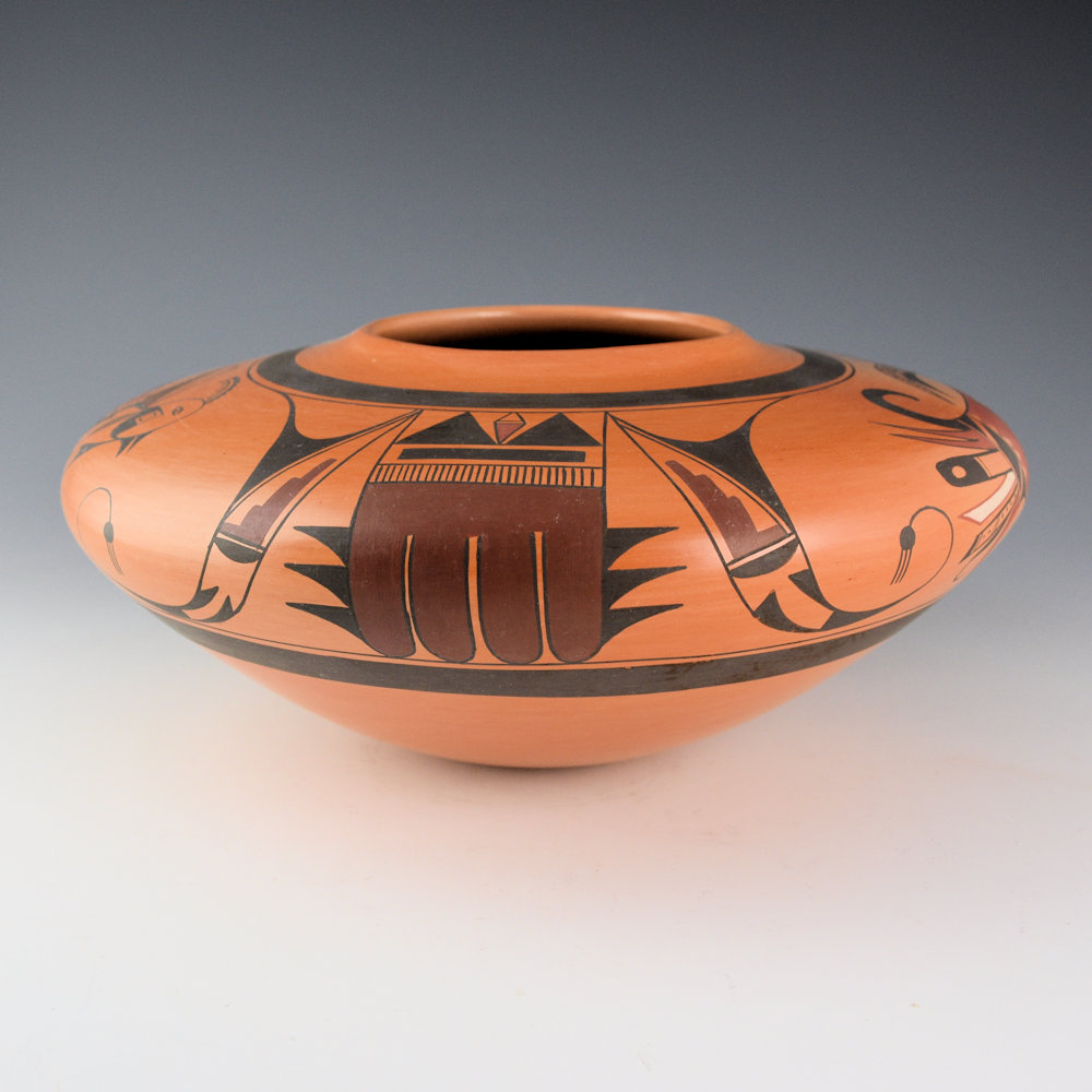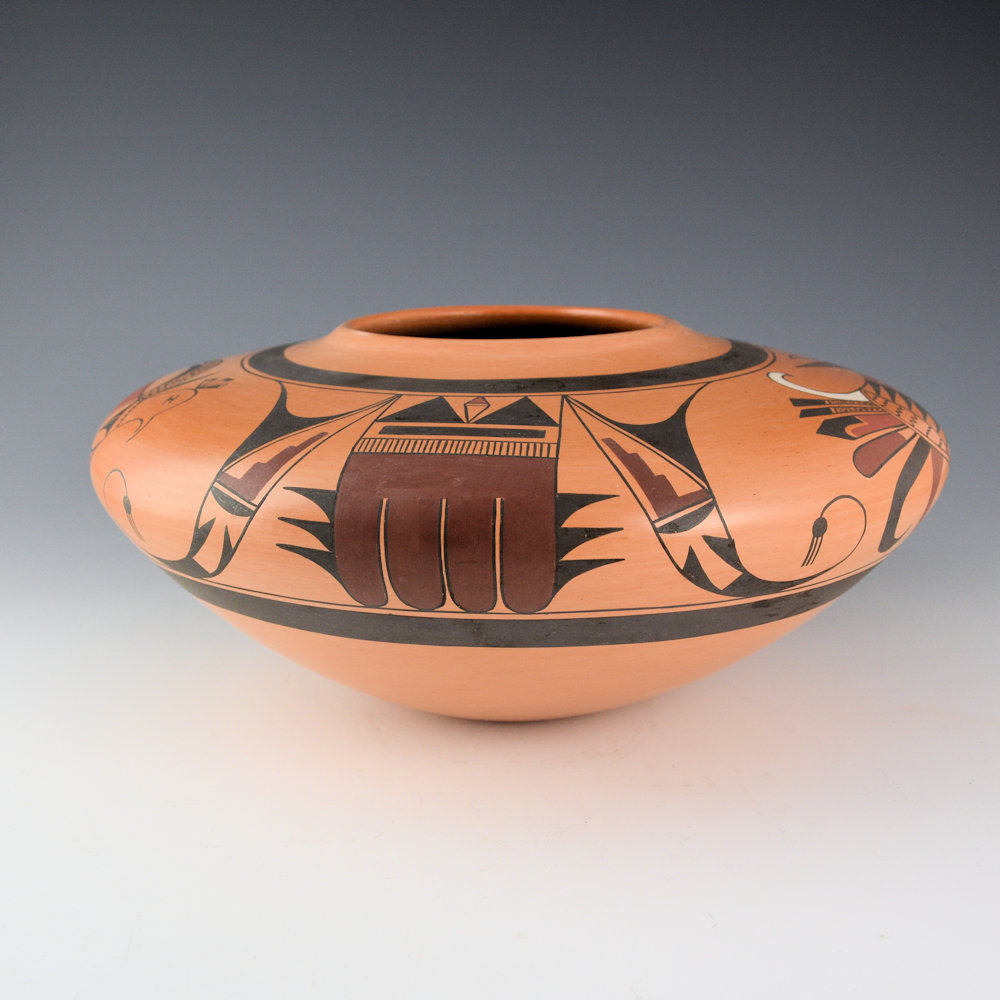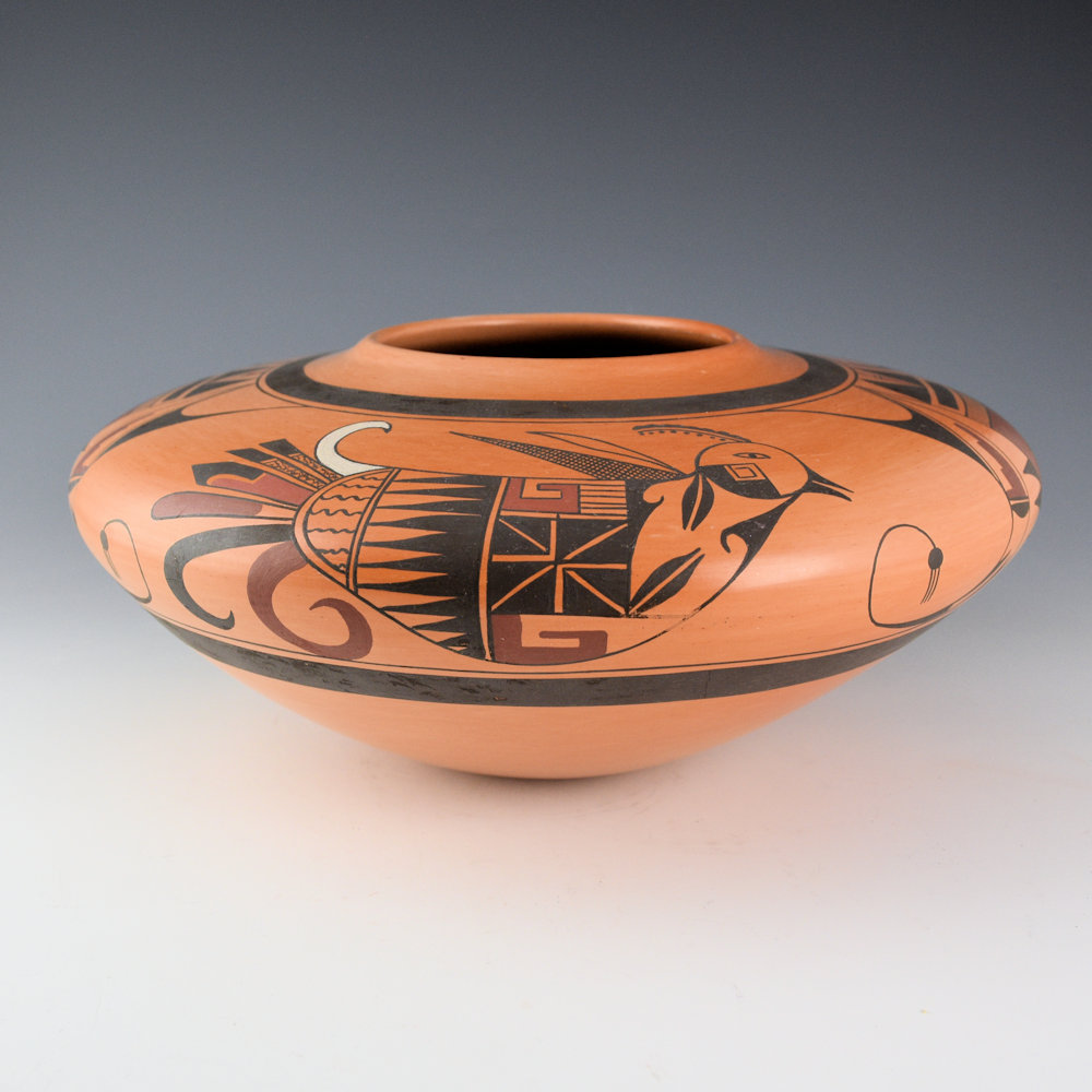 This is a late piece by Mark Tahbo. He learned to make pottery from his great-grandmother, Grace Chapella. His pieces reflect the remarkable symmetry and thin walls of an excellent potter. This jar is is an elegant shape with a wide shoulder and a tiny neck. The jar is painted with bee-weed and various colors of clay slips. One side has a quail, and the other a hummingbird. They are separated by a bird tail design highlighted with a deep burgundy clay. The jar was traditionally fired and it has a beautiful coloration! It is signed on the bottom with, “Mark Tahbo” and a pipe representing that he is Tobacco Clan. It is in excellent condition with no chips, cracks, restoration, or repair.