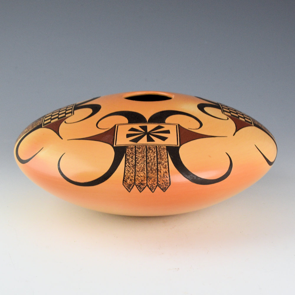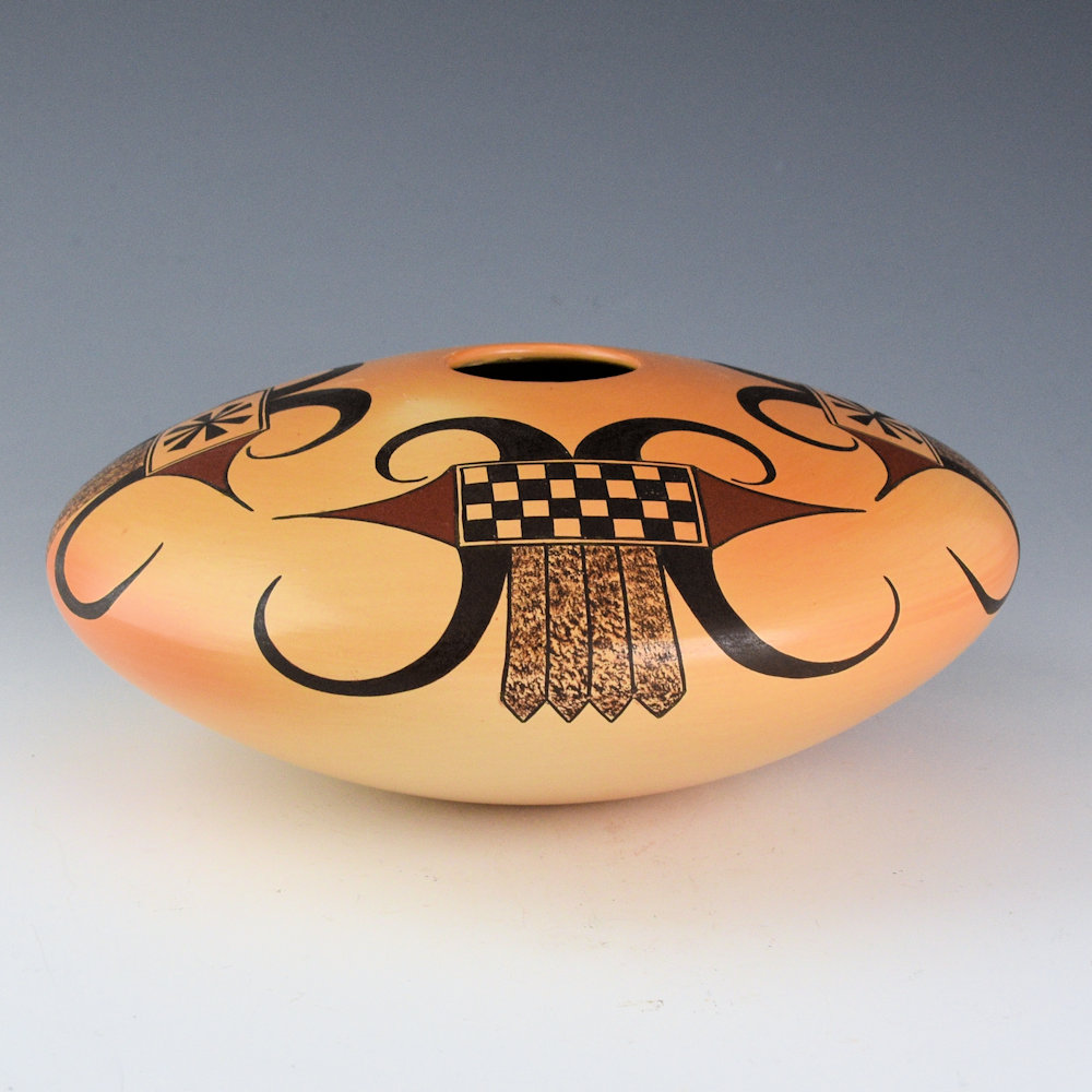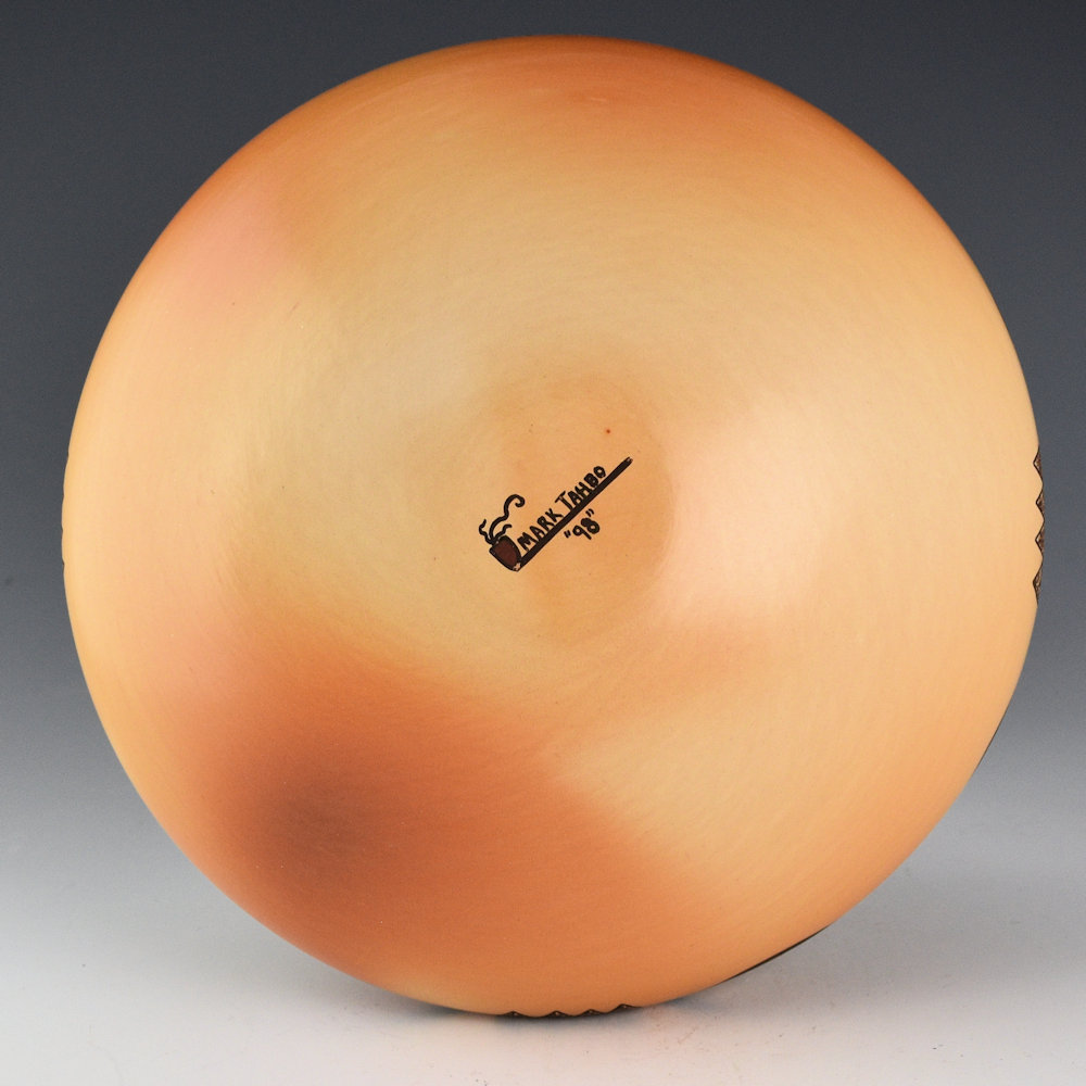 This is a creative wide bowl by Mark Tahbo. He was known not just for his painted pottery but especially for the blushes on his pottery from the firing. This piece is from 1998. It has a wide shoulder and a sloping top. The bowl is fully polished and painted with bee-weed and highlighted with a deep red clay. The top has four eagle tails as the design. Two have a checkerboard back and two have stars. There is a striking precision to the top of the bowl. It was traditionally fired with strong color variations. It is signed on the bottom “Mark Tahbo”. It is in excellent condition with no chips, cracks, restoration, or repair.